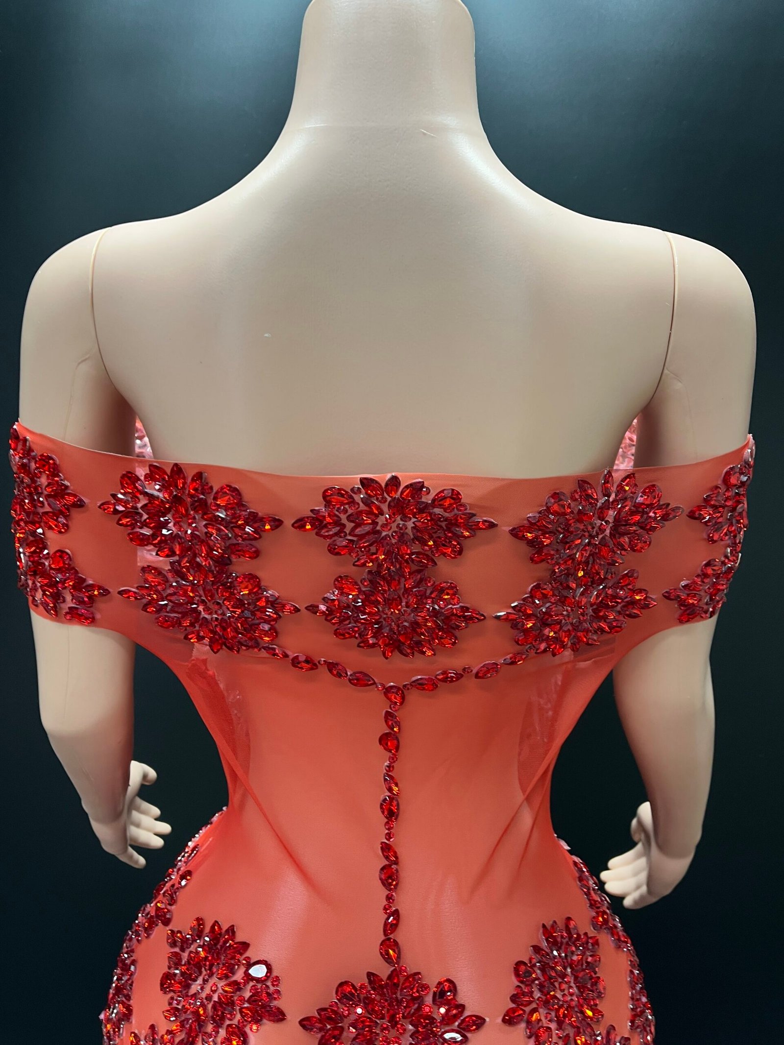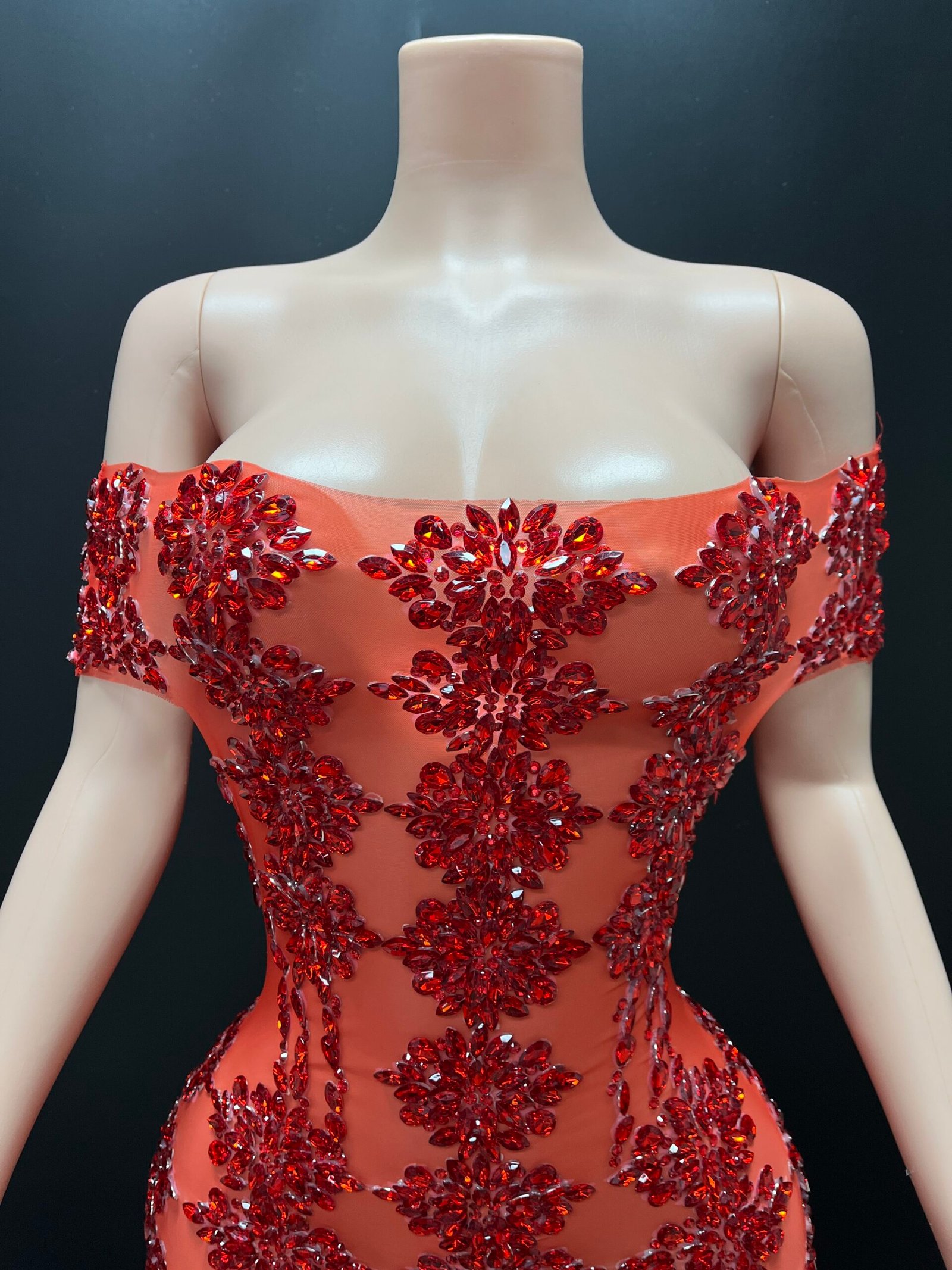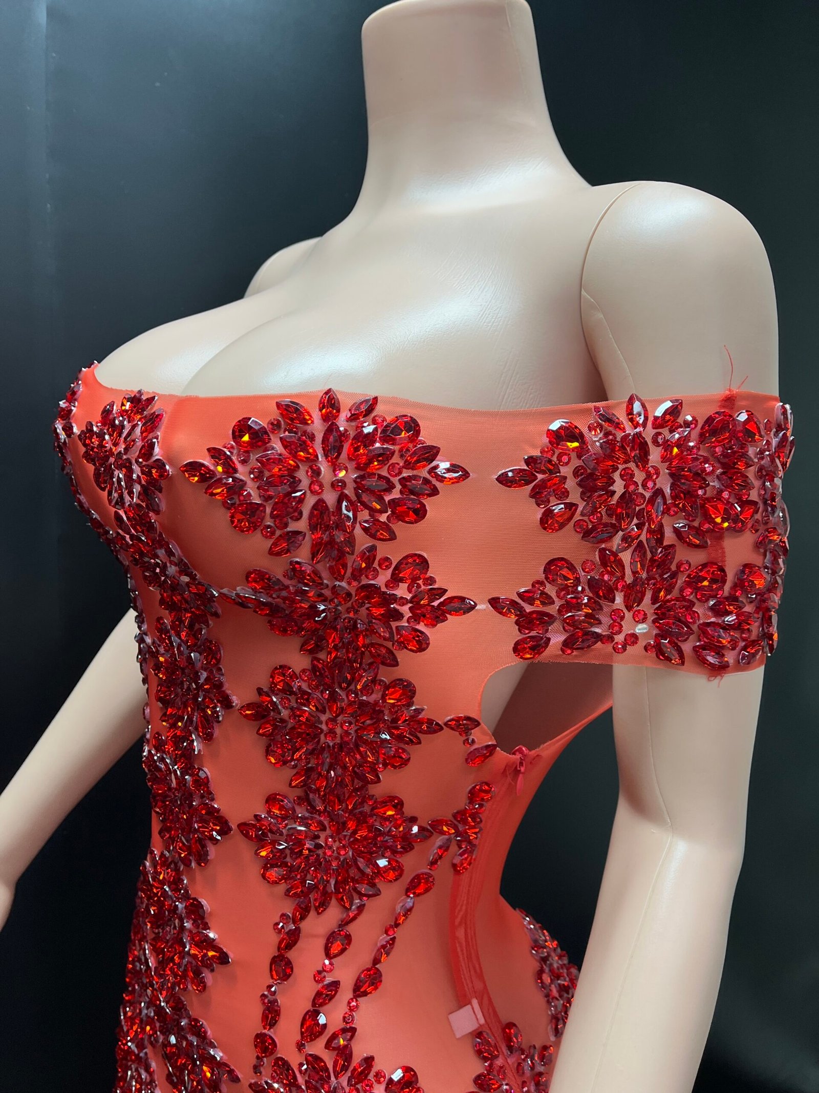 The Zuri Temptation Gown is the definition of sculpted elegance and irresistible allure. Designed to celebrate the feminine silhouette, this off-shoulder illusion gown features intricate hand-placed embellishments arranged in a striking pattern that contours the body beautifully. The sheer mesh base creates a seamless “second-skin” effect, while the detailed beadwork delivers luxury sparkle from every angle.