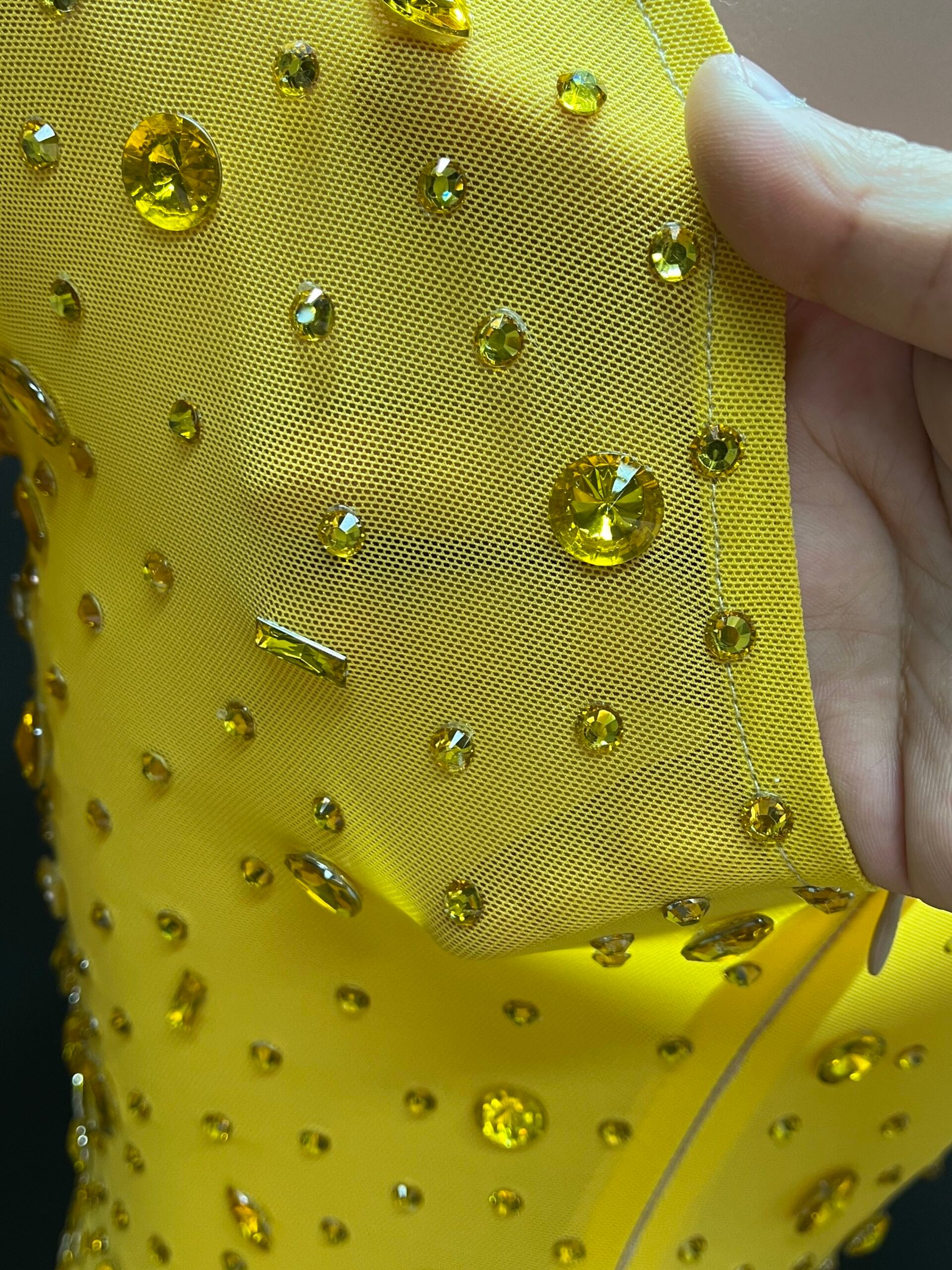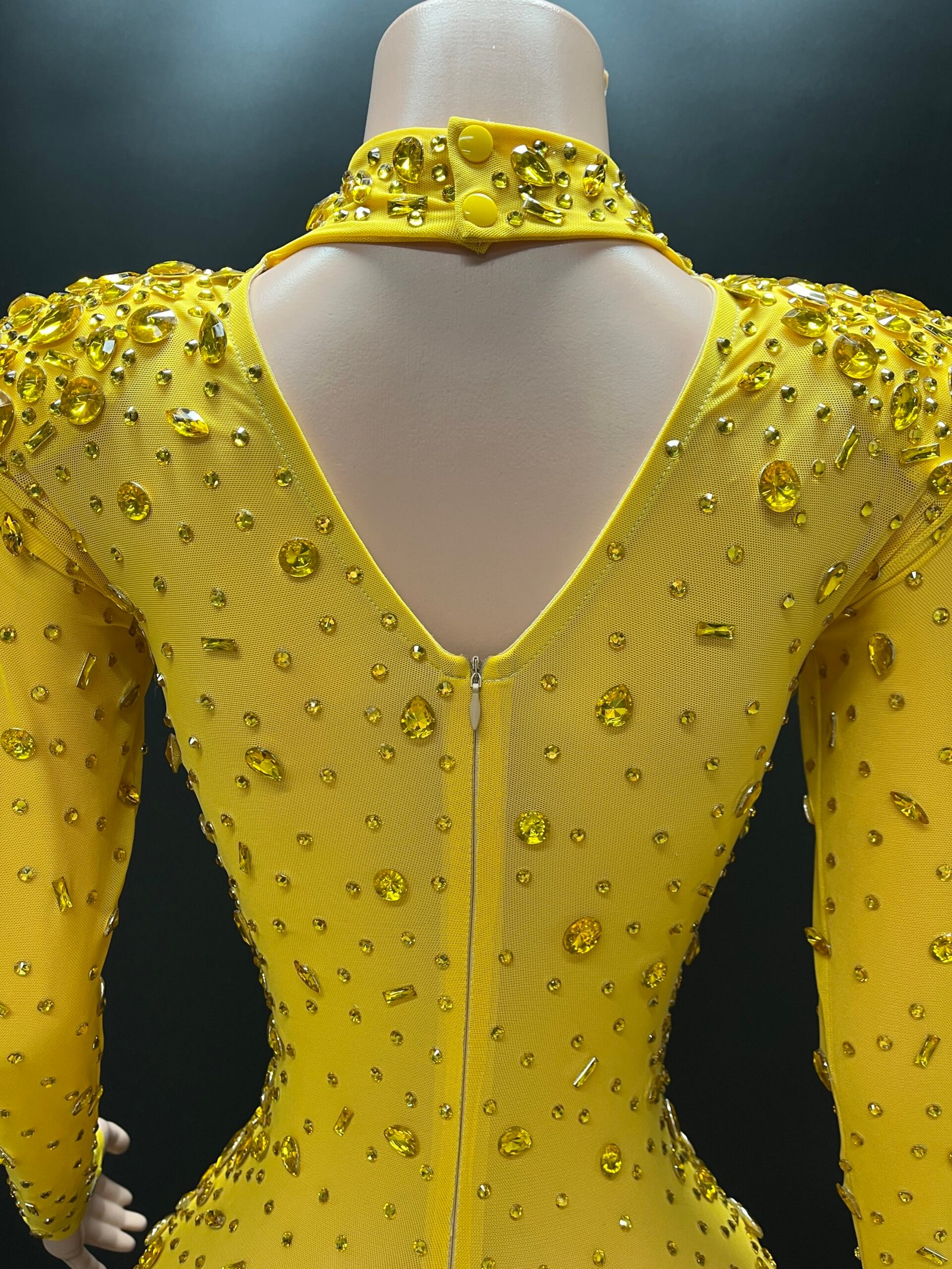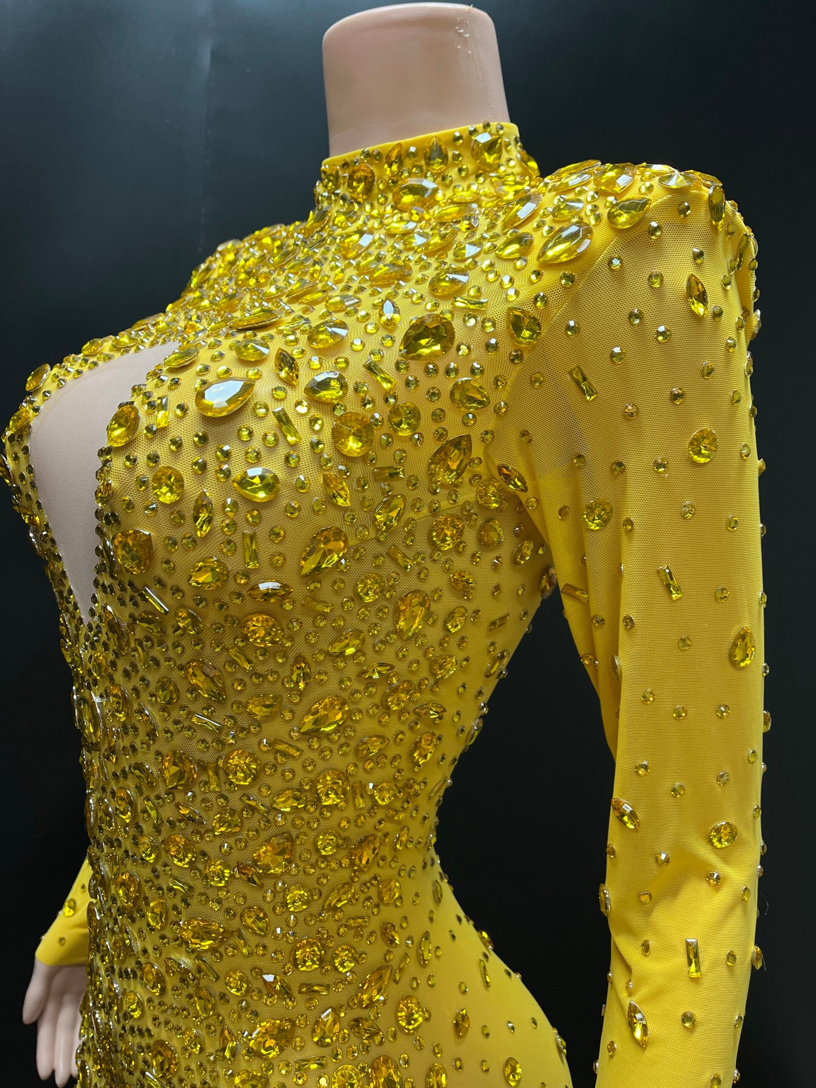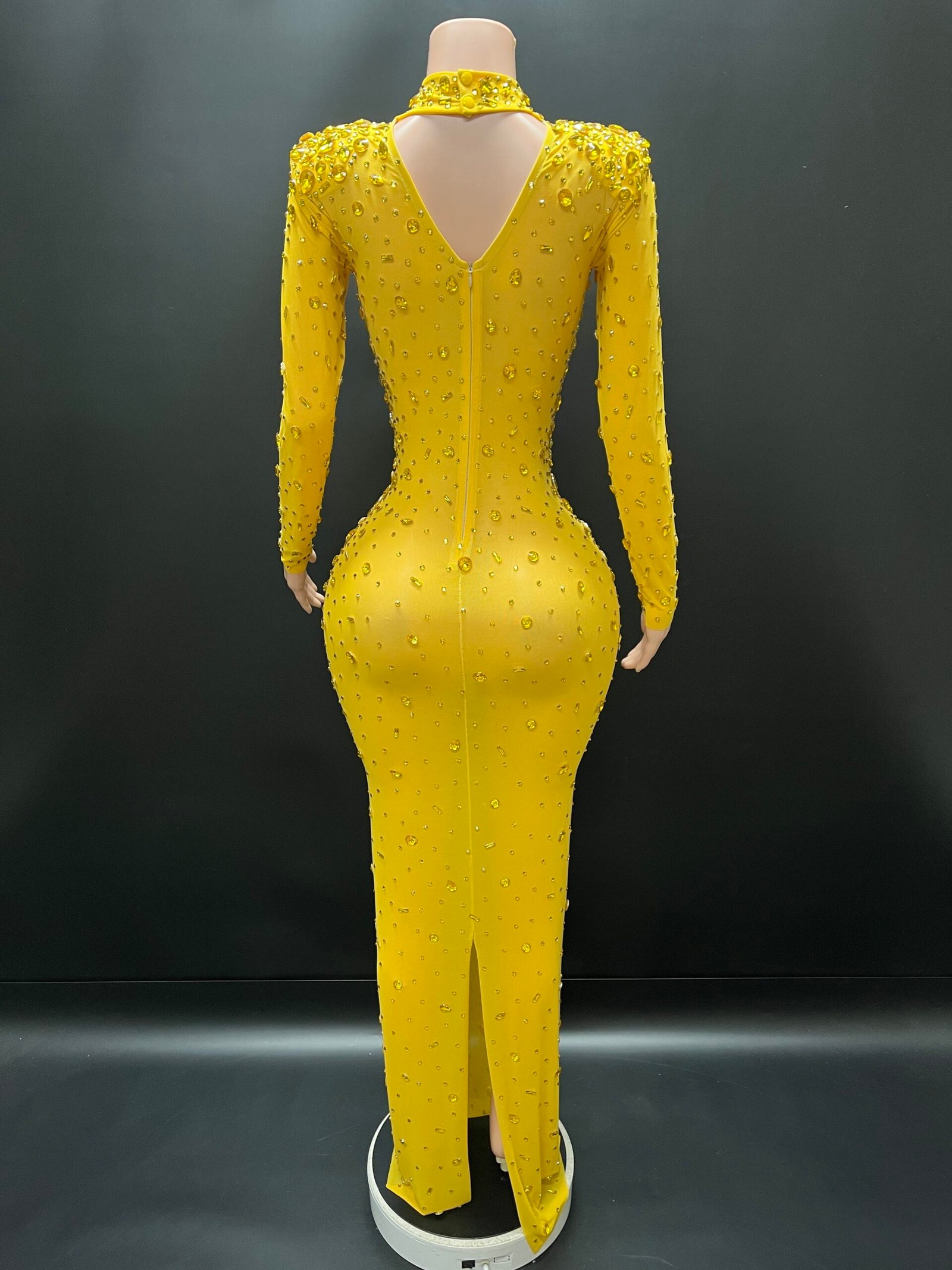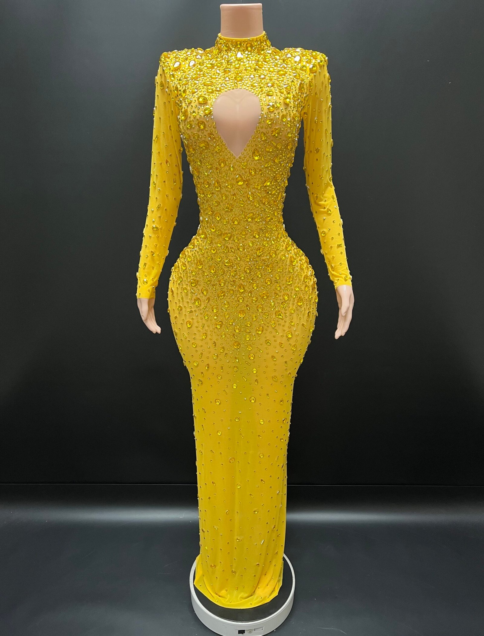 The Arielle Dress is the definition of modern luxury and elegance. Designed in a radiant gold tone, this figure-hugging gown features a high neckline, long sheer sleeves, and intricate rhinestone embellishments that shimmer beautifully from top to bottom.