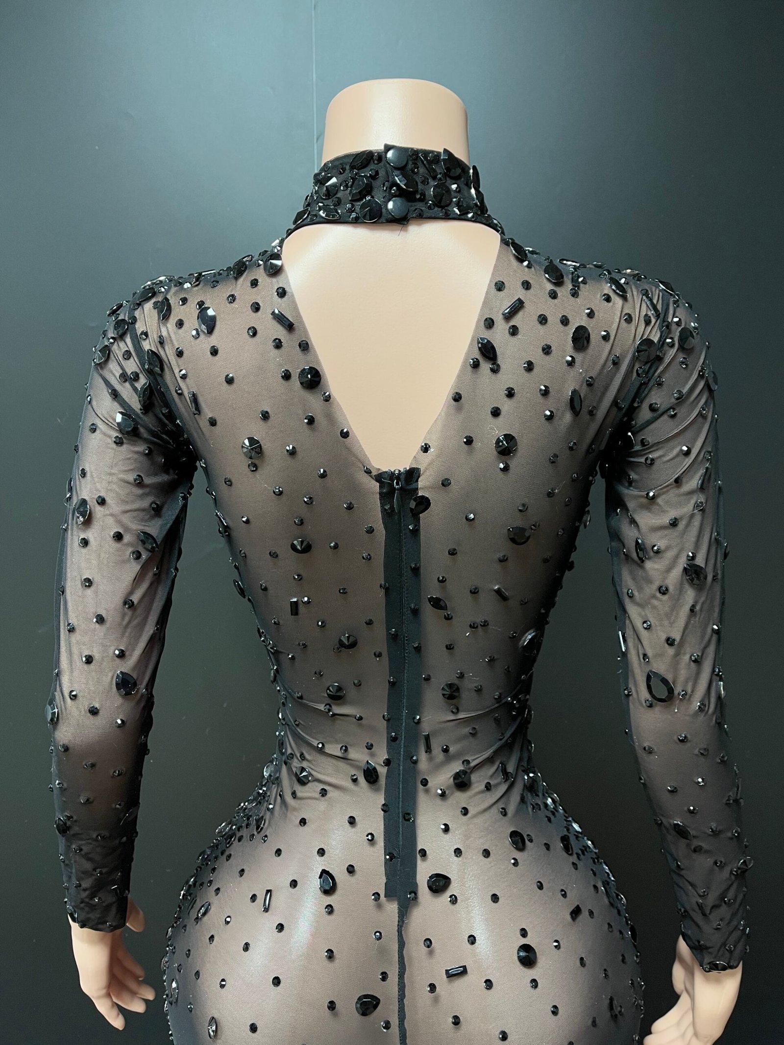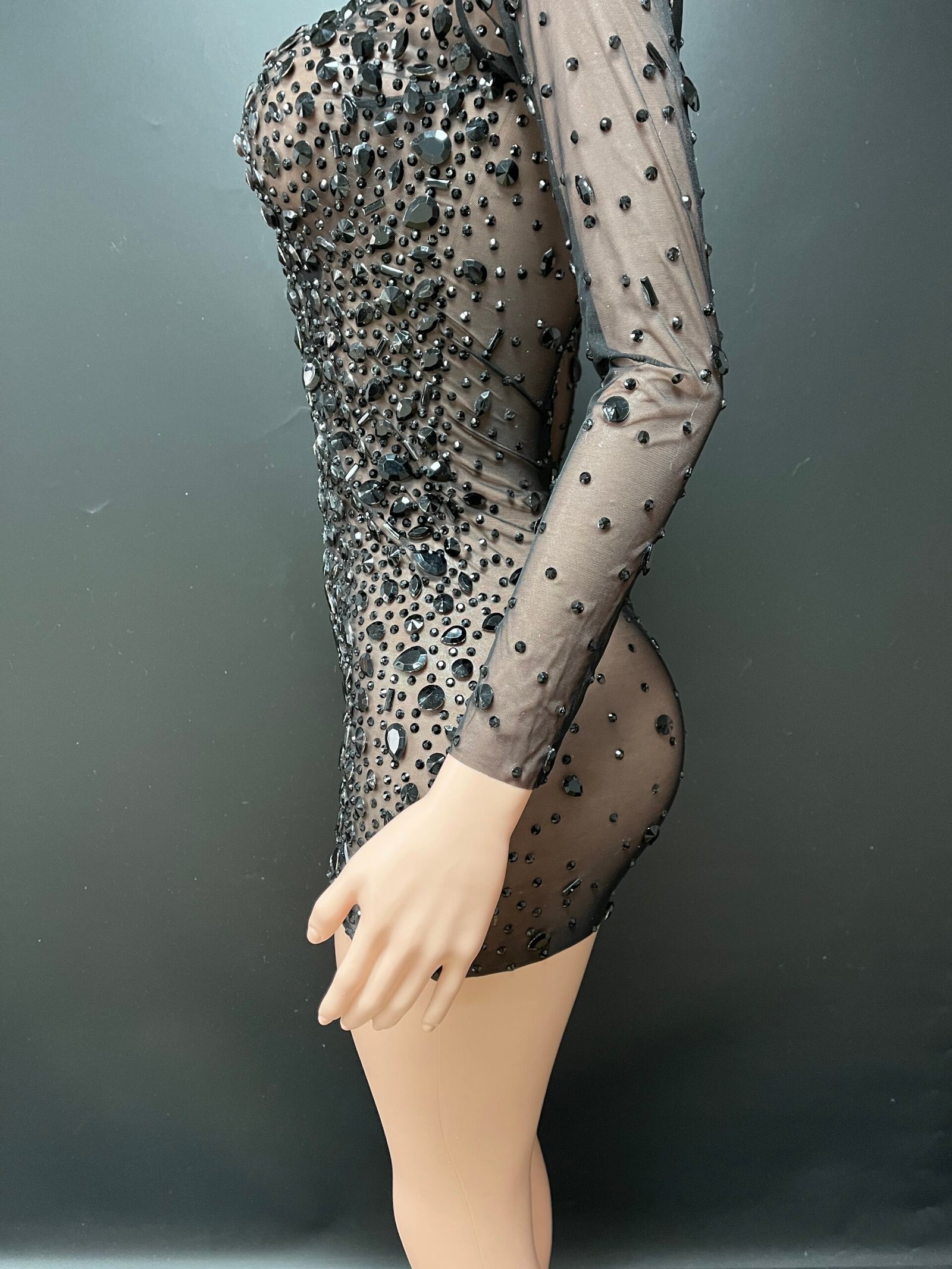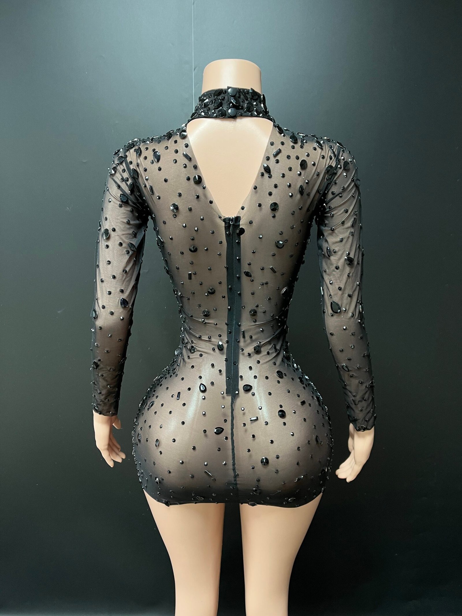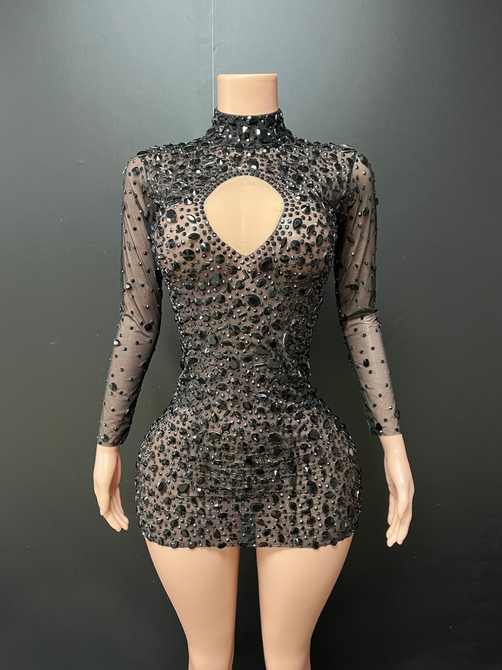 The Aurielle Mini Dress is a striking statement piece designed for confidence and elegance. This fitted mini silhouette features a high neckline, long sleeves, and a bold keyhole cutout detail at the chest. Intricate rhinestone embellishments are carefully placed throughout the dress, creating a shimmering, couture-inspired finish.