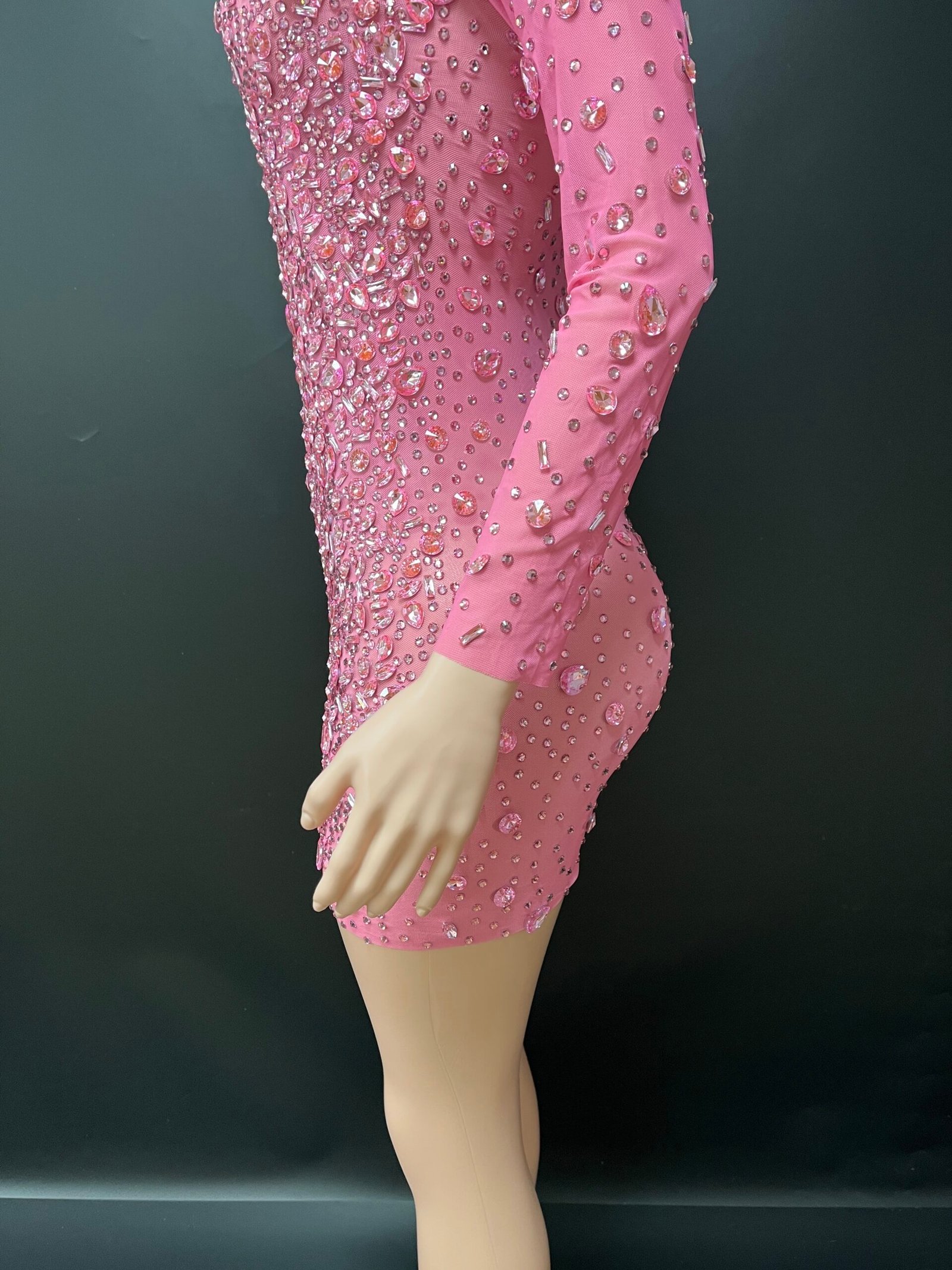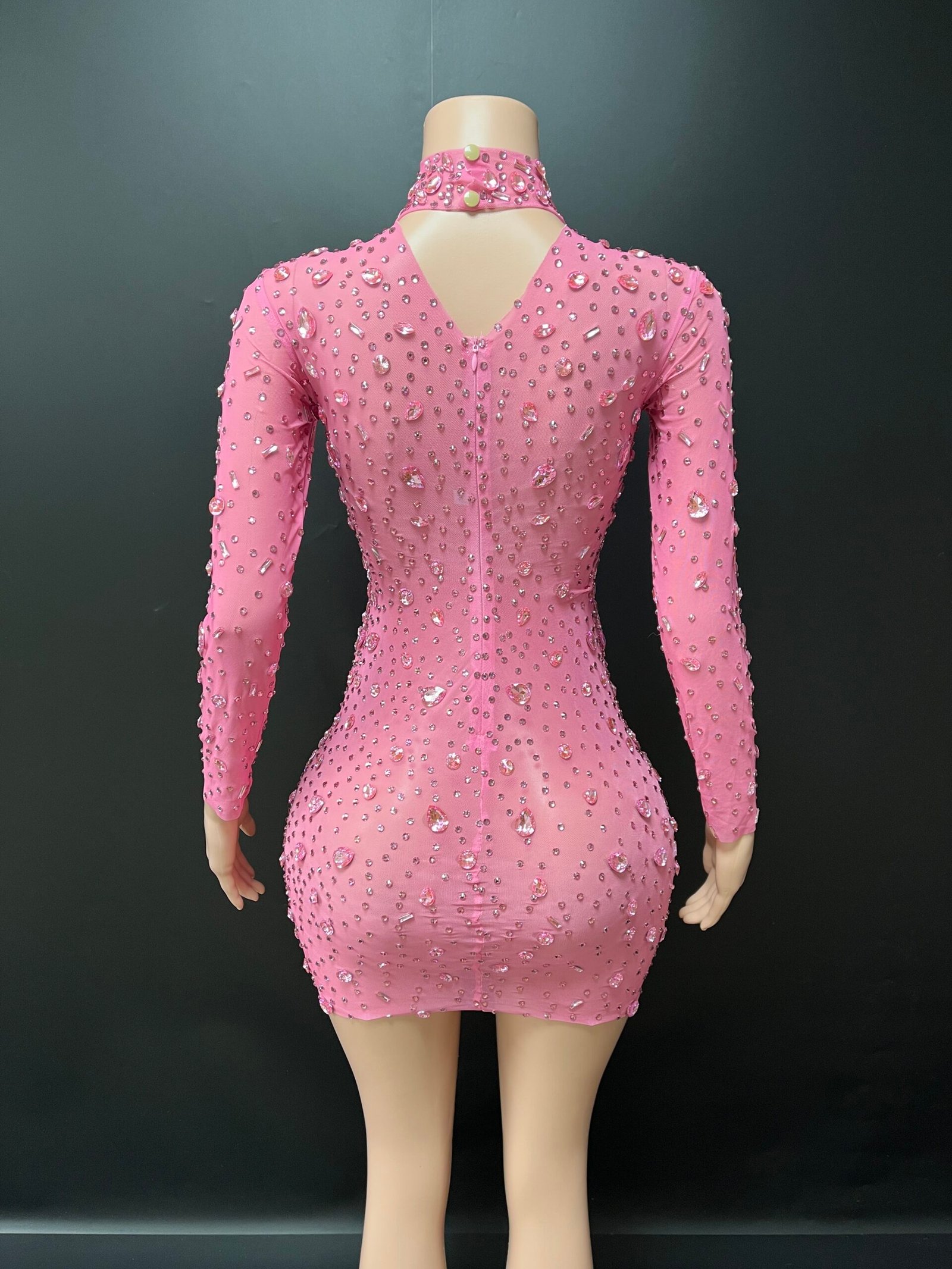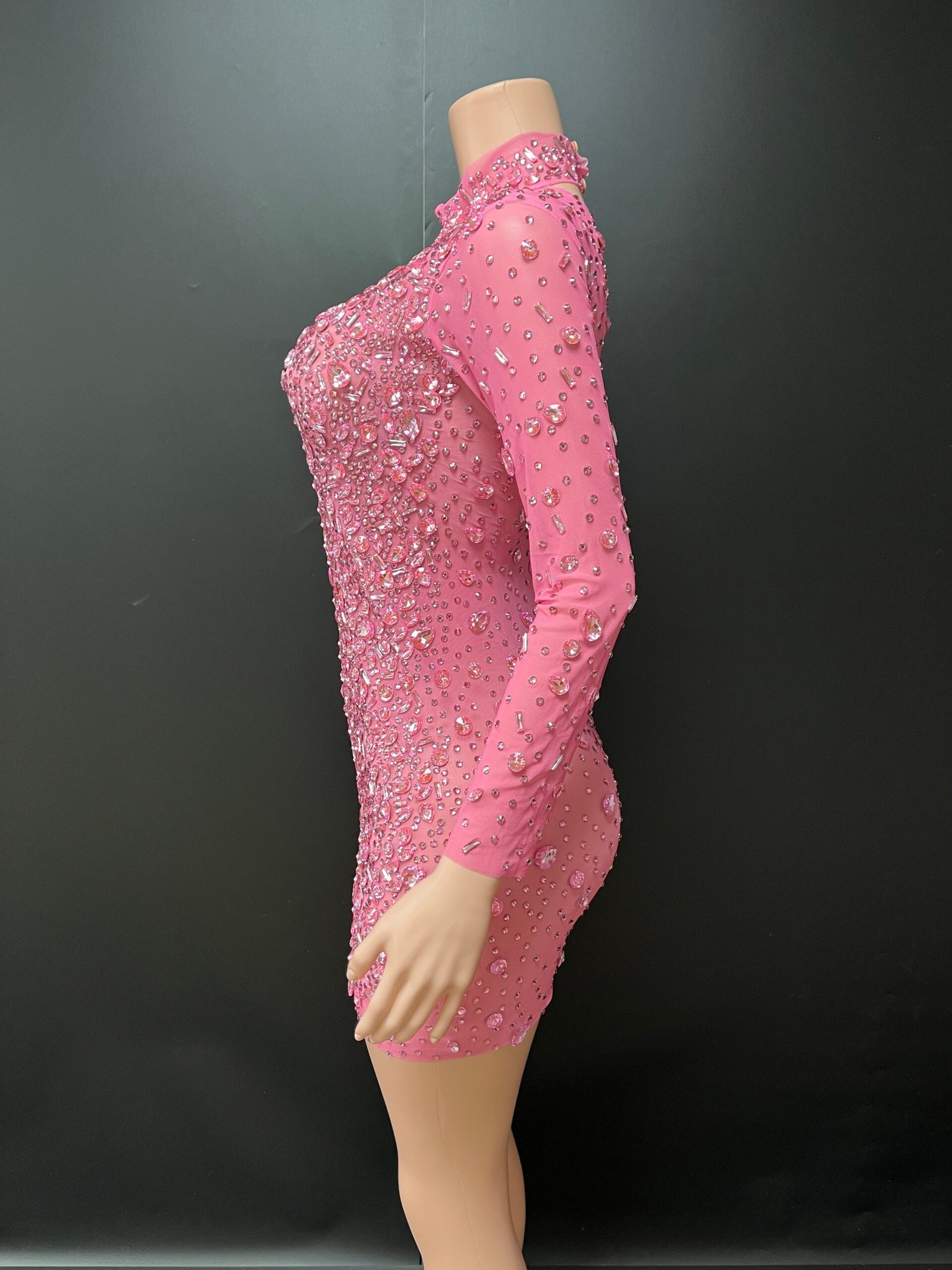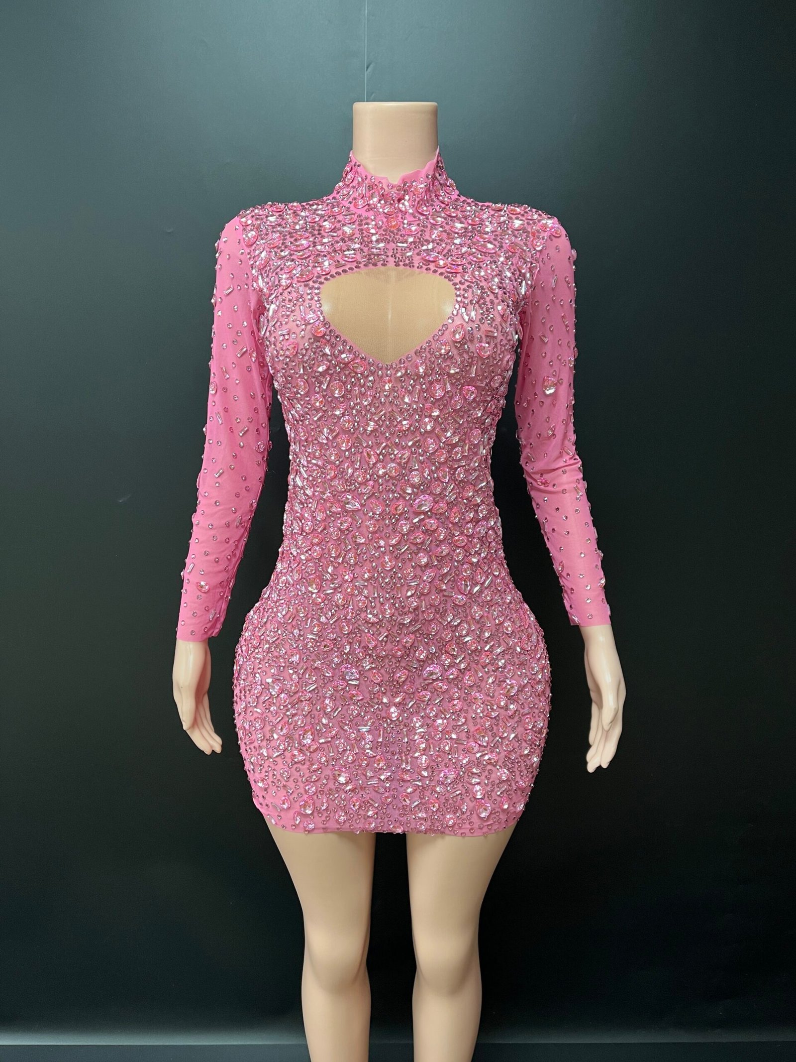 The Aurielle Mini Dress is a striking statement piece designed for confidence and elegance. This fitted mini silhouette features a high neckline, long sleeves, and a bold keyhole cutout detail at the chest. Intricate rhinestone embellishments are carefully placed throughout the dress, creating a shimmering, couture-inspired finish.