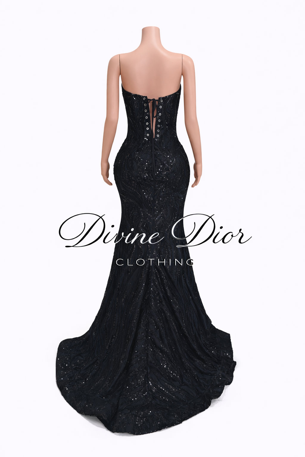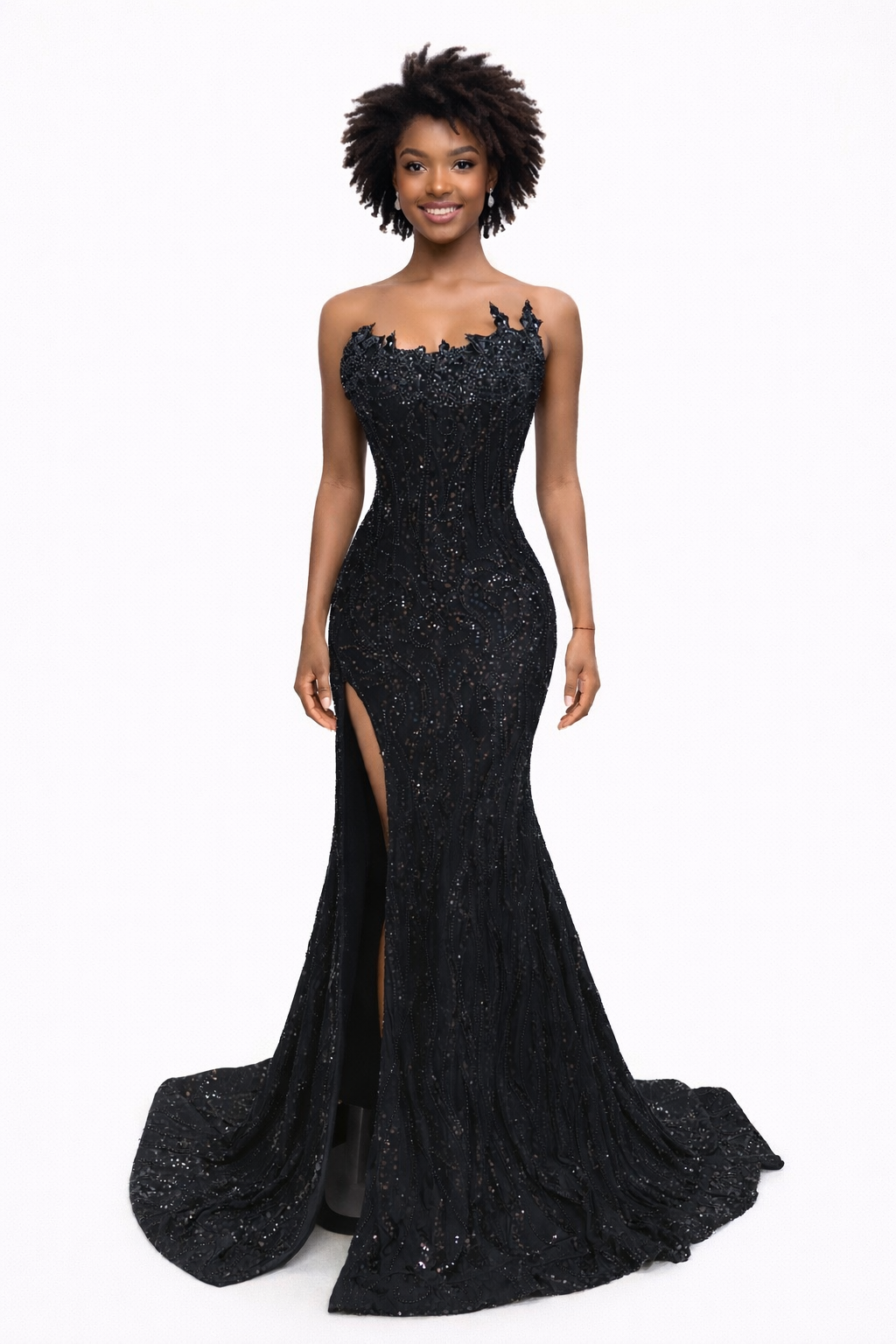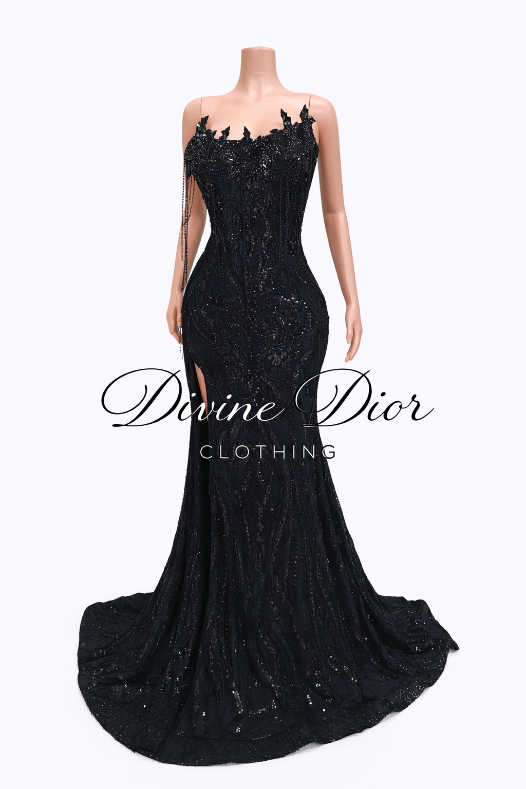 The fitted silhouette hugs your curves before flowing into a dramatic mermaid train, creating a red-carpet-worthy finish. A sultry thigh-high slit adds the perfect touch of elegance and confidence, making this gown unforgettable from every angle.