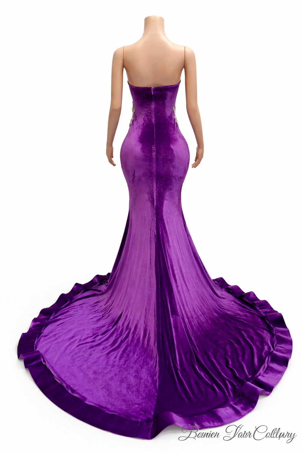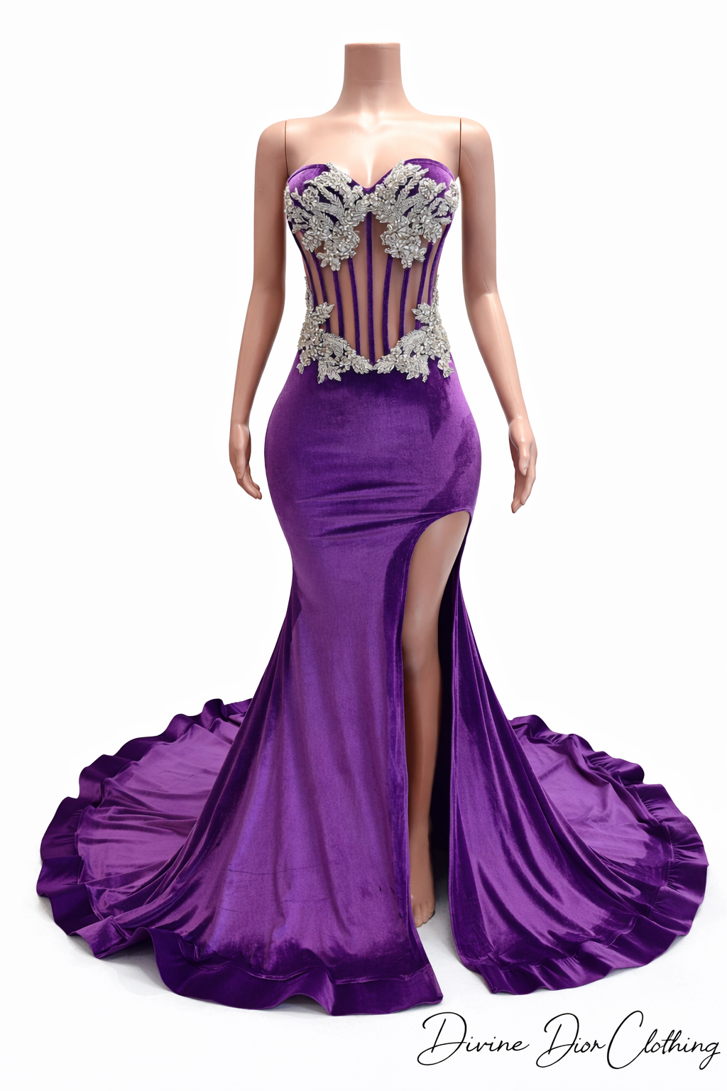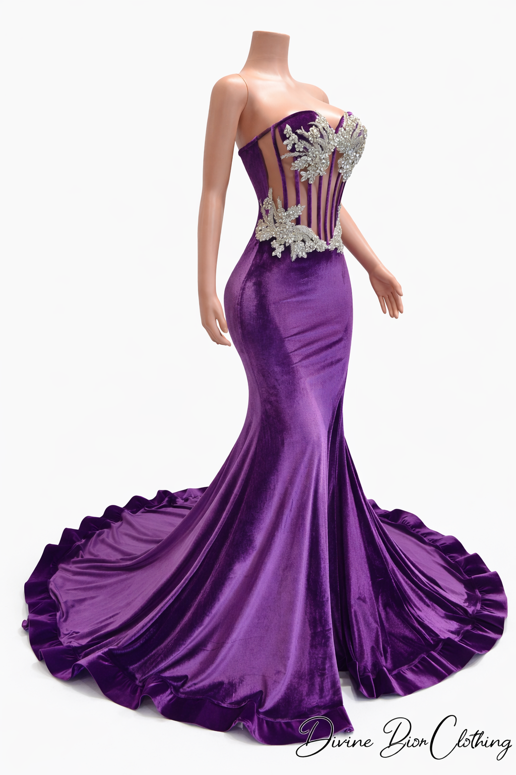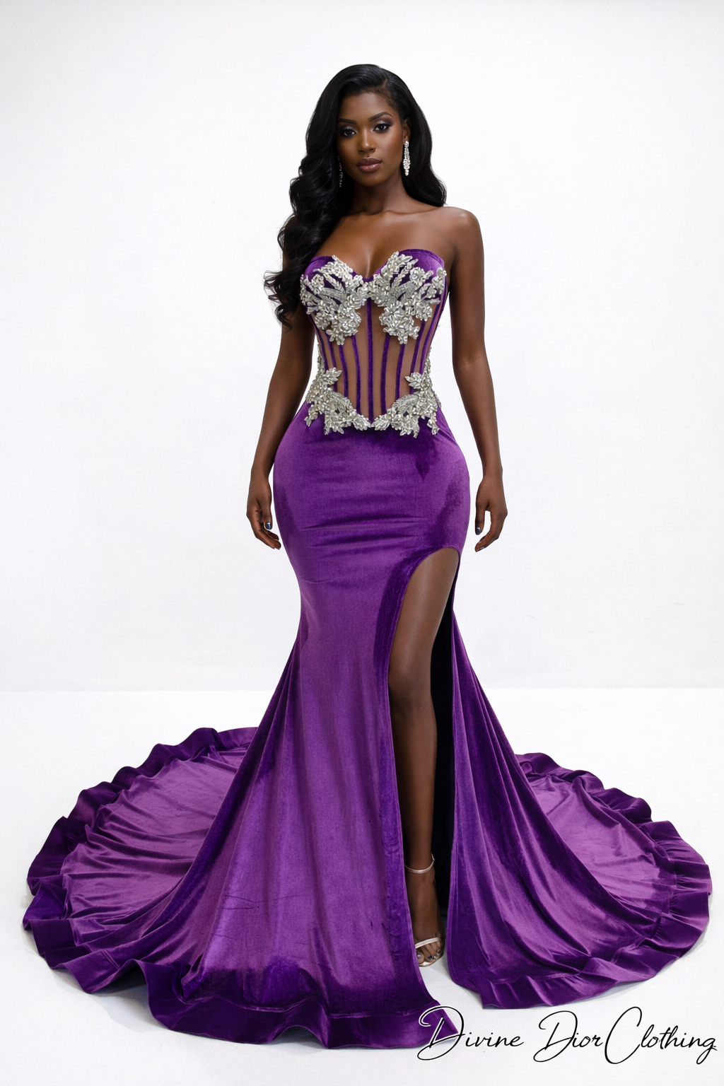 Crafted in rich, high-shine velvet, this gown features a sculpted mermaid silhouette that hugs your curves before flowing into a dramatic, floor-sweeping train. The structured corset bodice is designed with sheer illusion paneling and detailed vertical boning for a snatched, contoured fit. Hand-placed silver crystal appliqués cascade across the bust and waist, adding dimension, sparkle, and couture elegance.