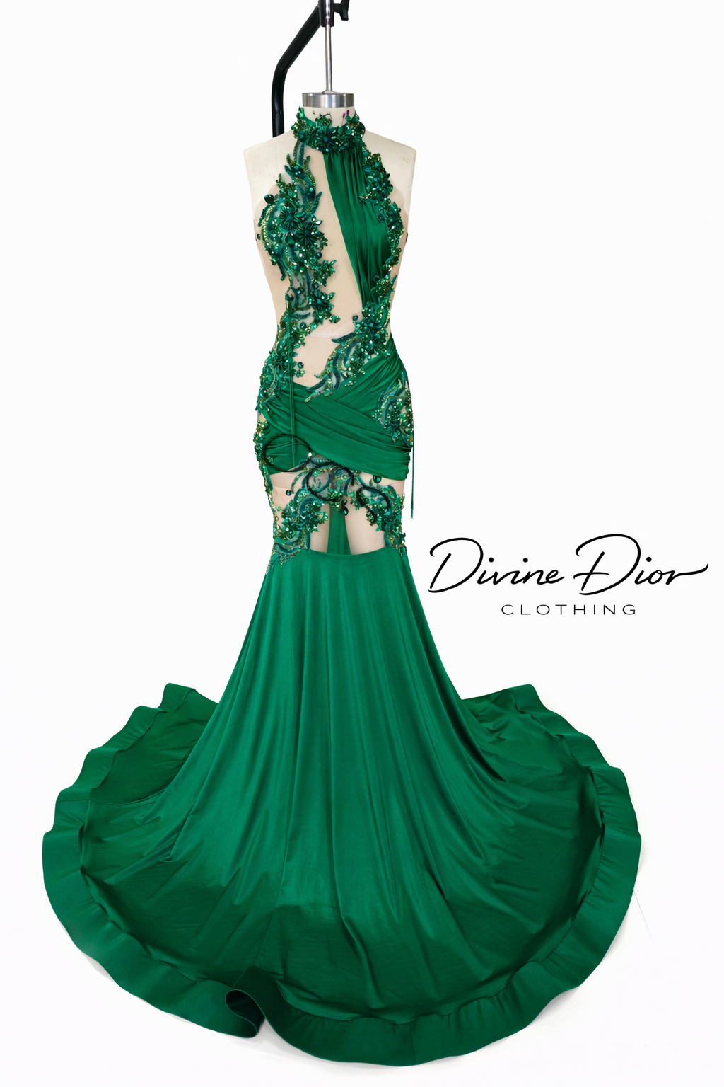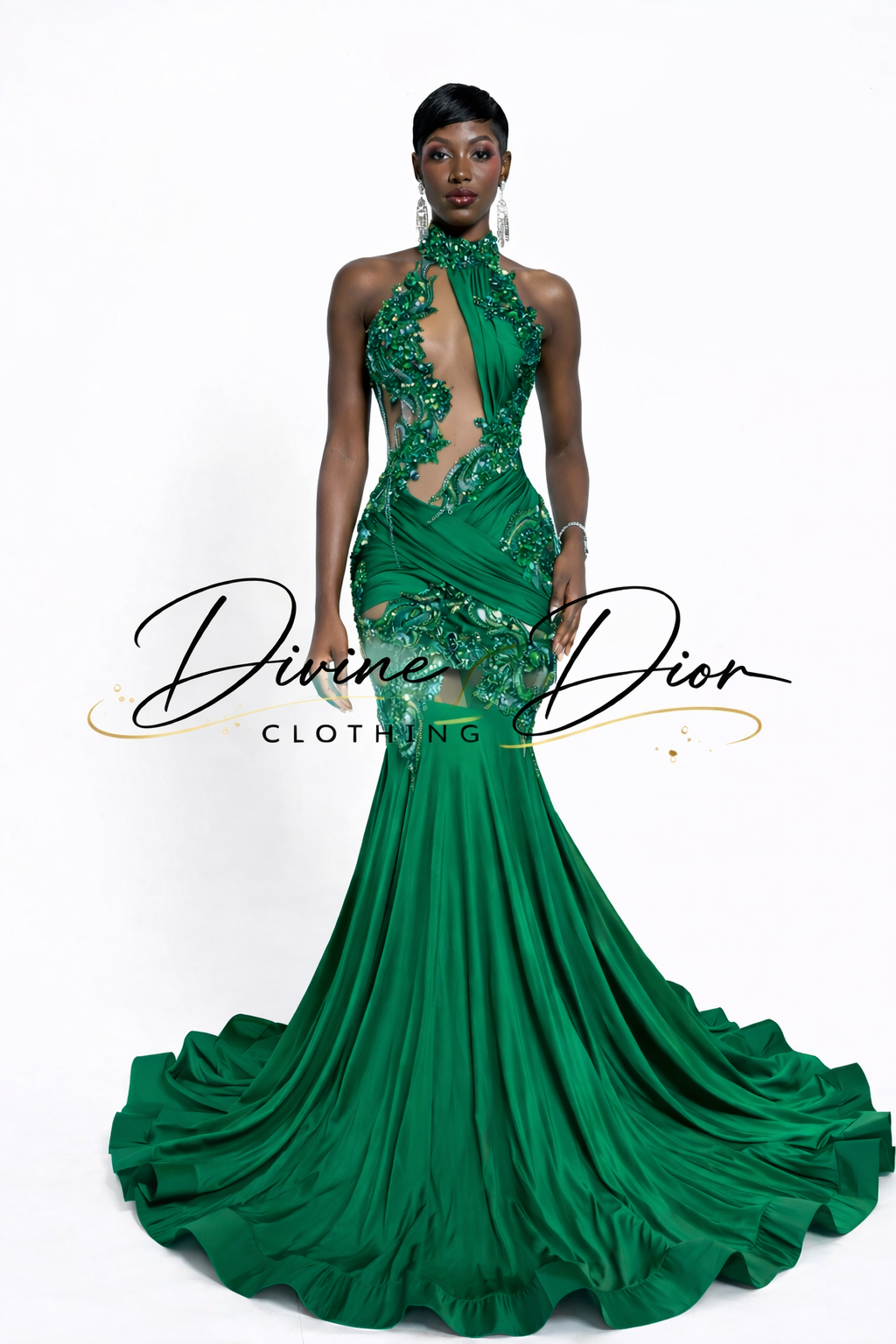 This couture-inspired gown features a sculpted halter neckline with an illusion bodice that blends sheer elegance and intricate hand-applied embellishments. Ornate embroidery and dimensional detailing cascade across the silhouette, creating a striking, artistic design that highlights every curve. The waist is delicately wrapped with soft draping that enhances the hourglass shape, while the fitted mermaid skirt flows into a dramatic flared train for unforgettable movement.