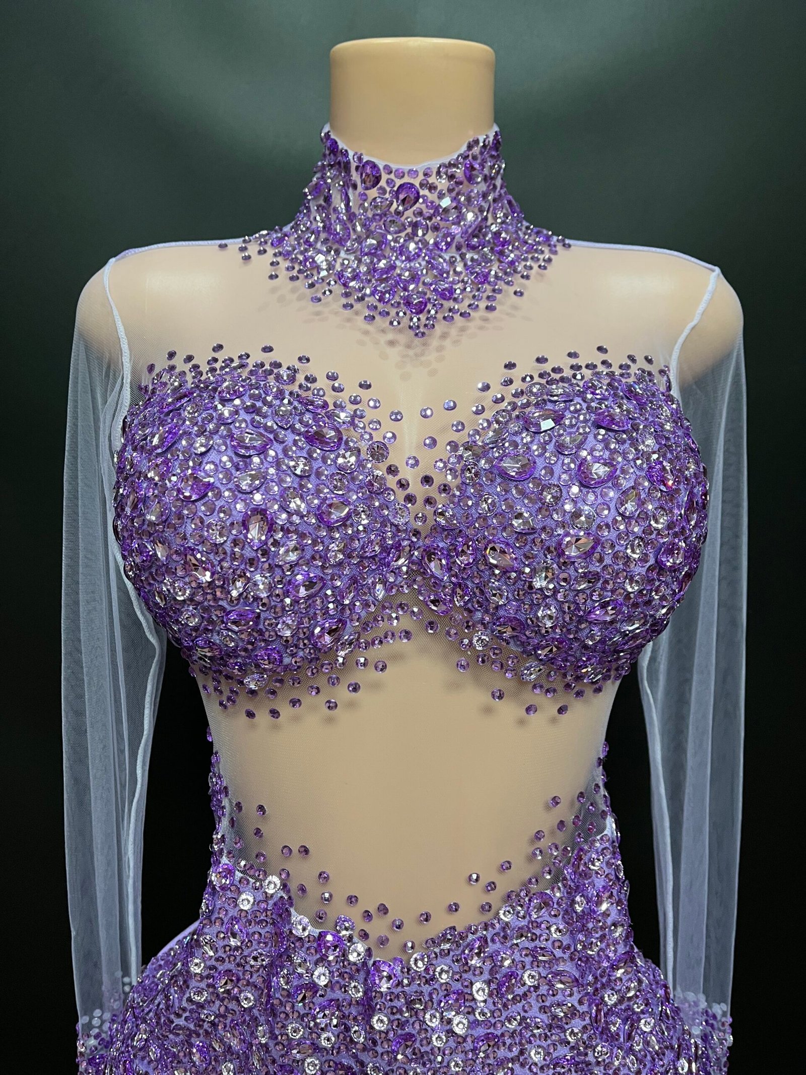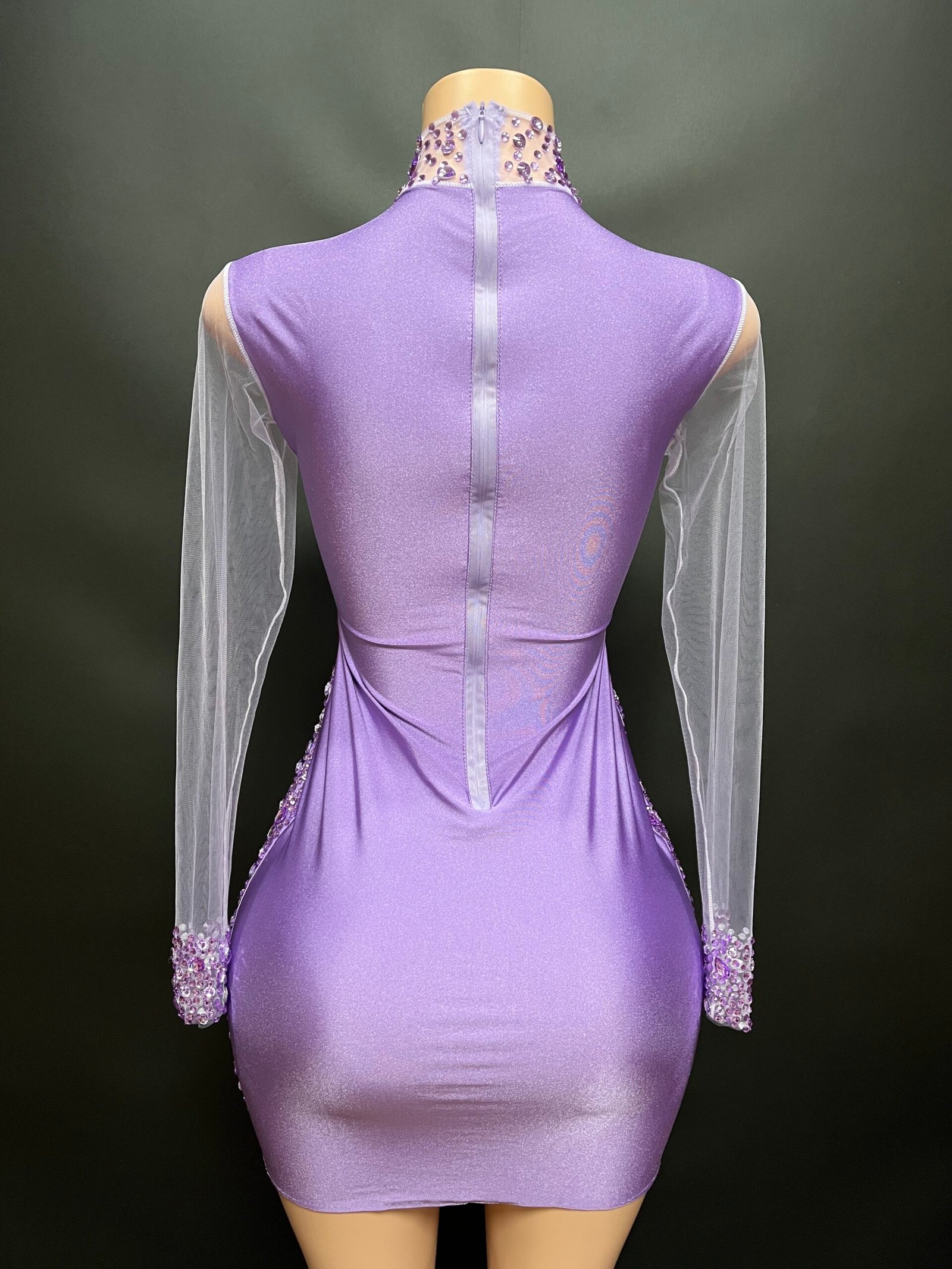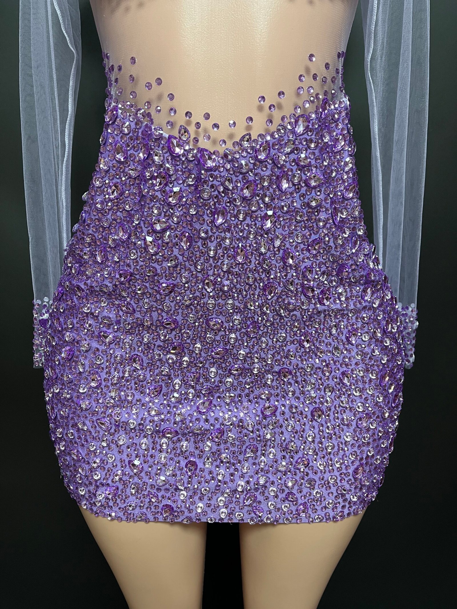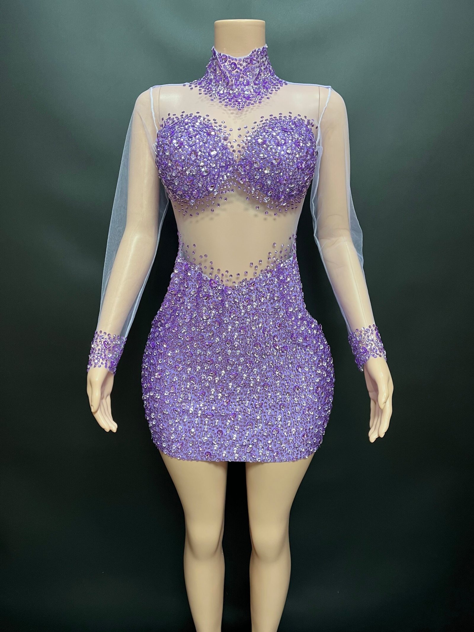 The Cora Dress is the definition of bold elegance and statement glamour. Designed to captivate from every angle, this dazzling mini dress features intricate hand-placed crystal embellishments that shimmer beautifully under the light. The sheer illusion bodice creates a sculpted silhouette, while the high neckline and long mesh sleeves add a sophisticated, couture-inspired finish.
