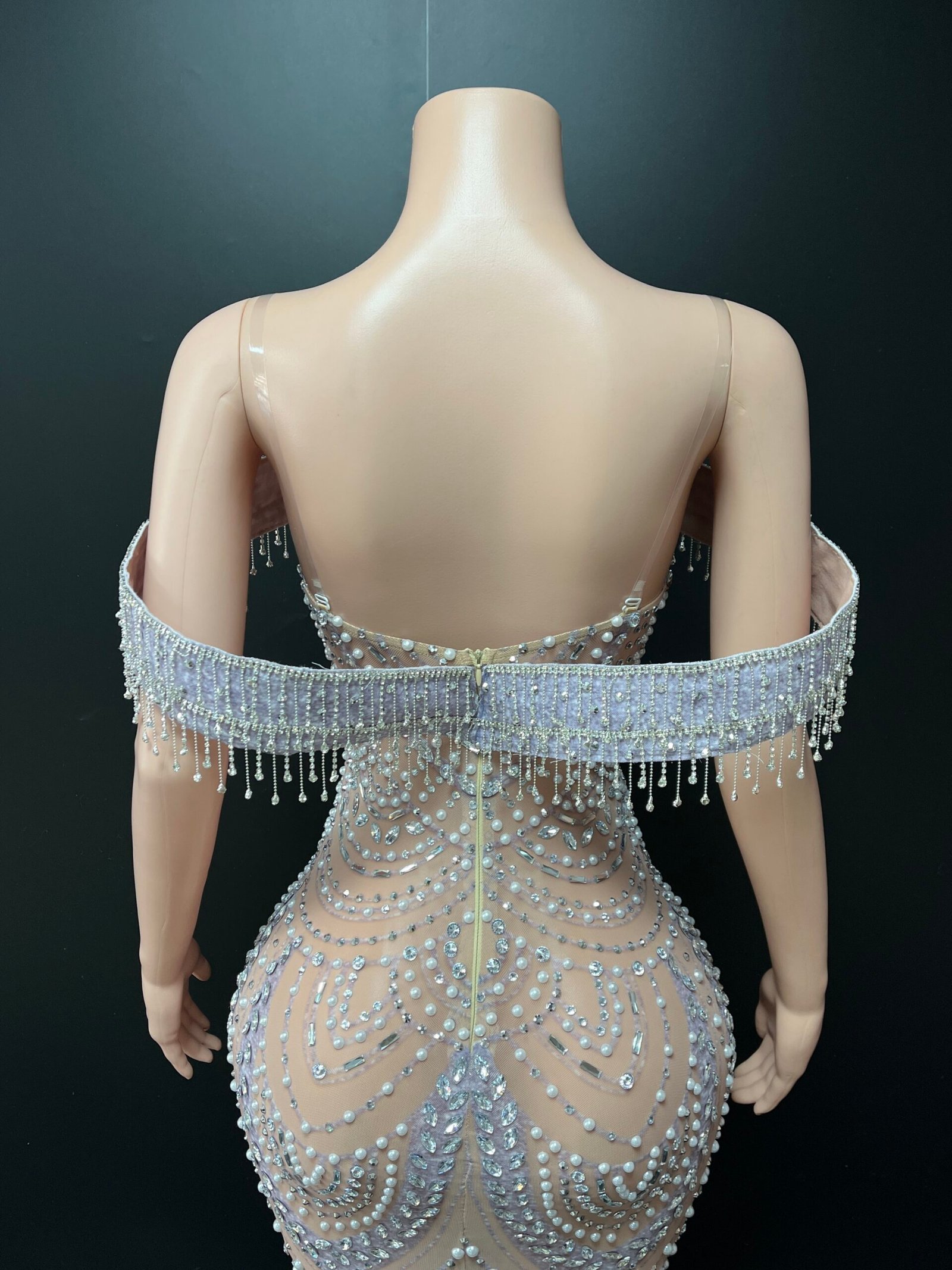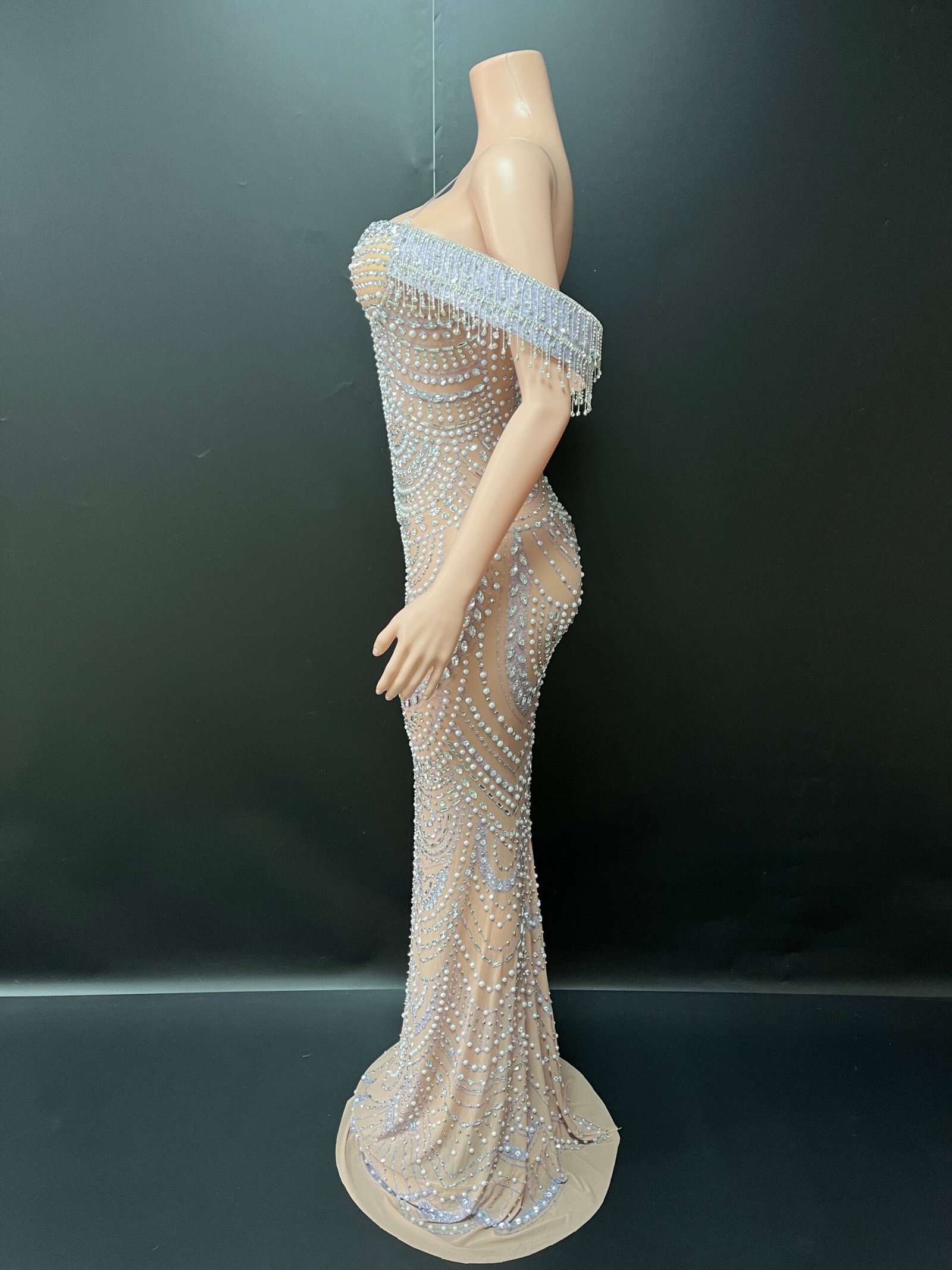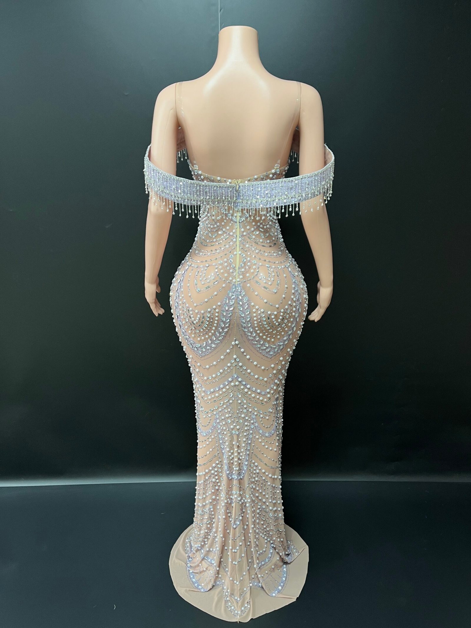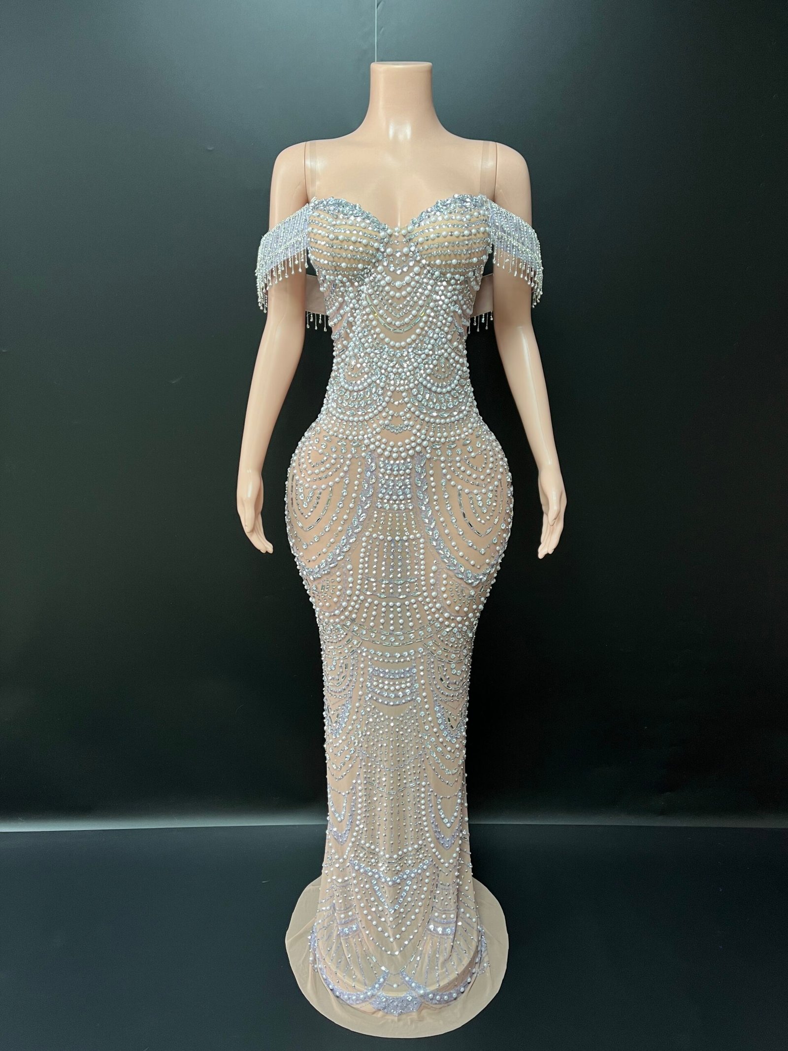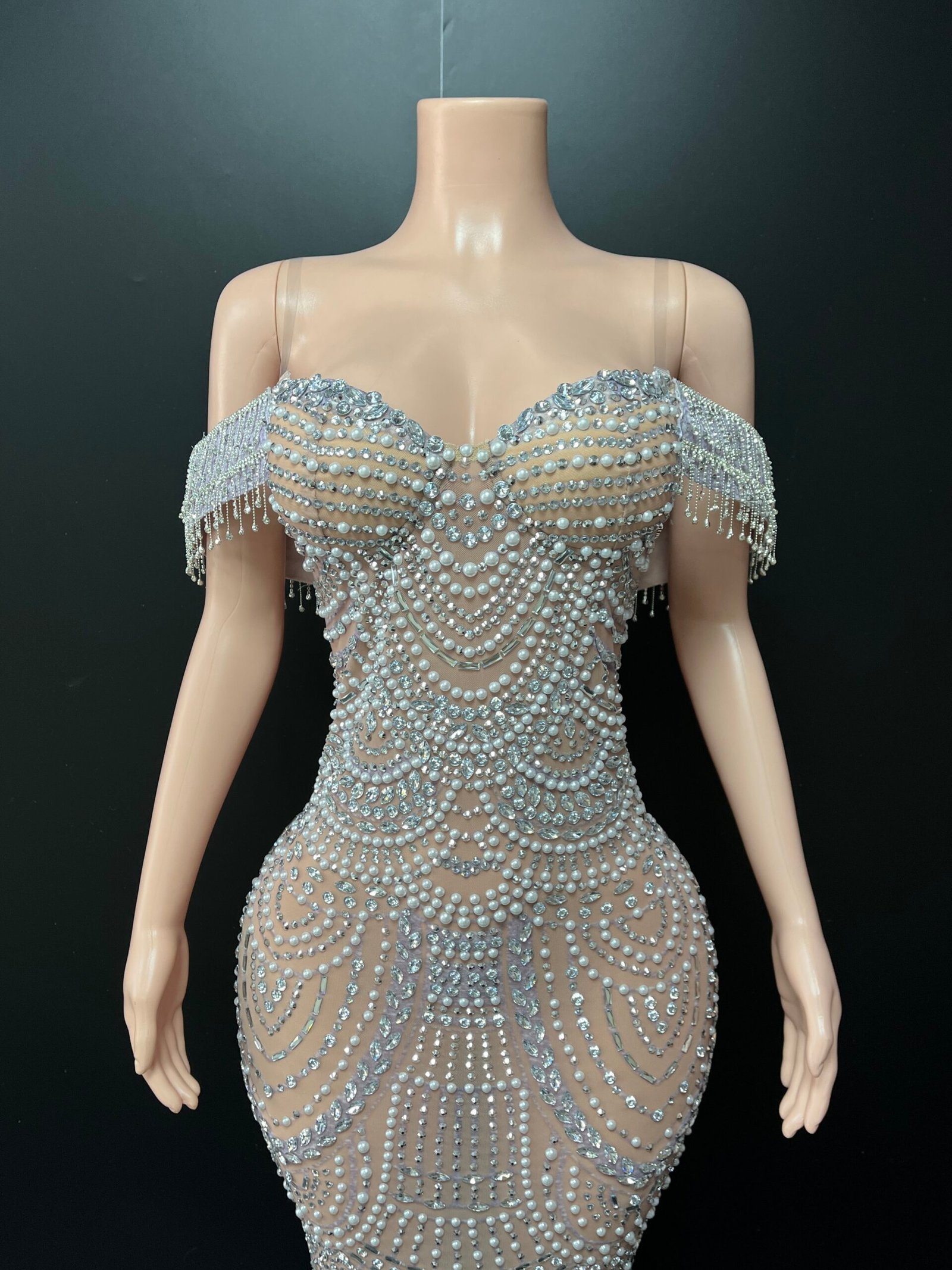 The off-shoulder neckline with delicate pearl fringe detailing adds a soft yet commanding presence, while the curve-contouring fit creates a flawless, statuesque finish. Each pearl is thoughtfully placed to create dimension, texture, and luminous movement with every step.