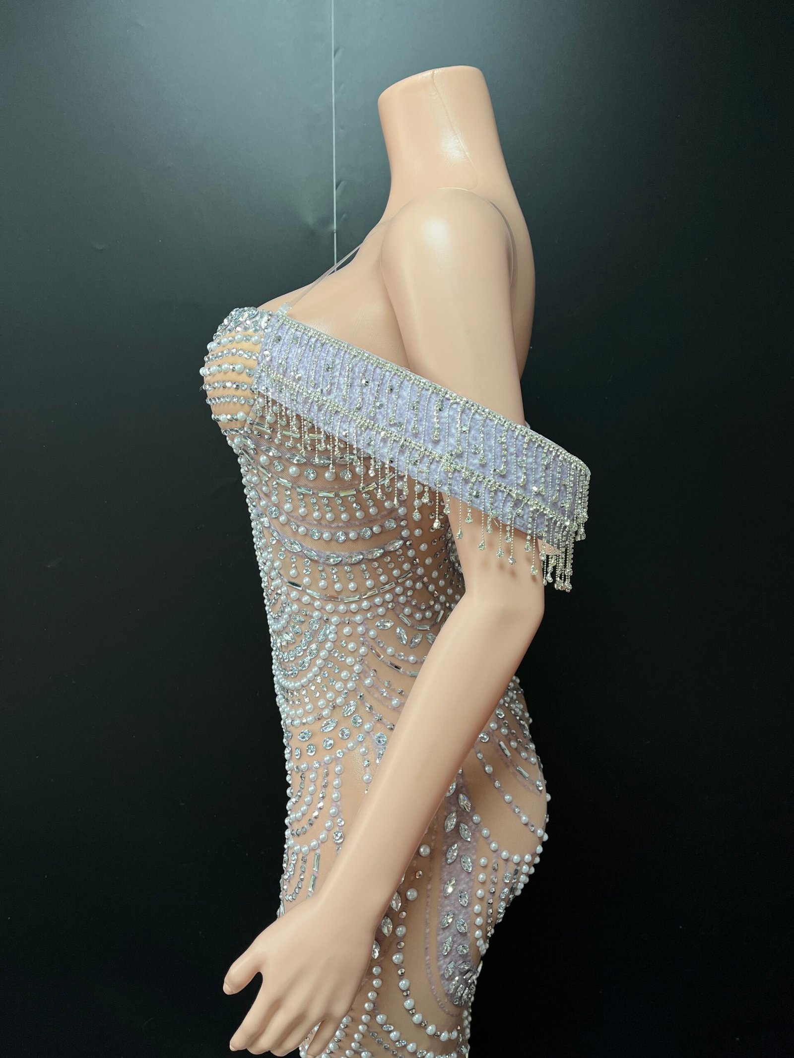 • Off-shoulder design with pearl fringe detail