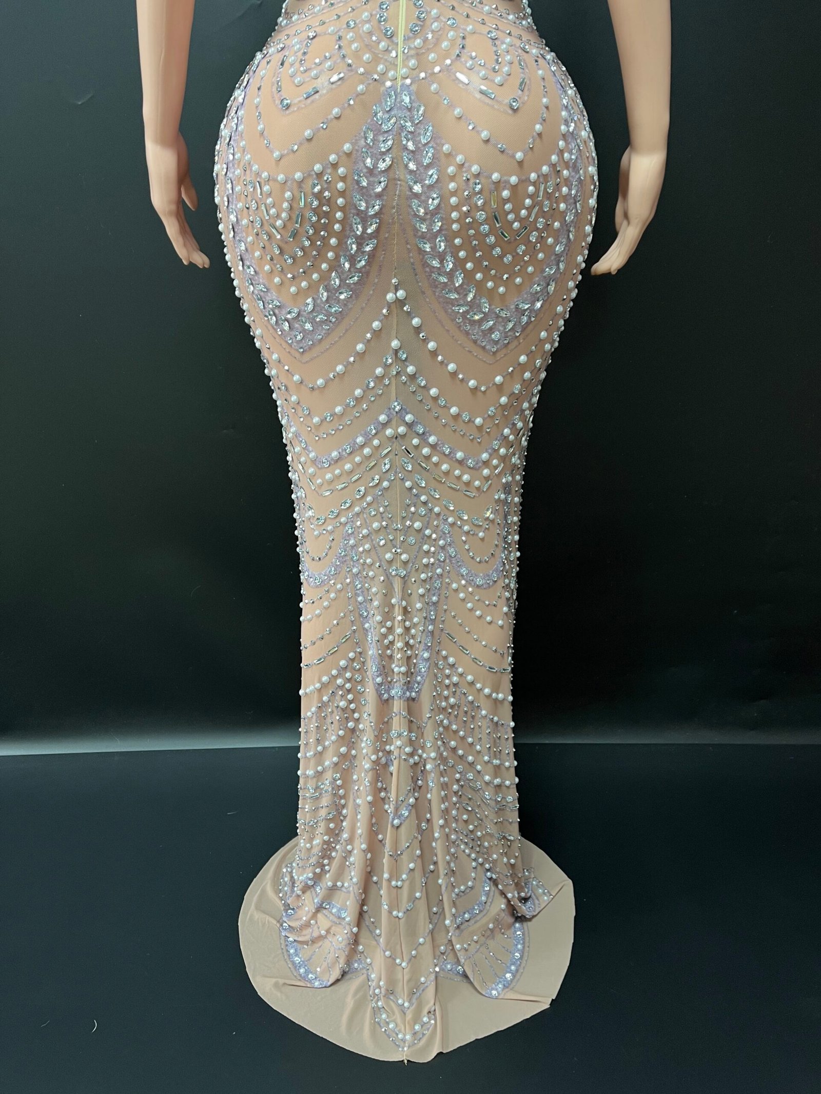 Step into pure elegance with the breathtaking Crowned in Pearls Dress, a masterpiece designed to embody royalty, grace, and undeniable glamour. Crafted on a nude illusion base, this gown is adorned with intricate pearl and crystal embellishments arranged in regal, cascading patterns that sculpt and enhance the silhouette.