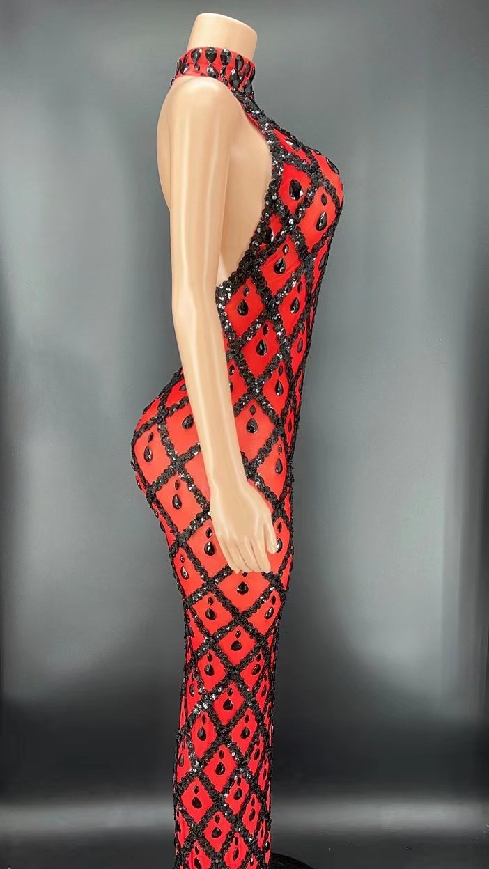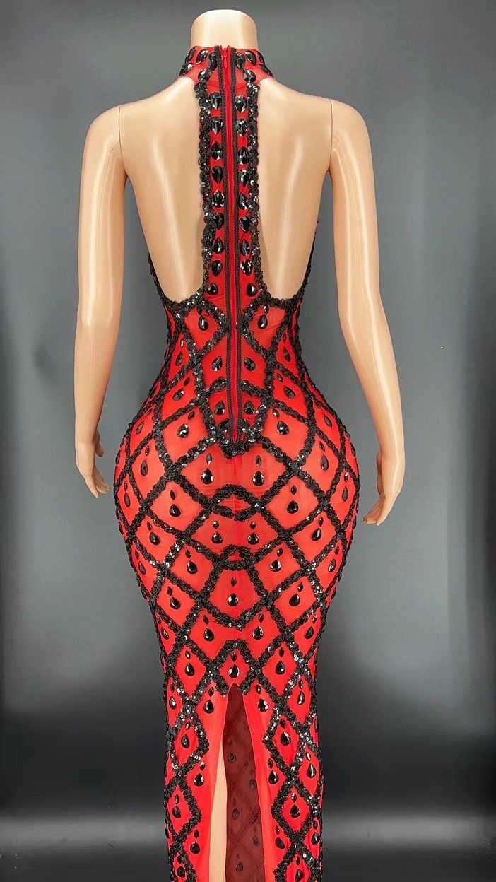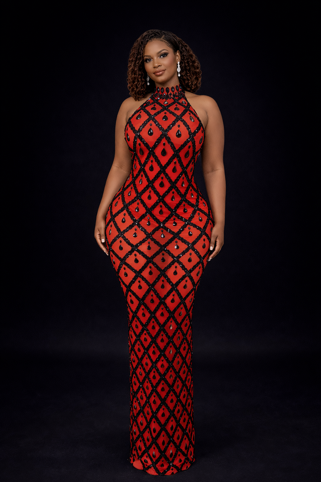 The Desire Chandelier Dress is a sculpted masterpiece designed to captivate from every angle. Crafted in a figure-hugging silhouette, this high-neck, sleeveless design accentuates the waist and curves while delivering a bold, confident statement.