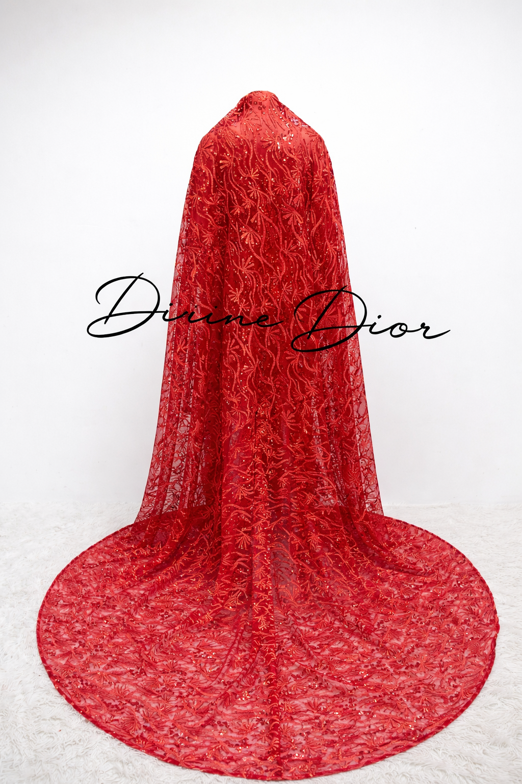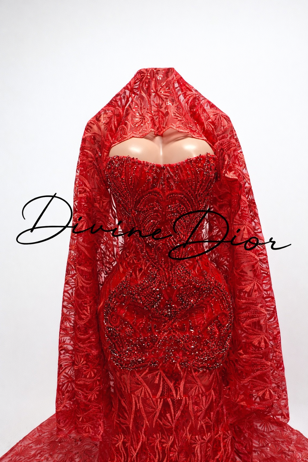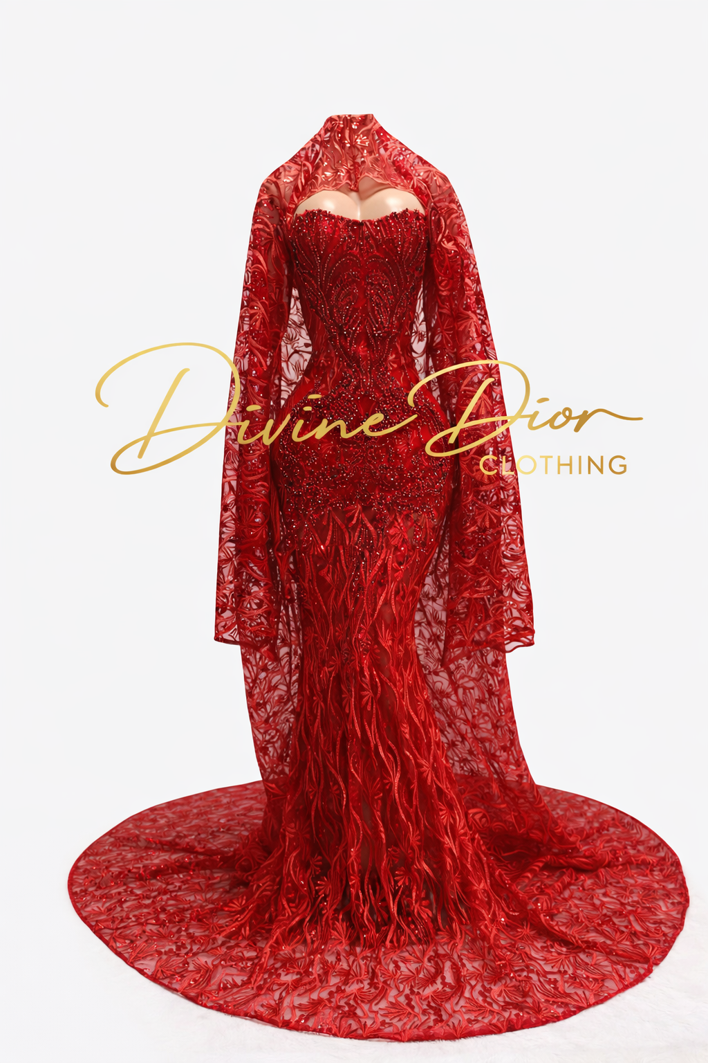The dramatic sheer lace cape flows effortlessly from the shoulders into a full circular train, creating a regal silhouette from every angle. Rich in detail and bold in presence, Ember Royale is more than a dress — it’s an entrance.