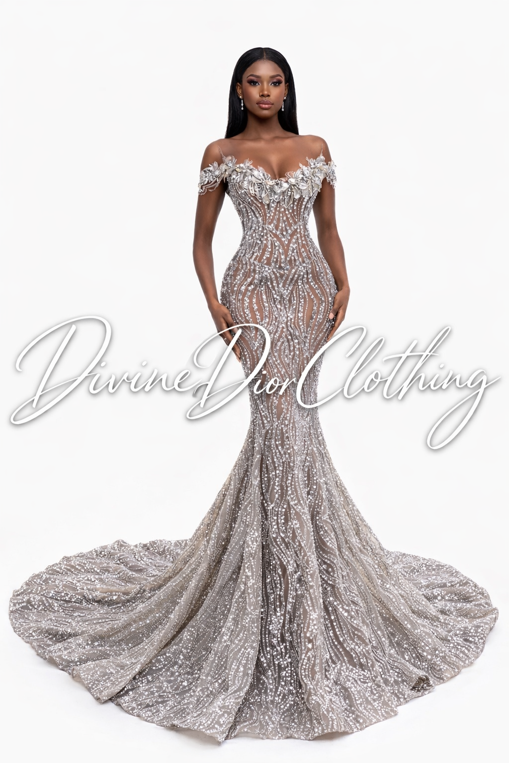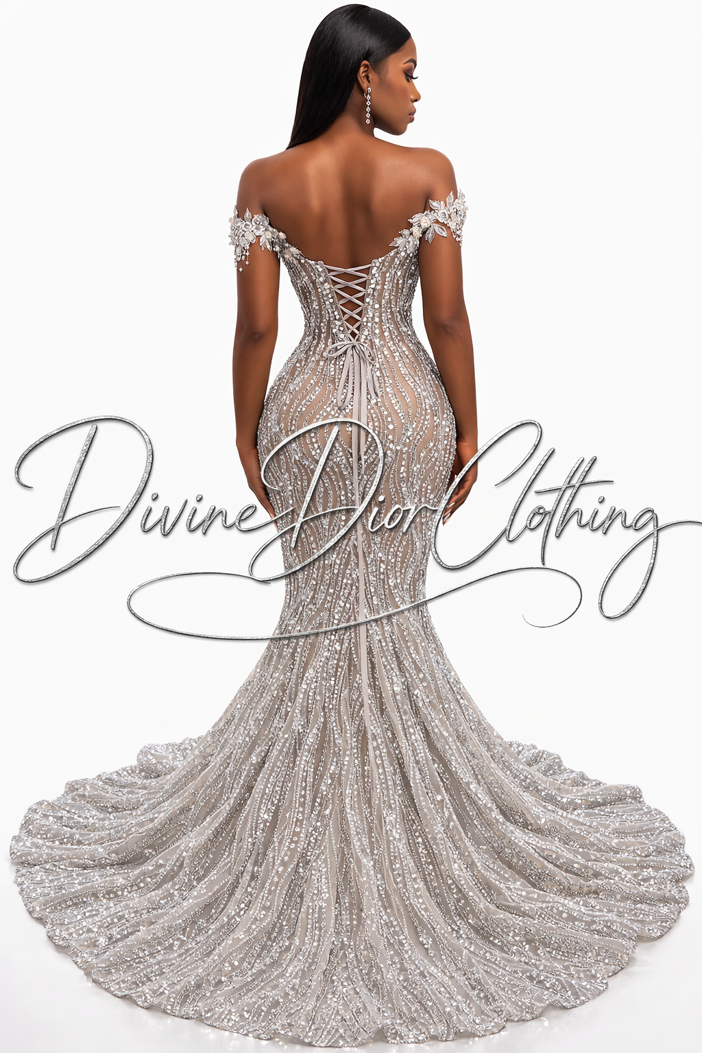 The romantic off-the-shoulder neckline is adorned with delicate floral appliqué, adding a soft feminine touch while the fully embellished mermaid skirt flows into a dramatic train for an unforgettable red-carpet moment. With every step, the shimmering details sparkle beautifully, making this gown the ultimate statement piece for prom night.