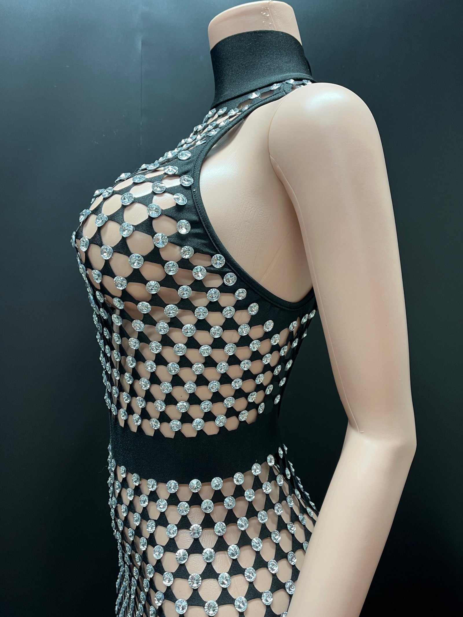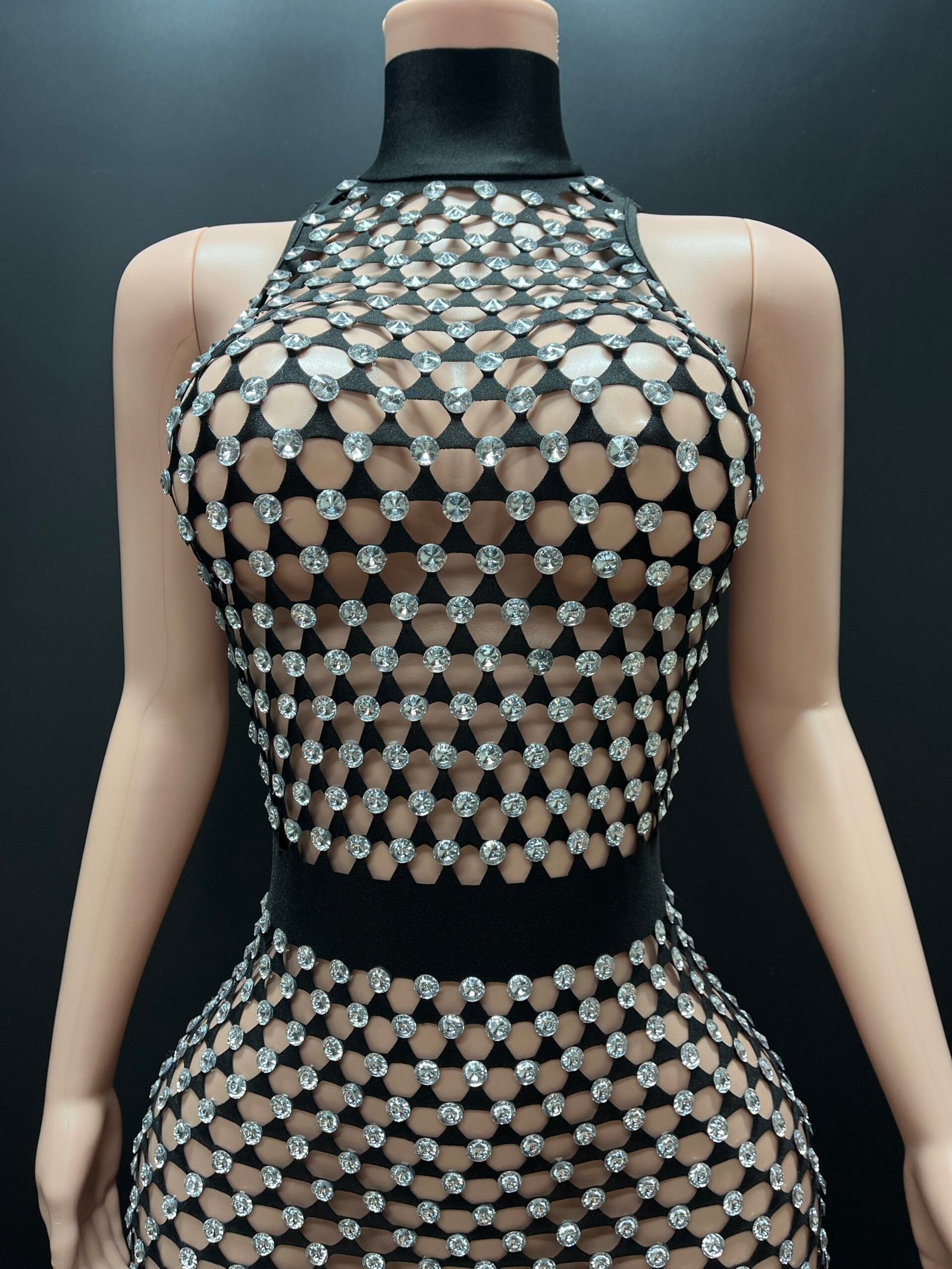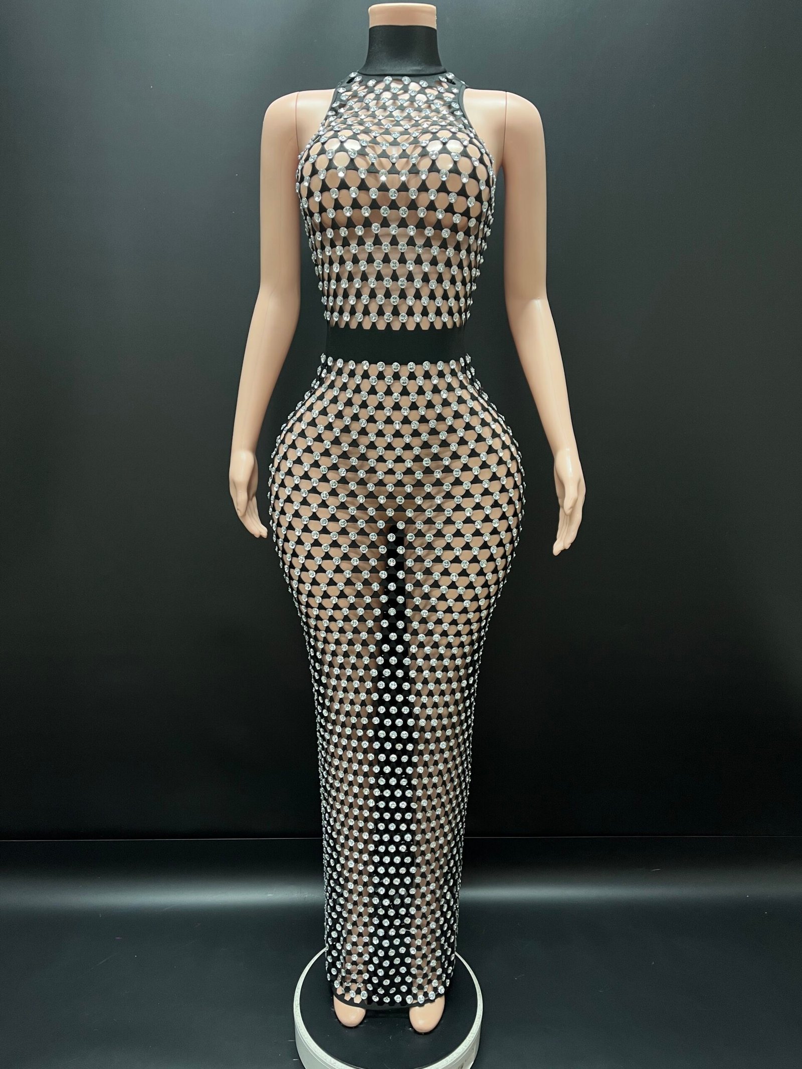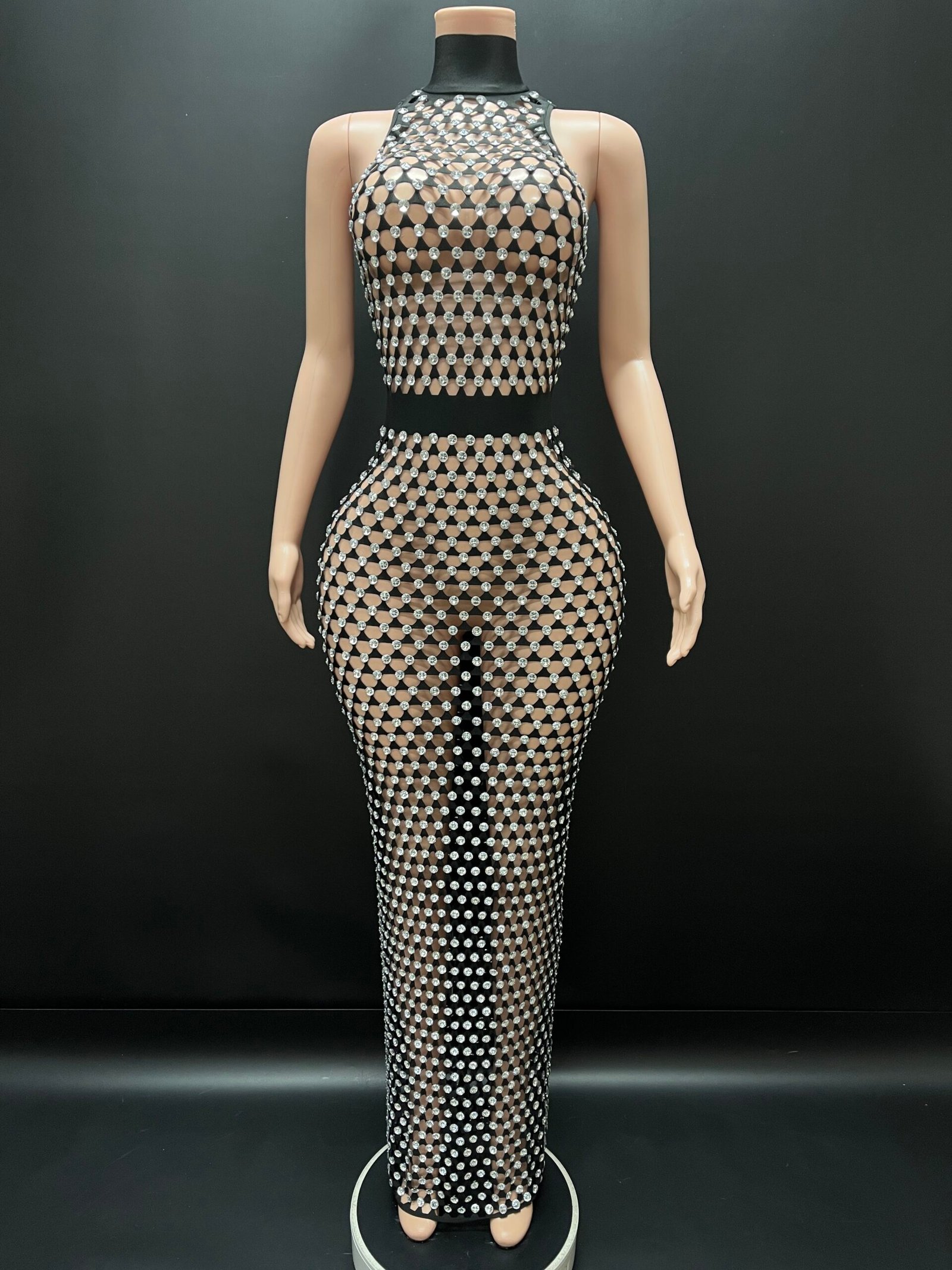 Command attention in the breathtaking Moonlit Seduction Dress, a statement piece designed to shimmer with every movement. This figure-sculpting gown features a dazzling crystal lattice overlay on a sleek silhouette, creating the perfect balance of elegance, glamour, and allure. The high neckline and illusion design highlight the body’s natural curves while the floor-length fit delivers a dramatic, red-carpet finish.