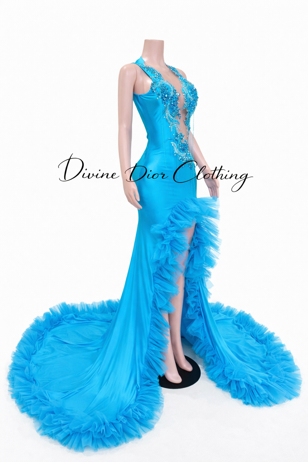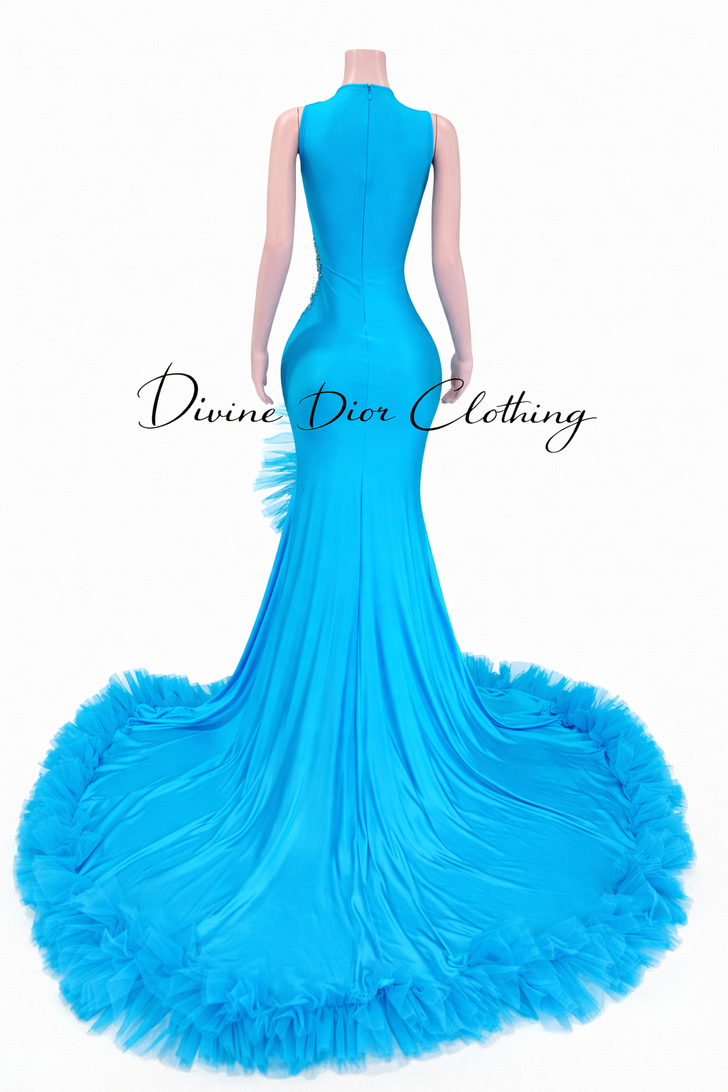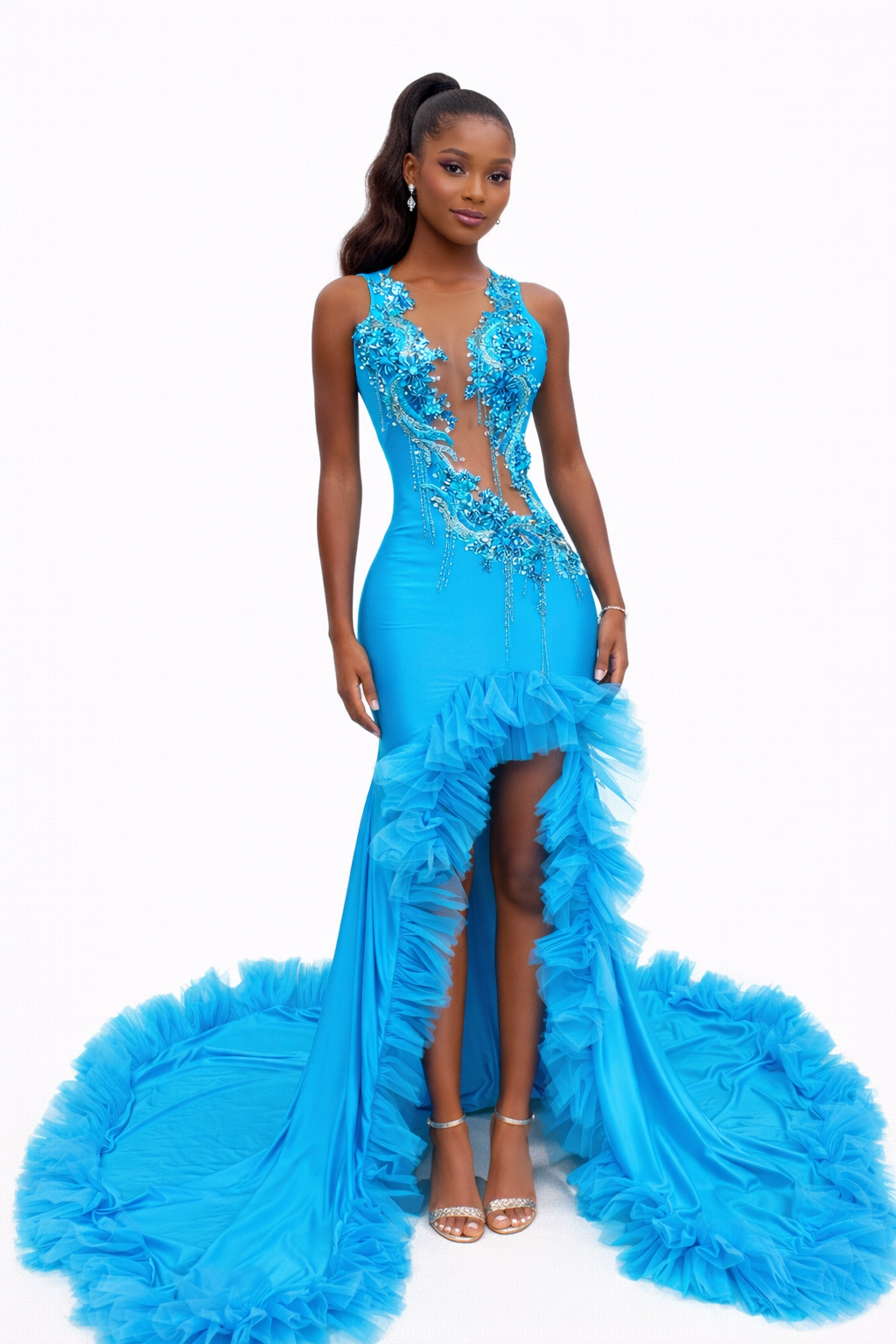 The illusion plunge neckline and sculpted silhouette highlight the waist and curves, while the dramatic high-low ruffle train adds unforgettable movement with every step. The vibrant ocean-blue color evokes the beauty of paradise waters, making this gown the perfect statement piece for prom night or any luxury formal event.