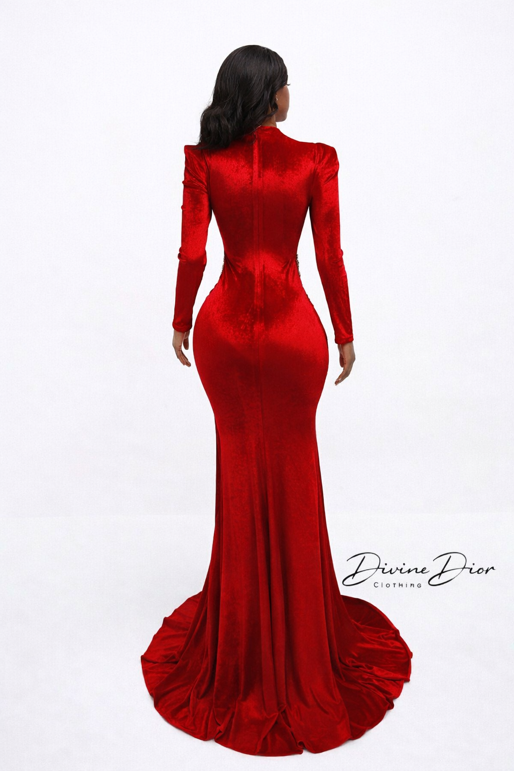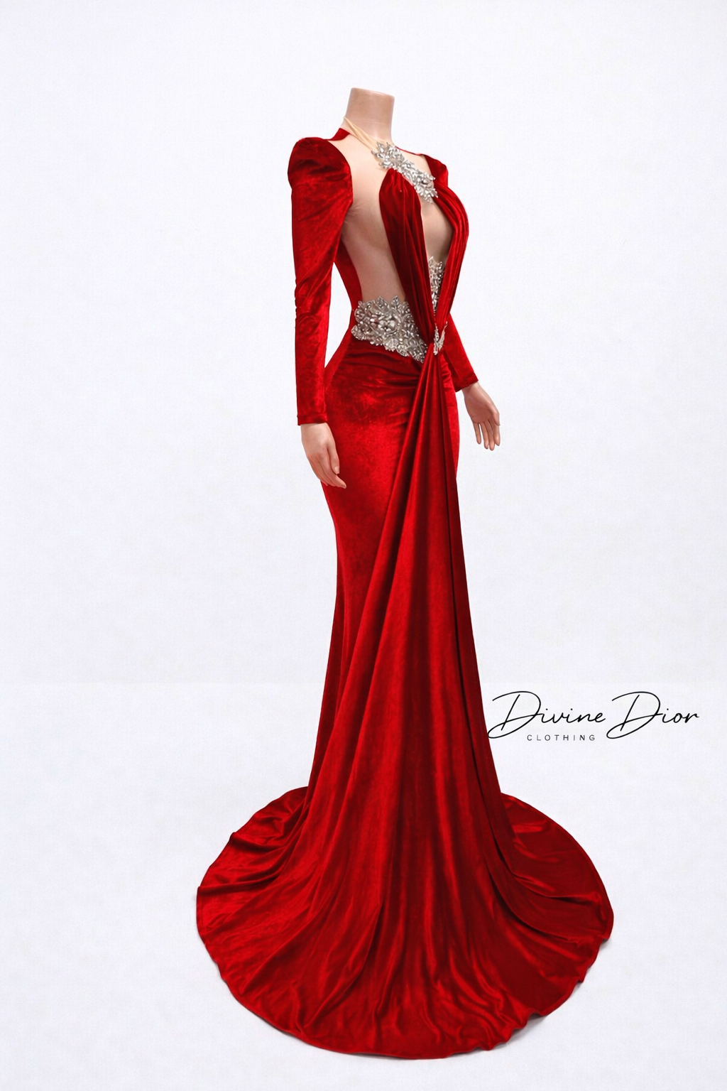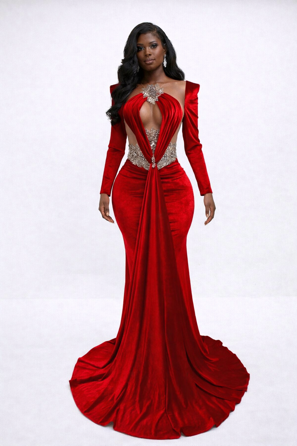 The Princess Ayana Dress is the embodiment of regal glamour and bold femininity. Designed for the woman who refuses to blend in, this couture-inspired masterpiece sculpts the body in rich, luminous velvet while dramatic draping cascades from the bodice into a striking, elongated silhouette.