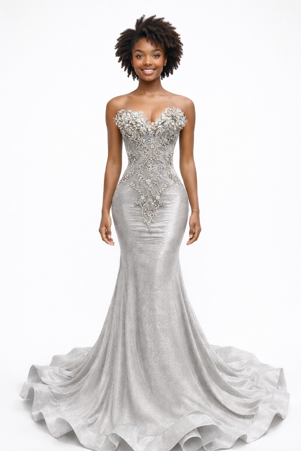 Step into prom night like royalty in our breathtaking Prom Queen Gown, designed for the girl who wants all eyes on her. This stunning mermaid silhouette features a sculpted corset bodice adorned with intricate floral appliqué and shimmering beadwork that cascades gracefully down the gown. The sweetheart neckline enhances the feminine shape while the curve-hugging fit flows into a dramatic mermaid train for an unforgettable entrance.