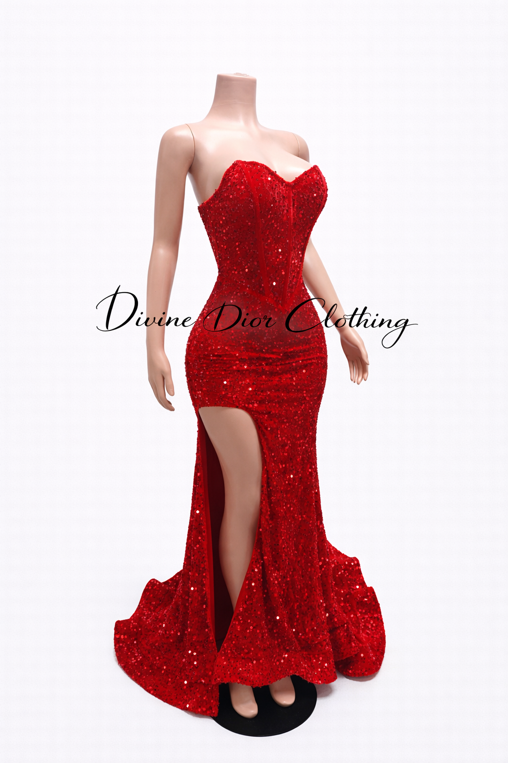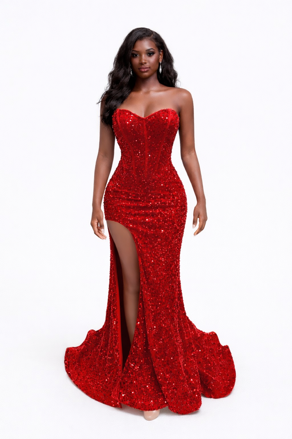 Command attention the moment you step into the room with the Raven Glam Gown, a striking statement piece designed for the bold and glamorous. This dazzling gown features shimmering sequin embellishments that catch the light from every angle, creating a captivating sparkle with every step. The structured sweetheart bodice enhances your silhouette while the curve-hugging fit beautifully highlights your figure. A dramatic thigh-high slit adds the perfect touch of allure, while the elegant mermaid skirt flows into a subtle train for a truly red-carpet-worthy finish.