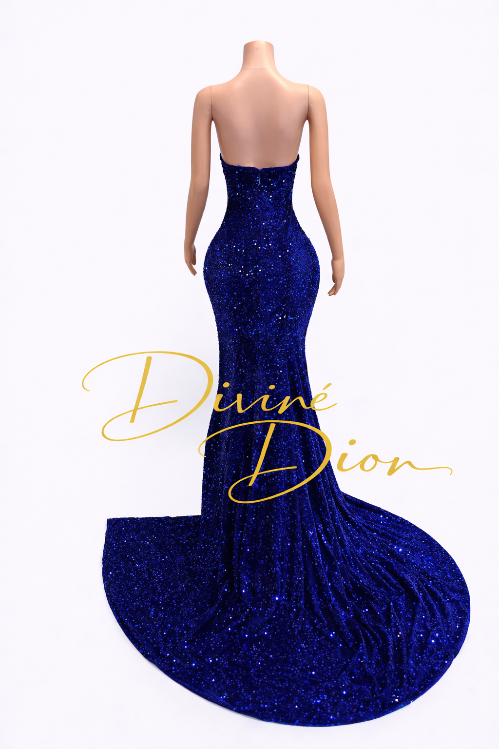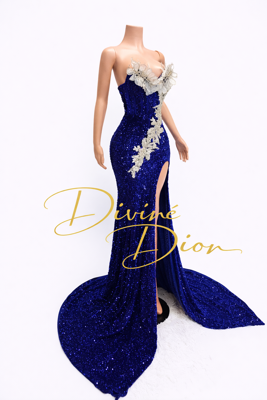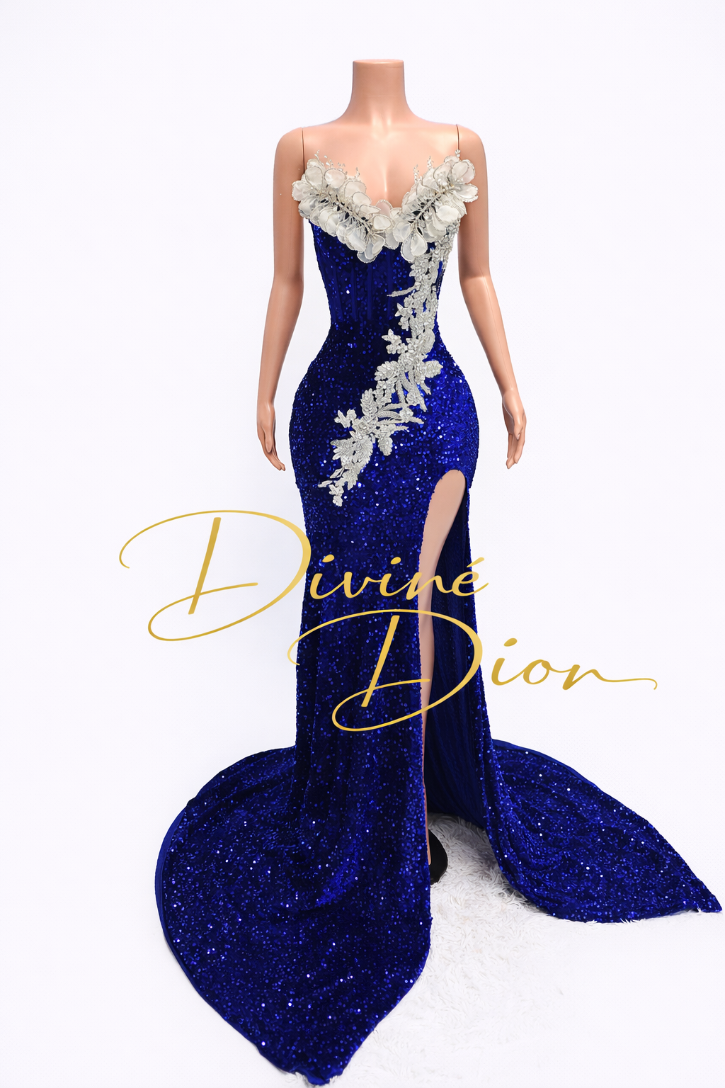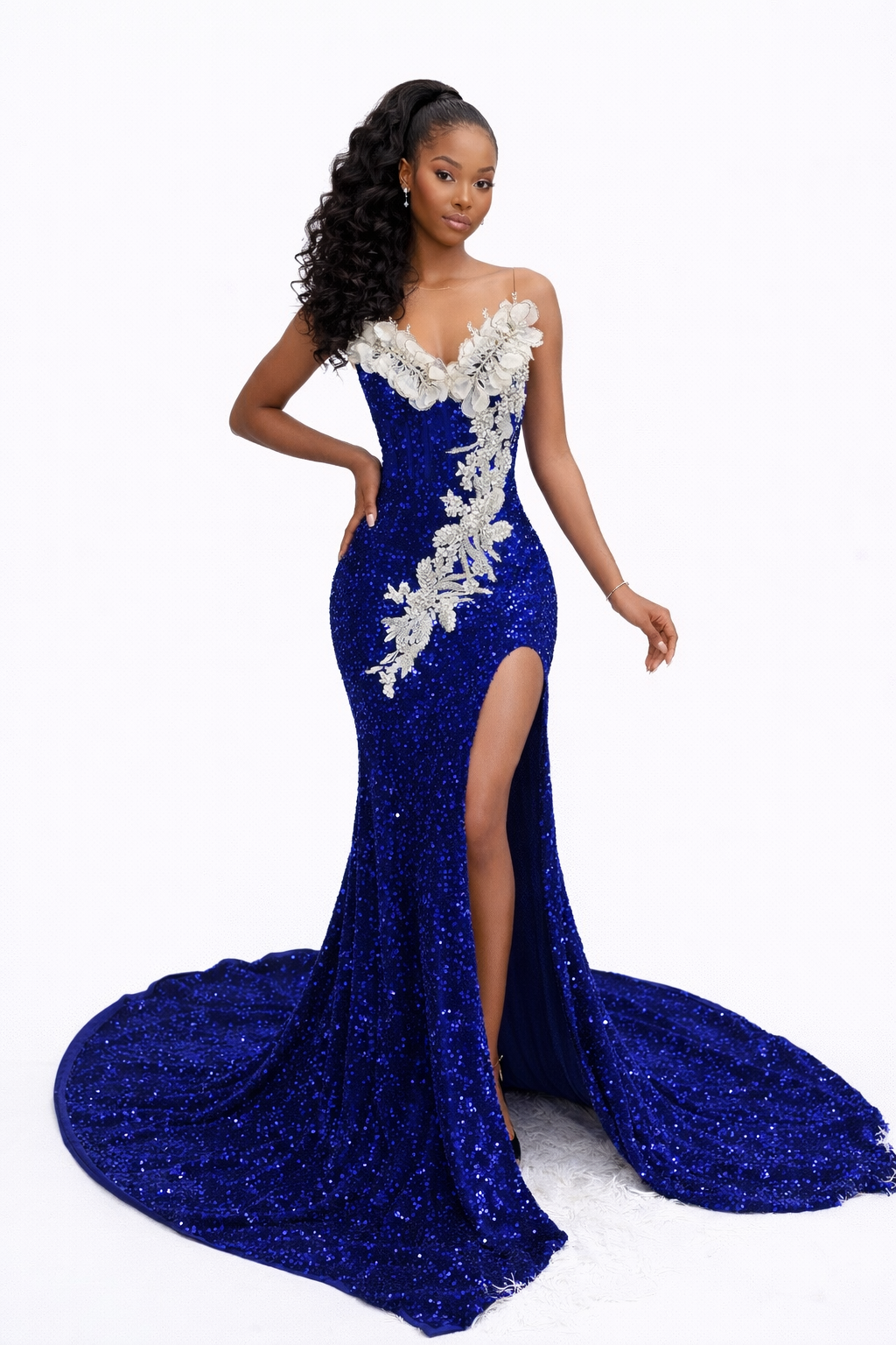 The fitted silhouette hugs the body beautifully before flowing into a dramatic train that moves effortlessly with every step. A bold thigh-high slit adds the perfect touch of allure, allowing you to show just the right amount of leg while maintaining an elegant and refined look. Designed to command attention from every angle, the Remi gown is perfect for prom queens who want to make an unforgettable entrance.