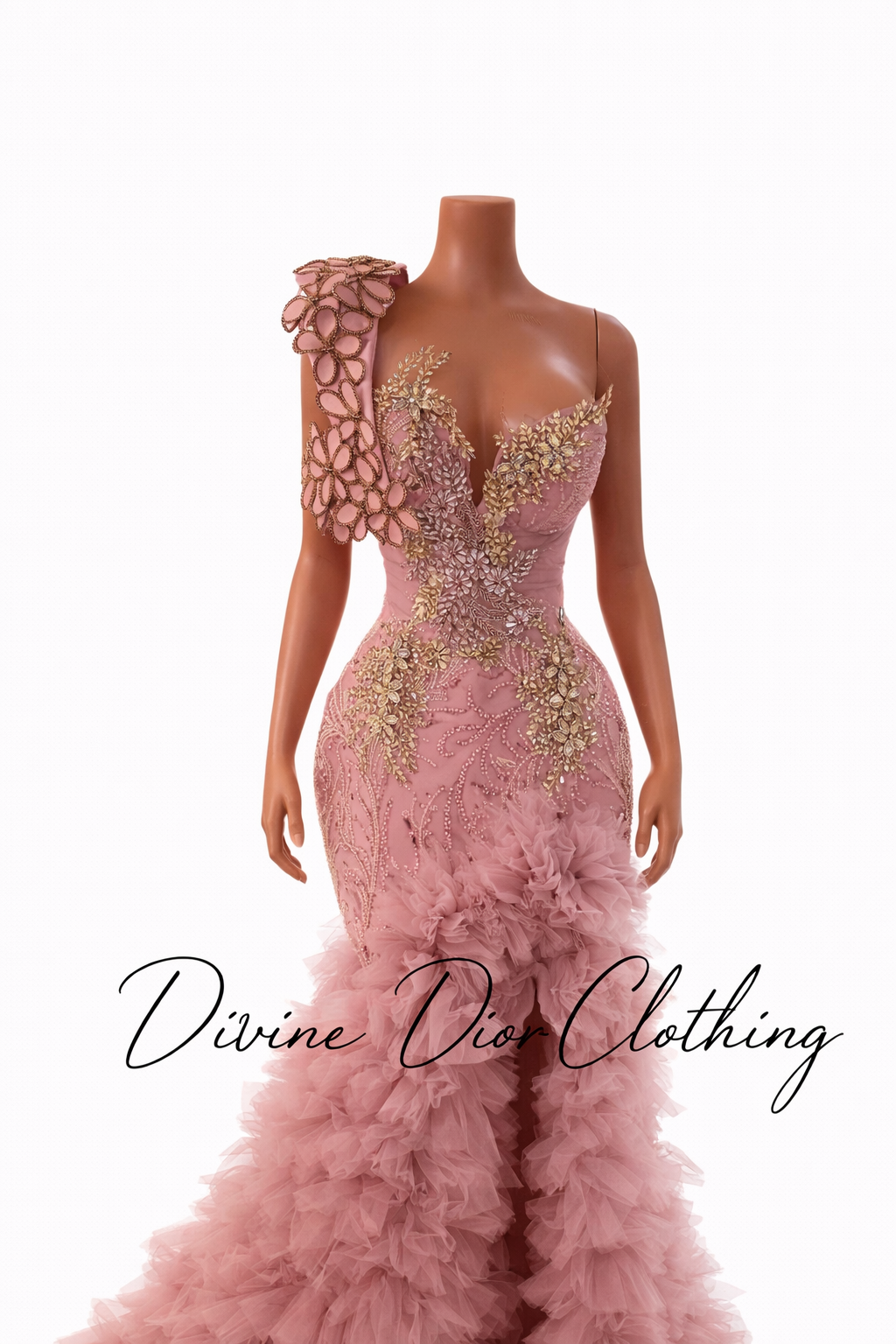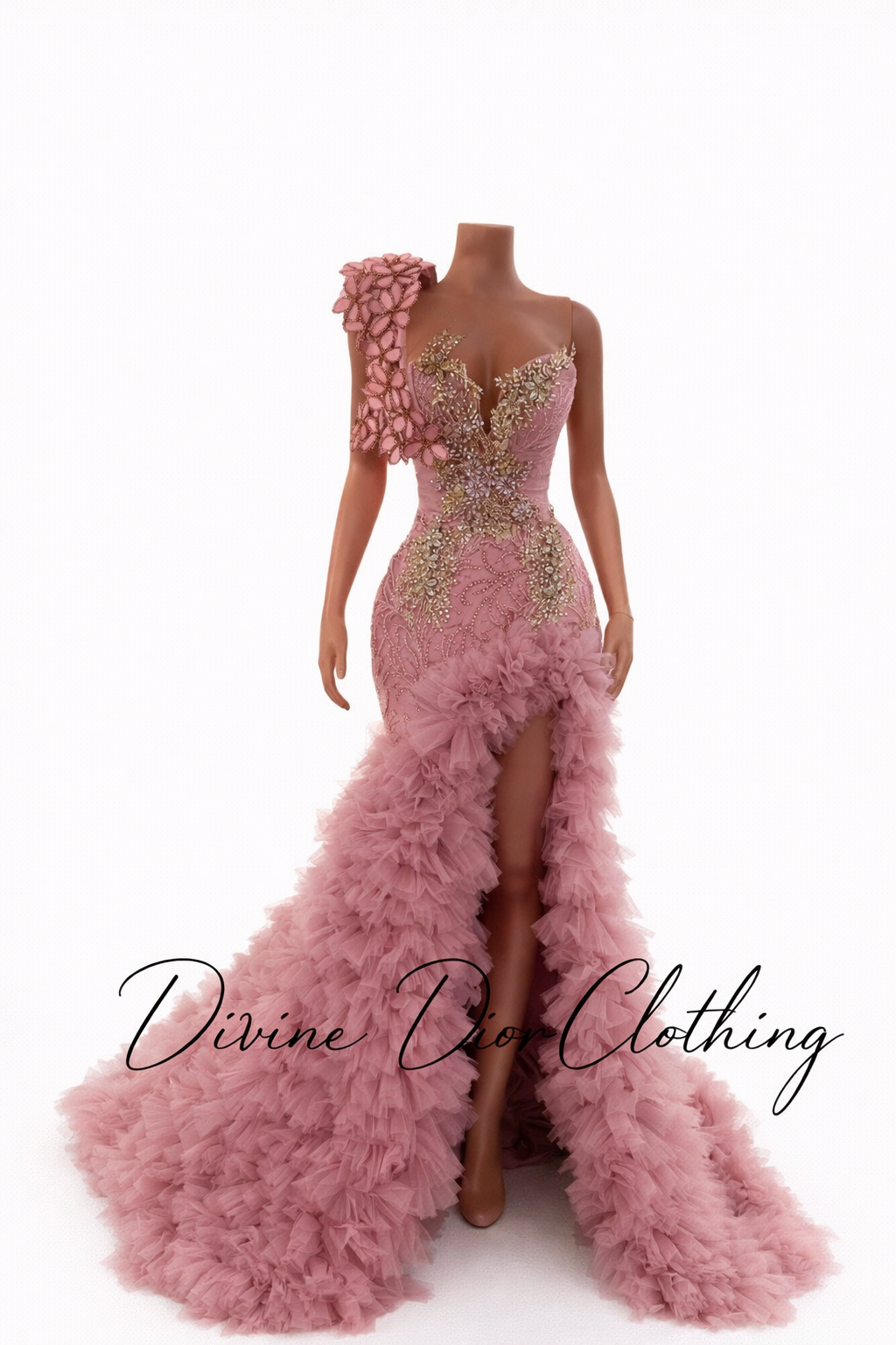 Step into pure royalty with the Royal Minaj Gown, a breathtaking statement piece designed for the girl who was born to stand out. This luxurious mermaid gown features intricate hand-embellished appliqué, shimmering crystal detailing, and a dramatic high-low ruffle train that creates unforgettable movement with every step.