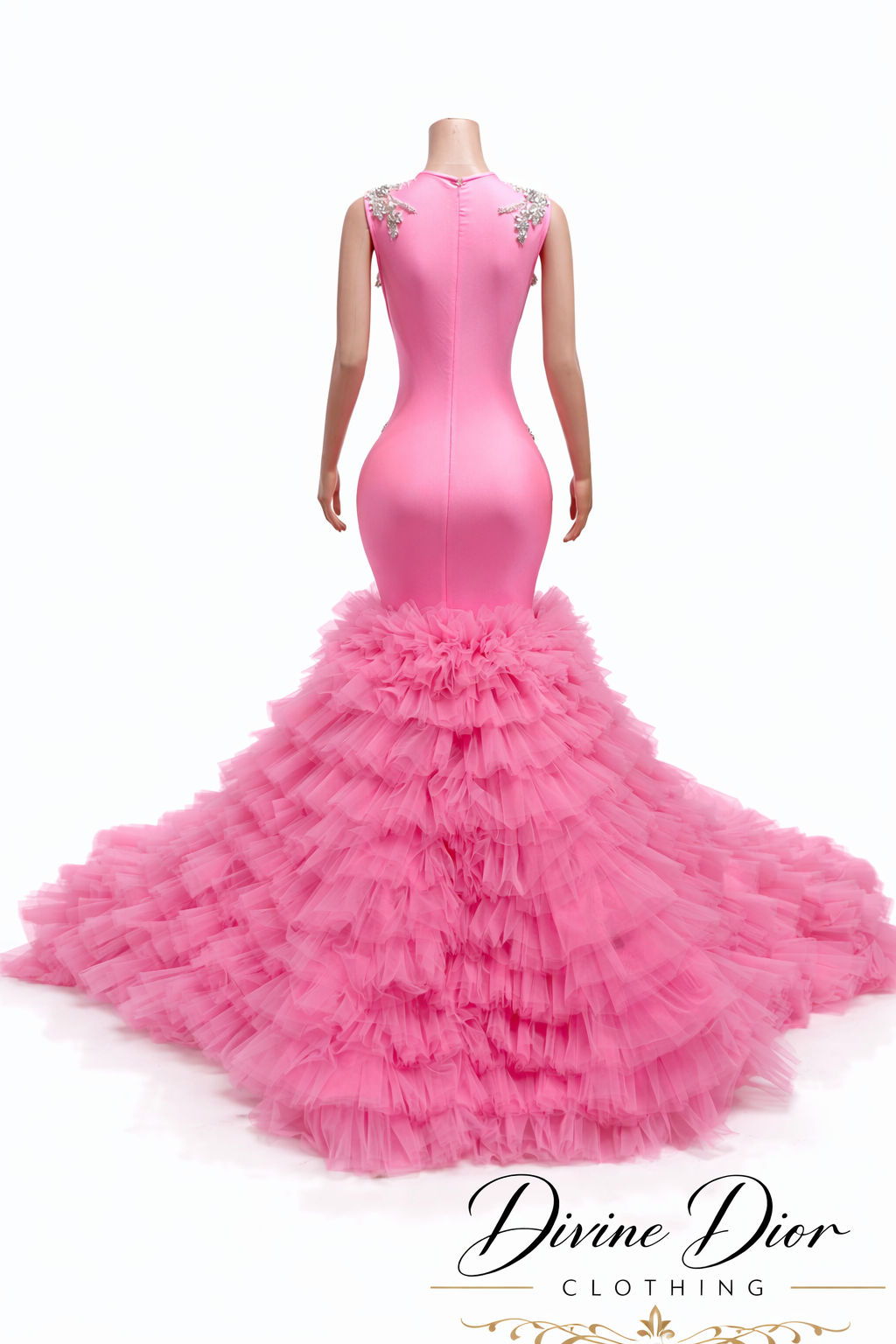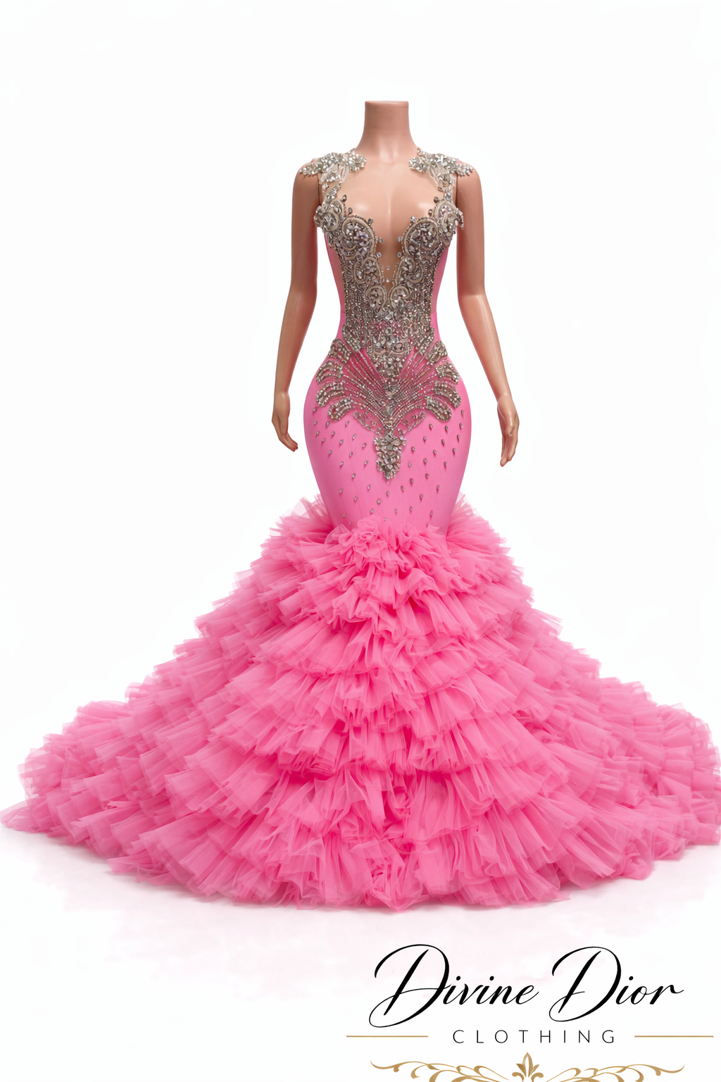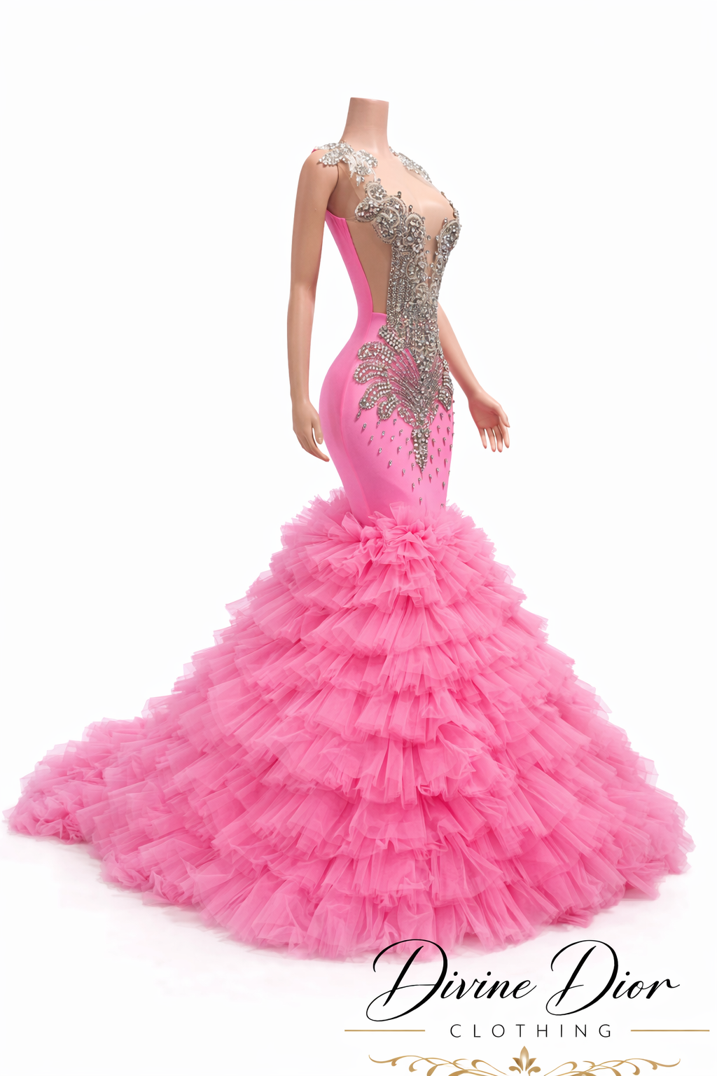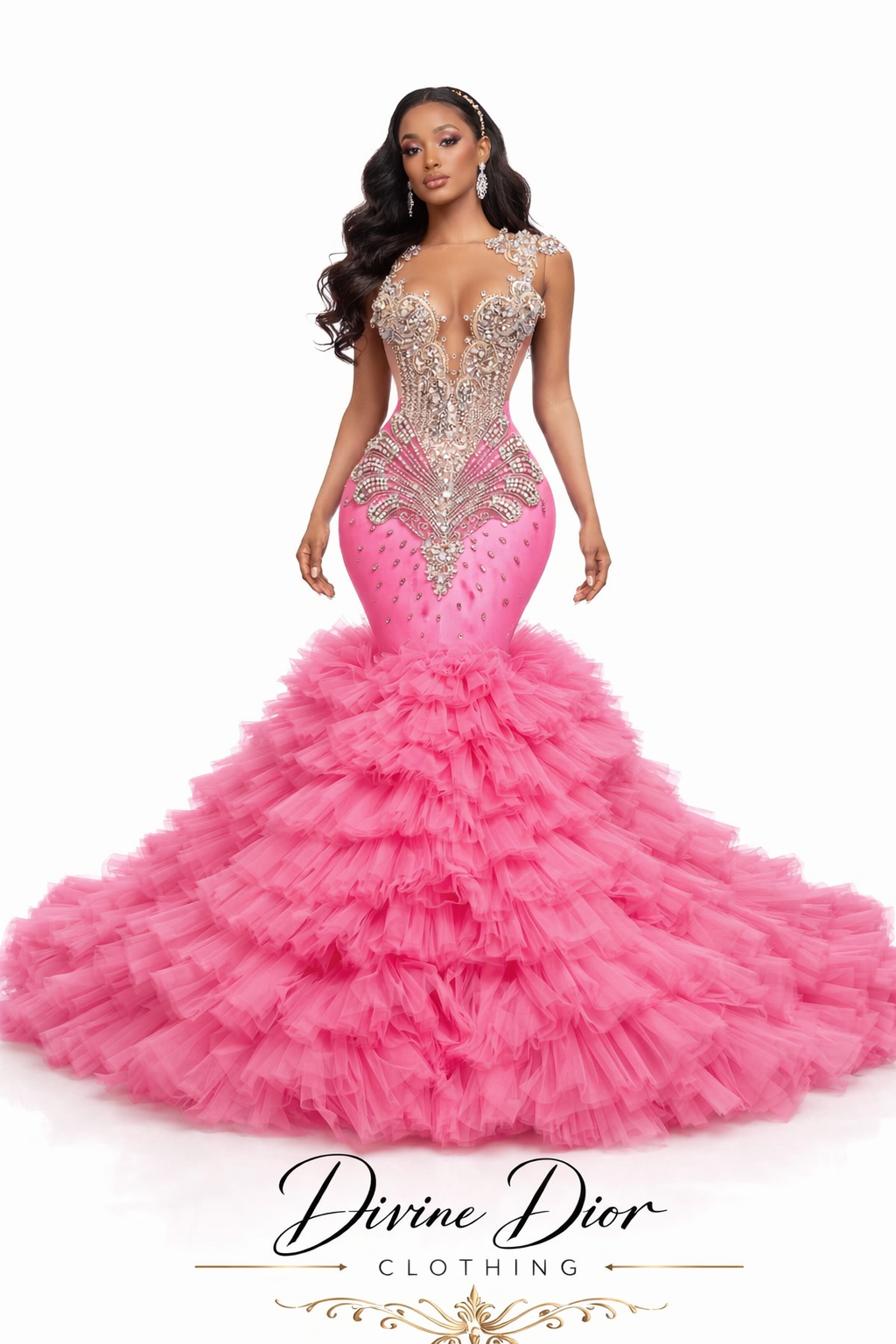 From the hips down, the design transforms into a dramatic cascading skirt composed of layered ruffles that create fullness, texture, and movement with every step. The combination of structured embellishment and flowing volume gives the gown a powerful yet graceful presence, perfect for grand entrances and unforgettable moments.