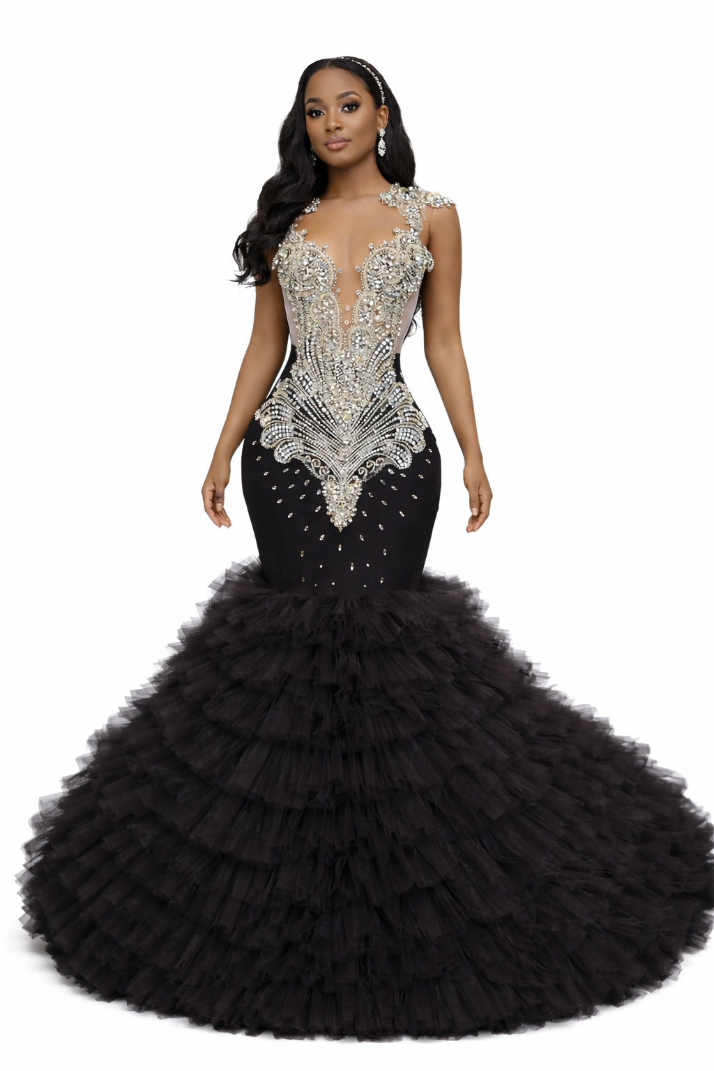 From the hips down, the design transforms into a dramatic cascading skirt composed of layered ruffles that create fullness, texture, and movement with every step. The combination of structured embellishment and flowing volume gives the gown a powerful yet graceful presence, perfect for grand entrances and unforgettable moments.