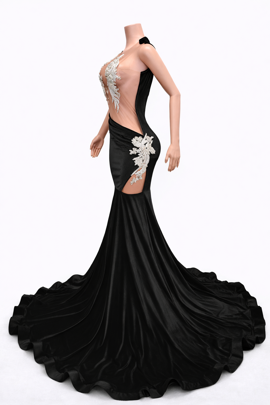The illusion bodice features intricate appliqué detailing that artfully contours the figure, creating a flawless second-skin effect while offering a bold yet sophisticated finish. Designed to accentuate natural curves, the draped waistline flows seamlessly into a dramatic mermaid silhouette that elongates the body and moves with effortless grace.