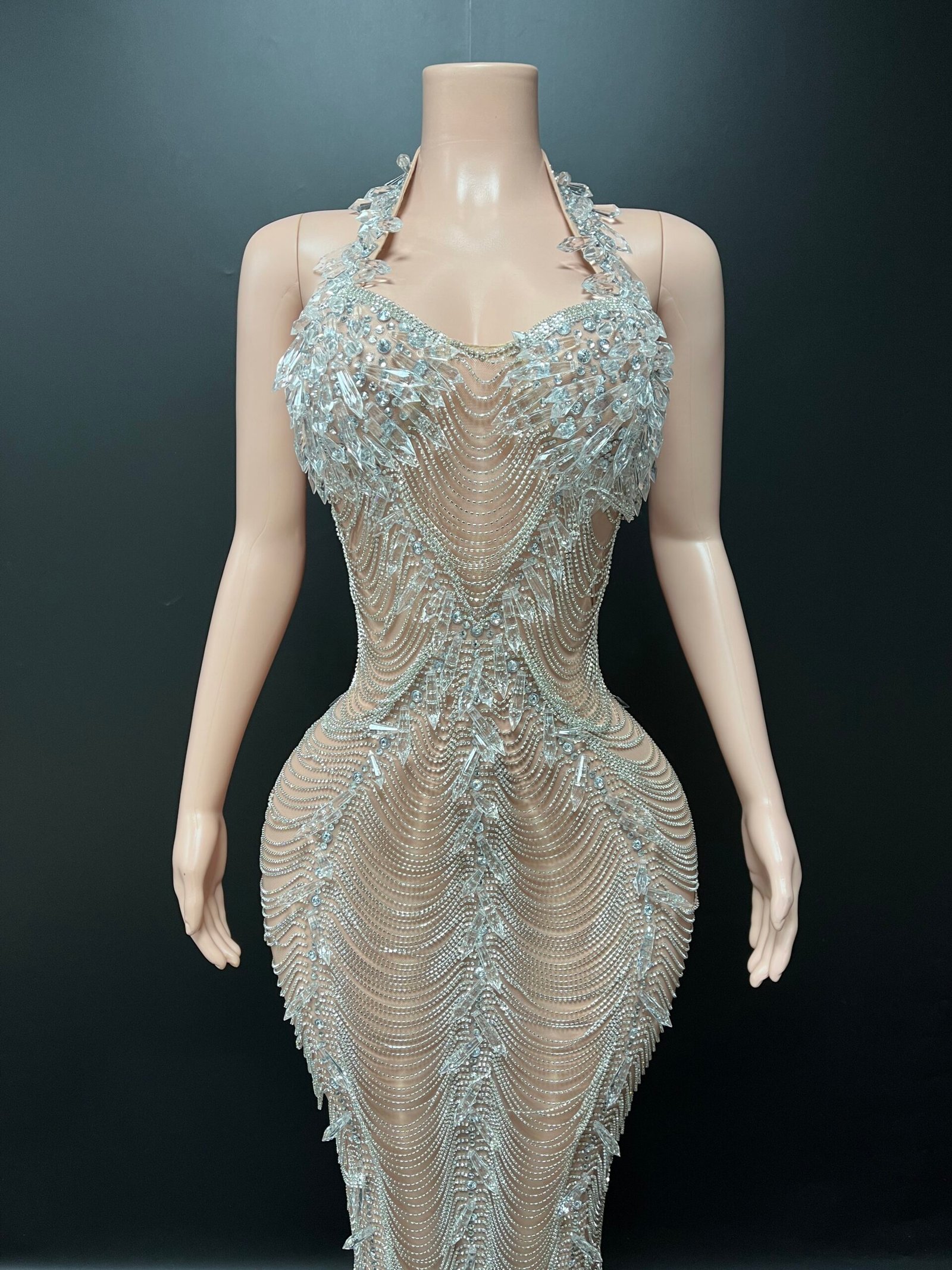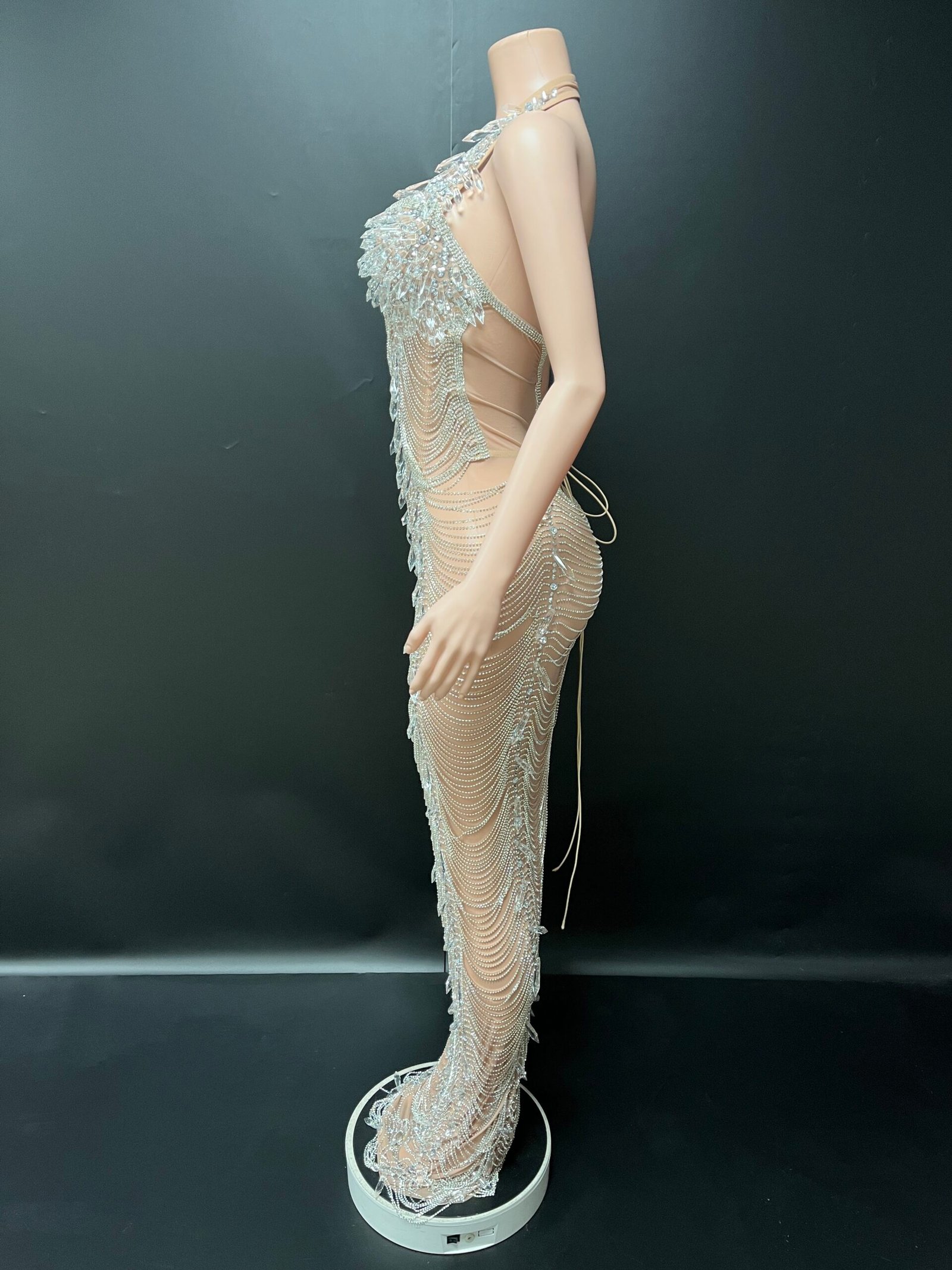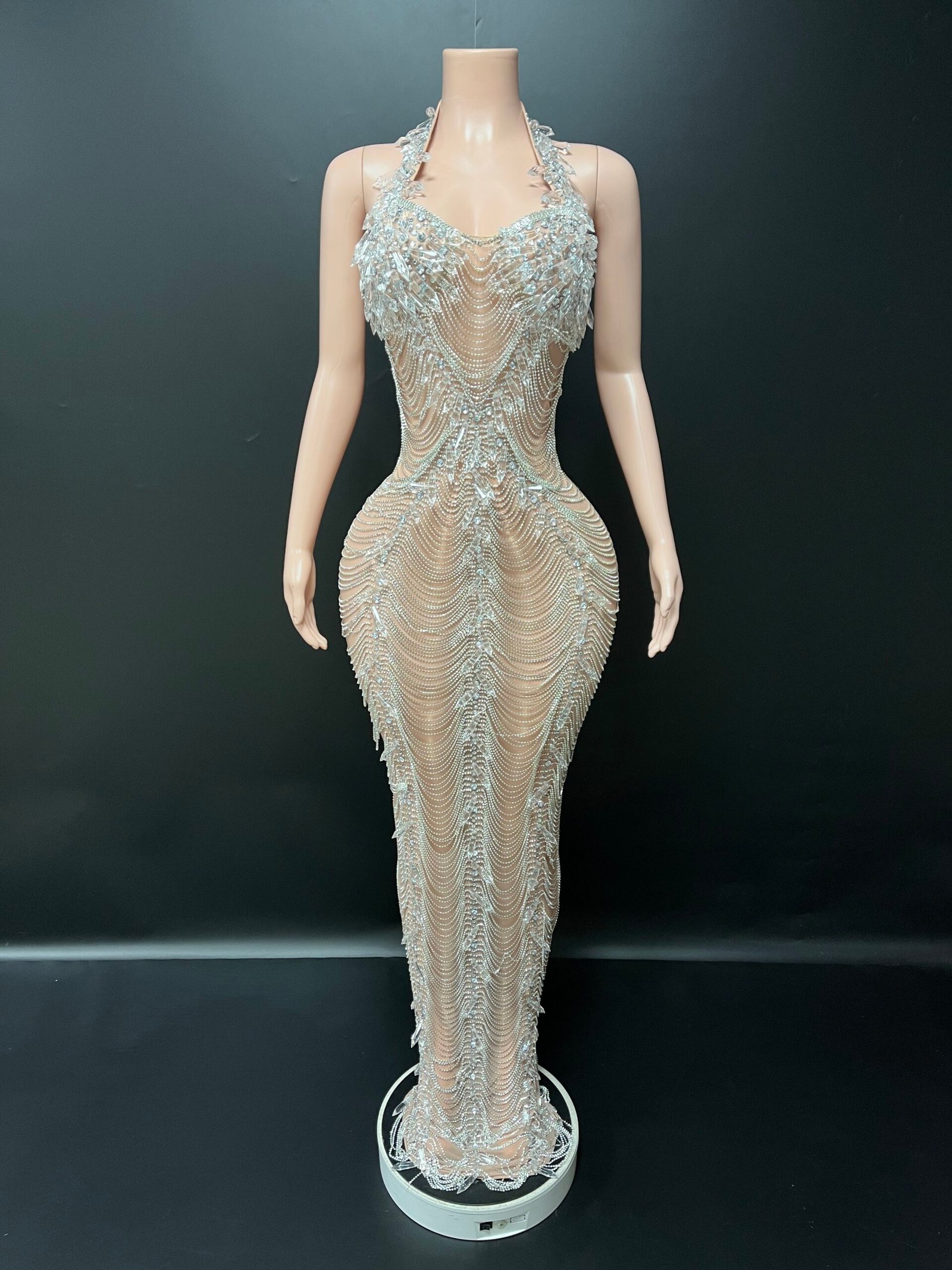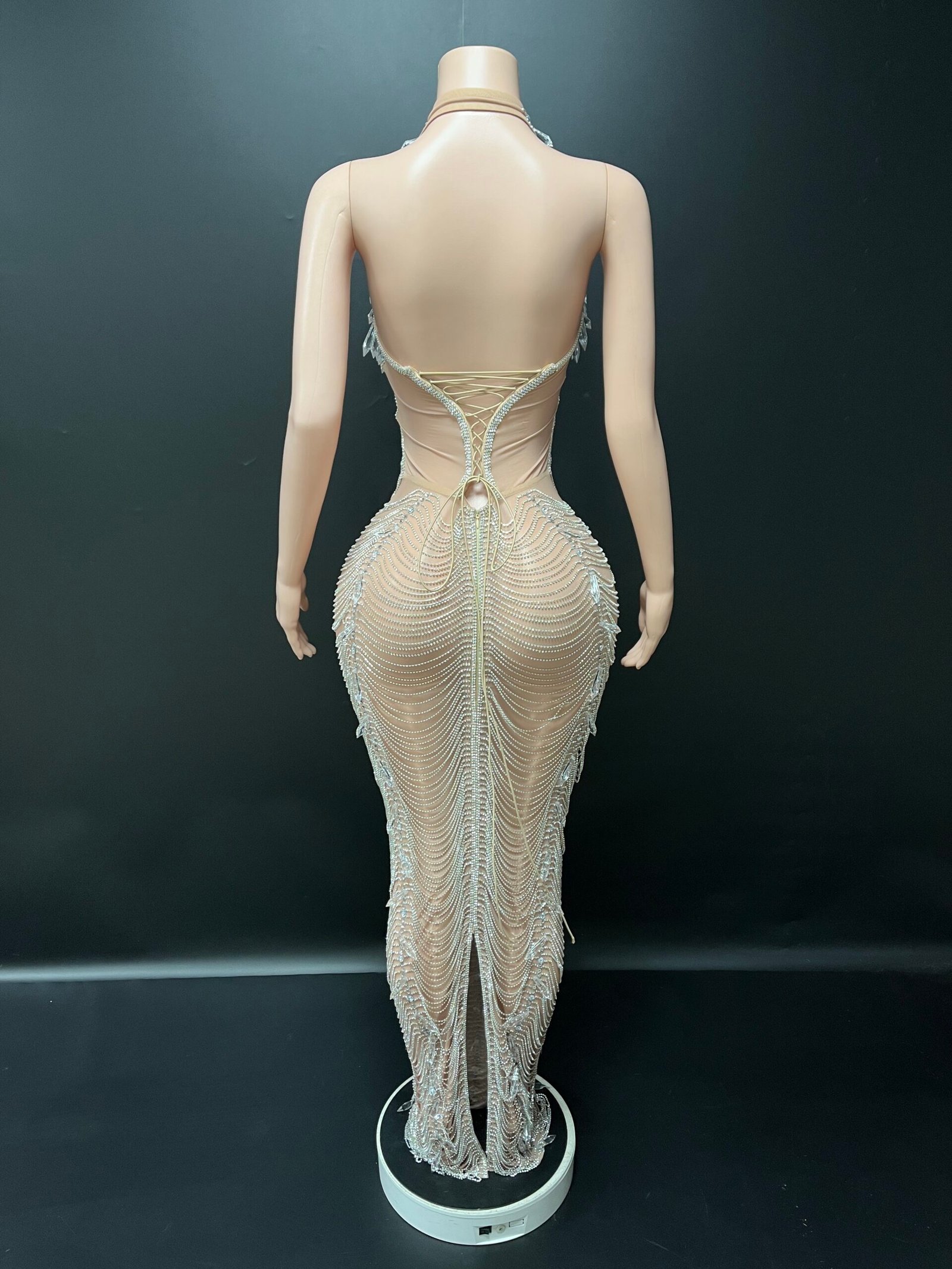 Make an unforgettable entrance in the Halo Chain Dress — a statement piece designed to capture light, movement, and attention from every angle. This couture-inspired gown features intricate chain draping that contours the body, creating a sculpted silhouette that feels both modern and timeless.