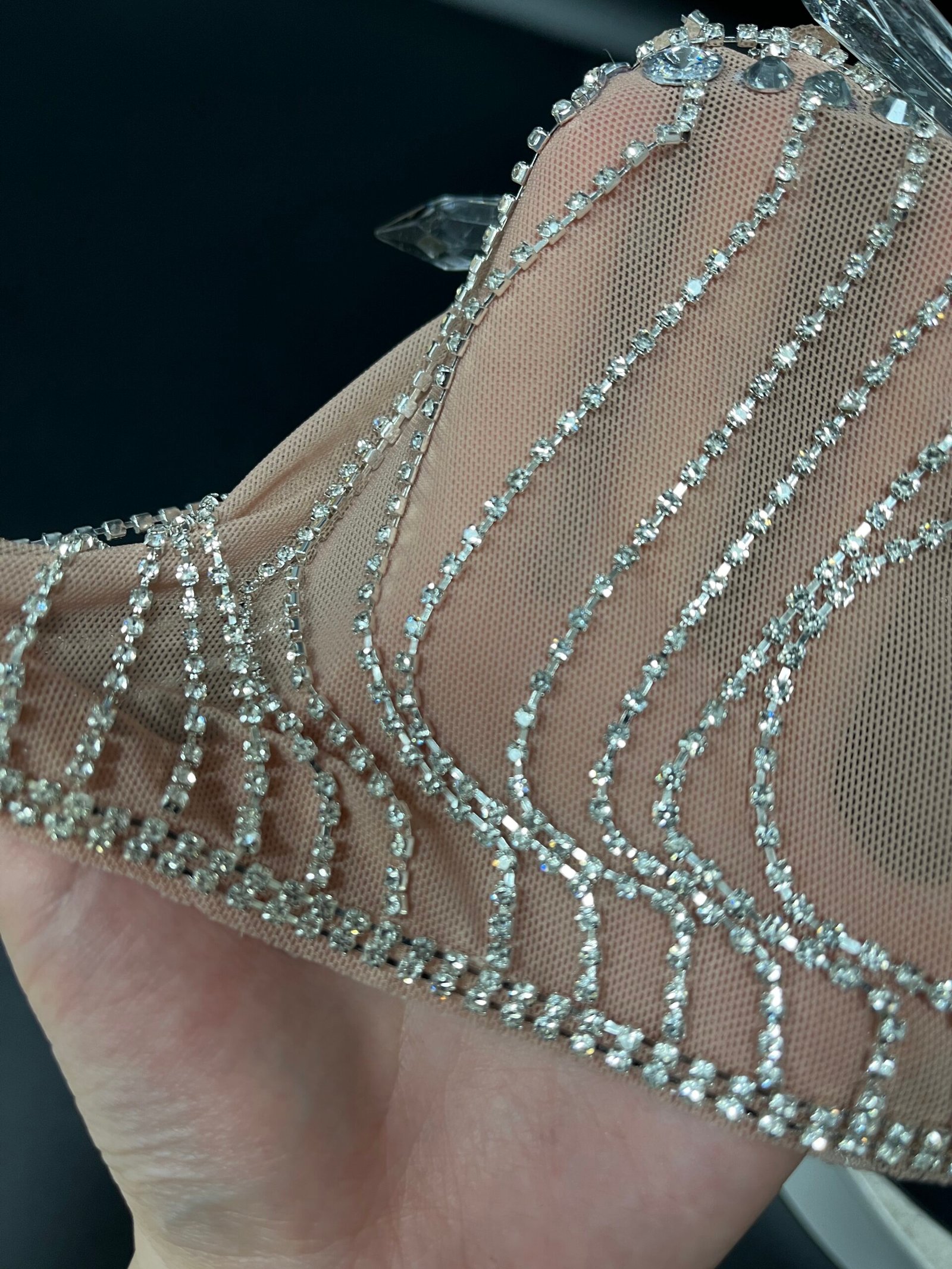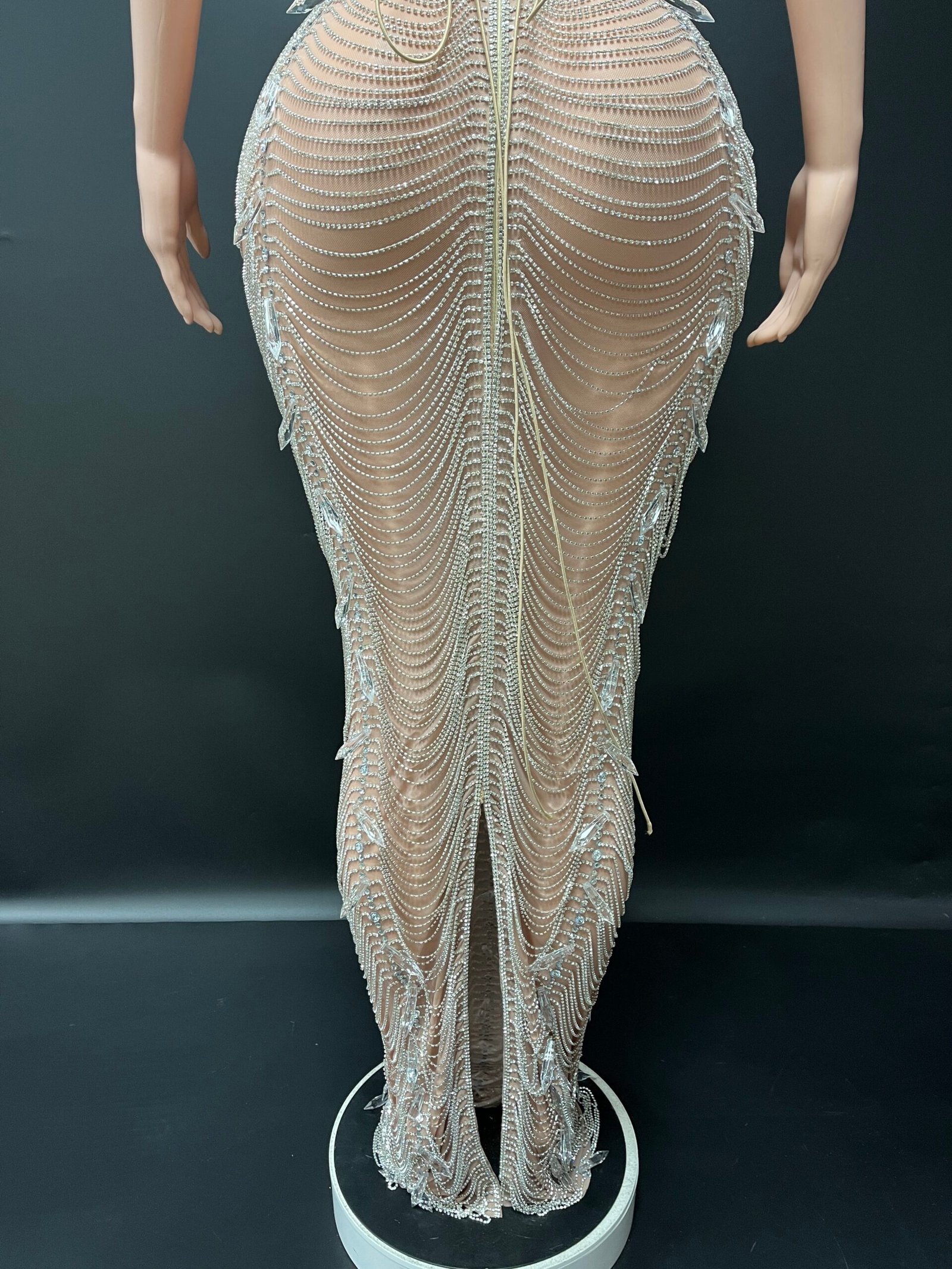 The structured bodice provides support while delicate chain detailing cascades throughout the design, giving the dress a radiant, dimensional effect. Perfect for galas, red-carpet moments, prom, or any luxury event where standing out is the only option.