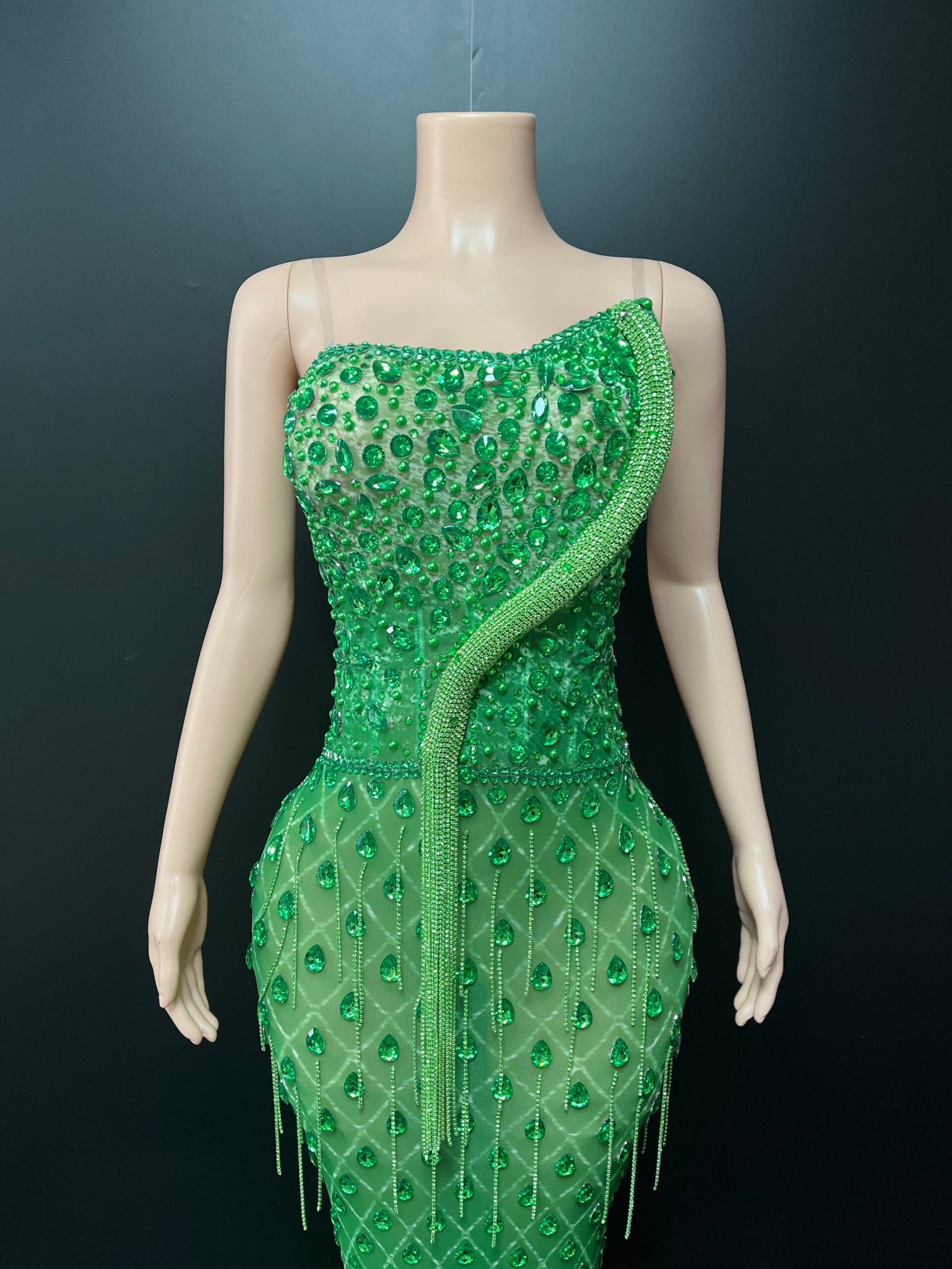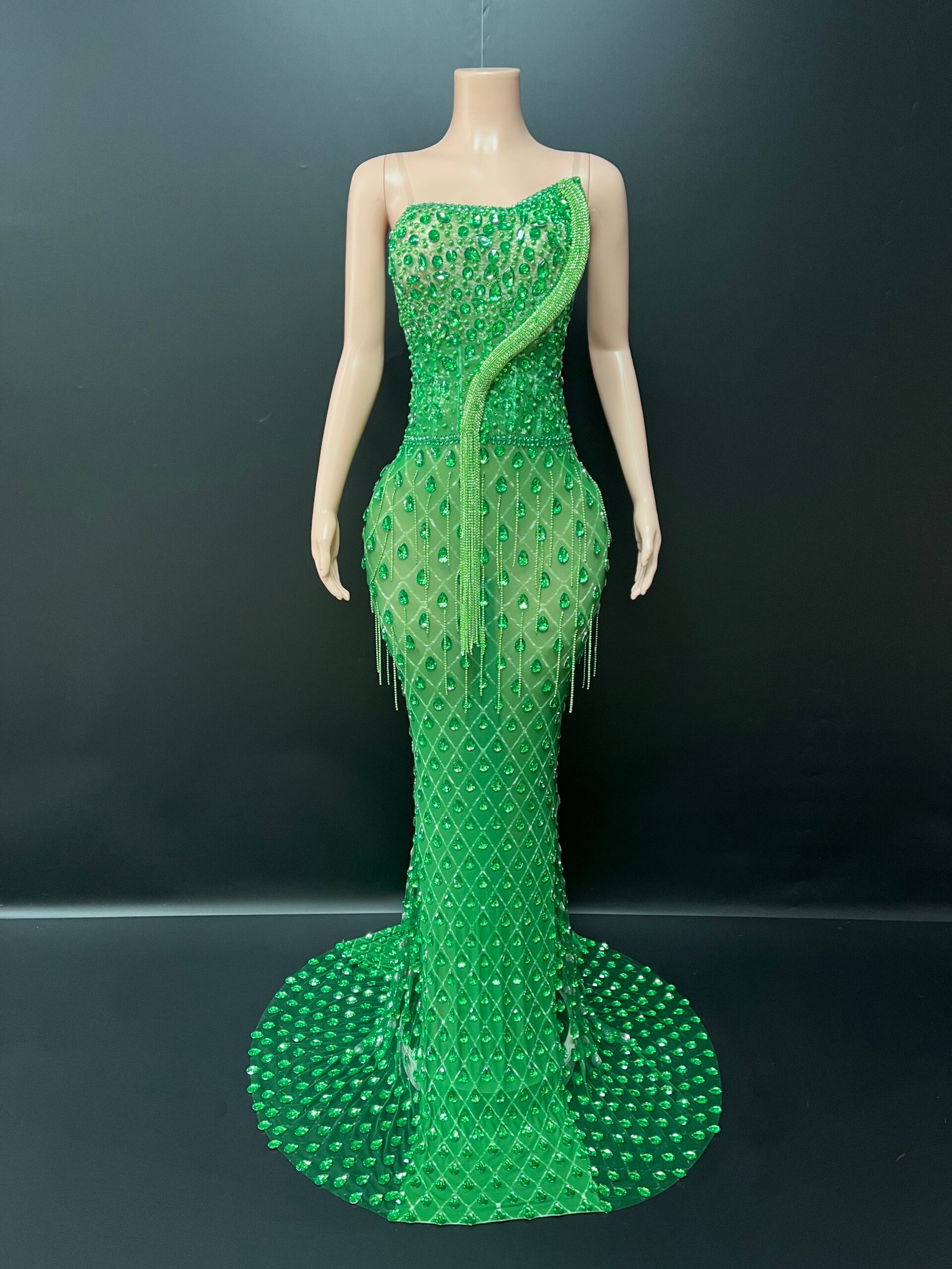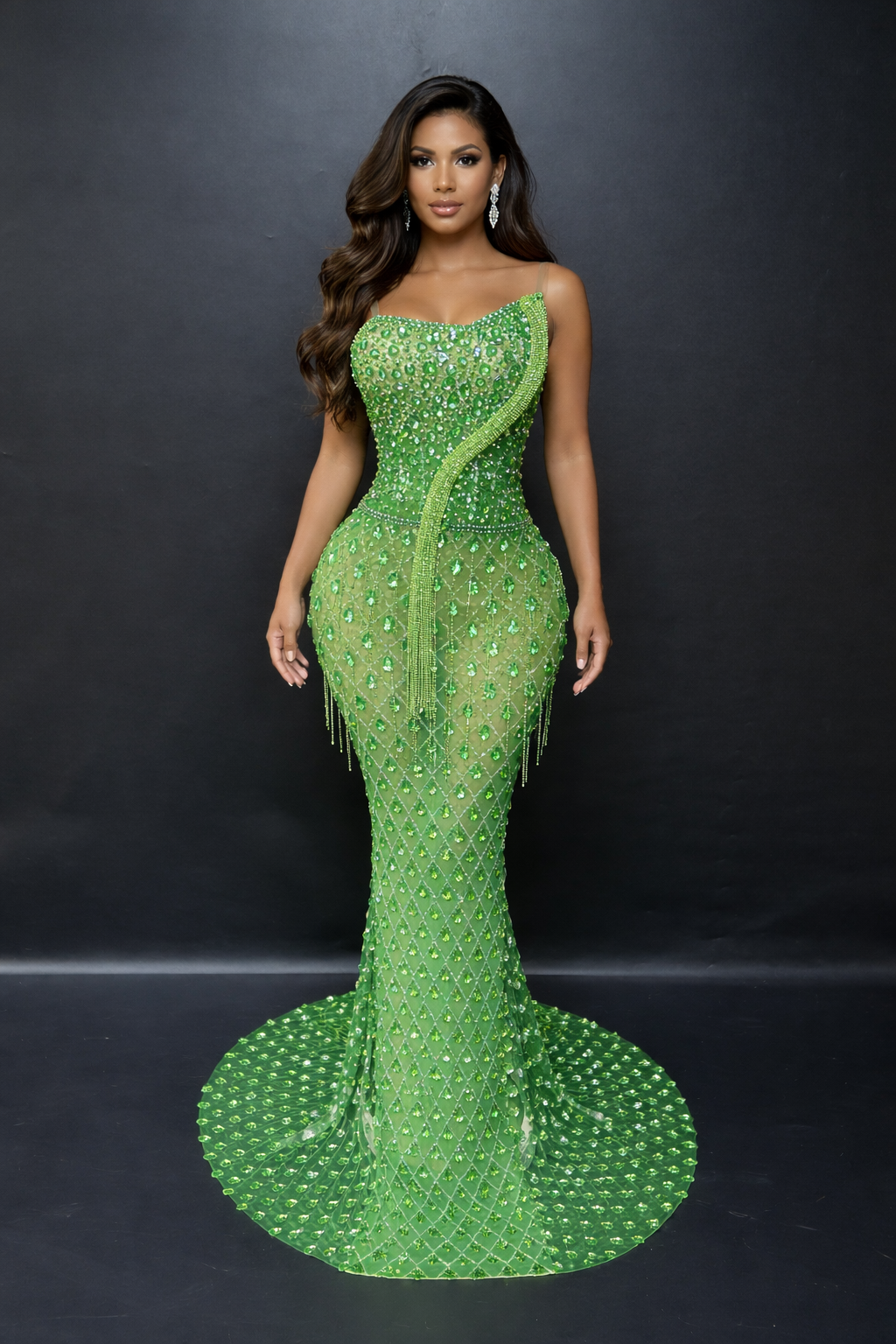 This elegant mermaid gown is designed to create a dramatic and unforgettable silhouette. Featuring a structured strapless neckline, the bodice is adorned with intricate rhinestone embellishments that flow into a sculpted draped detail across the front. The fitted design highlights natural curves before extending into a flared mermaid hem with delicate beaded fringe accents that add movement and sparkle.