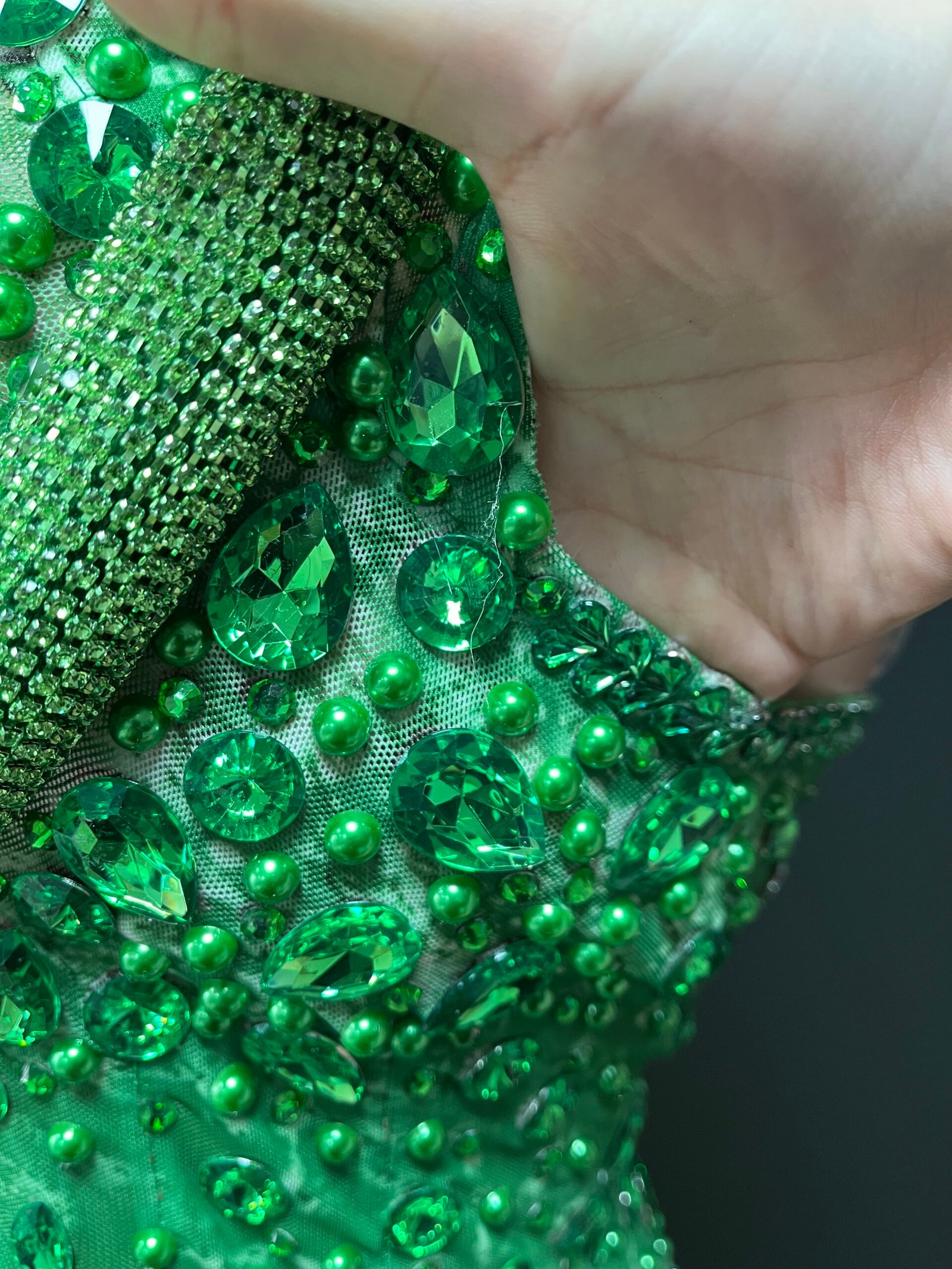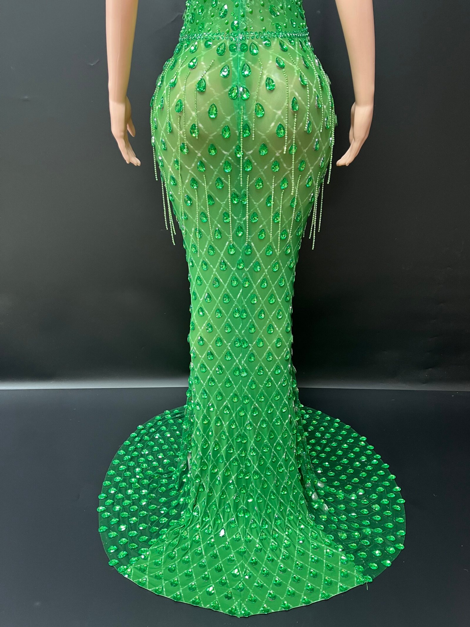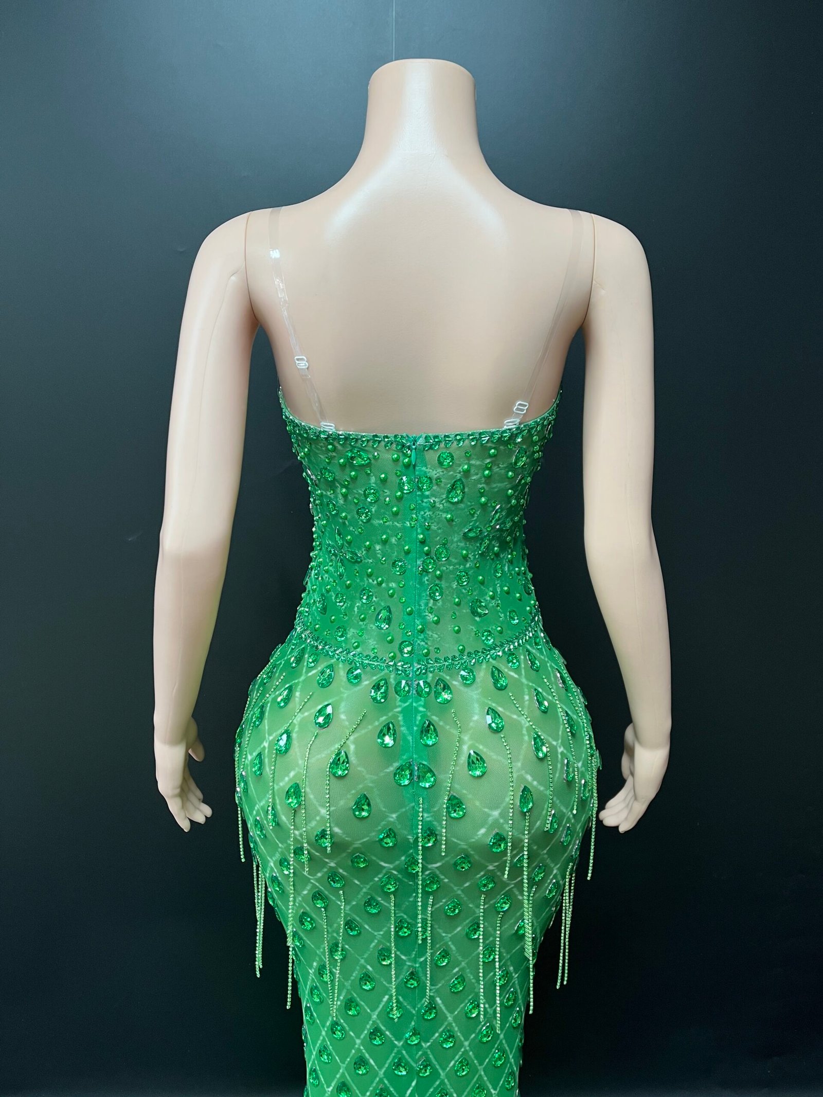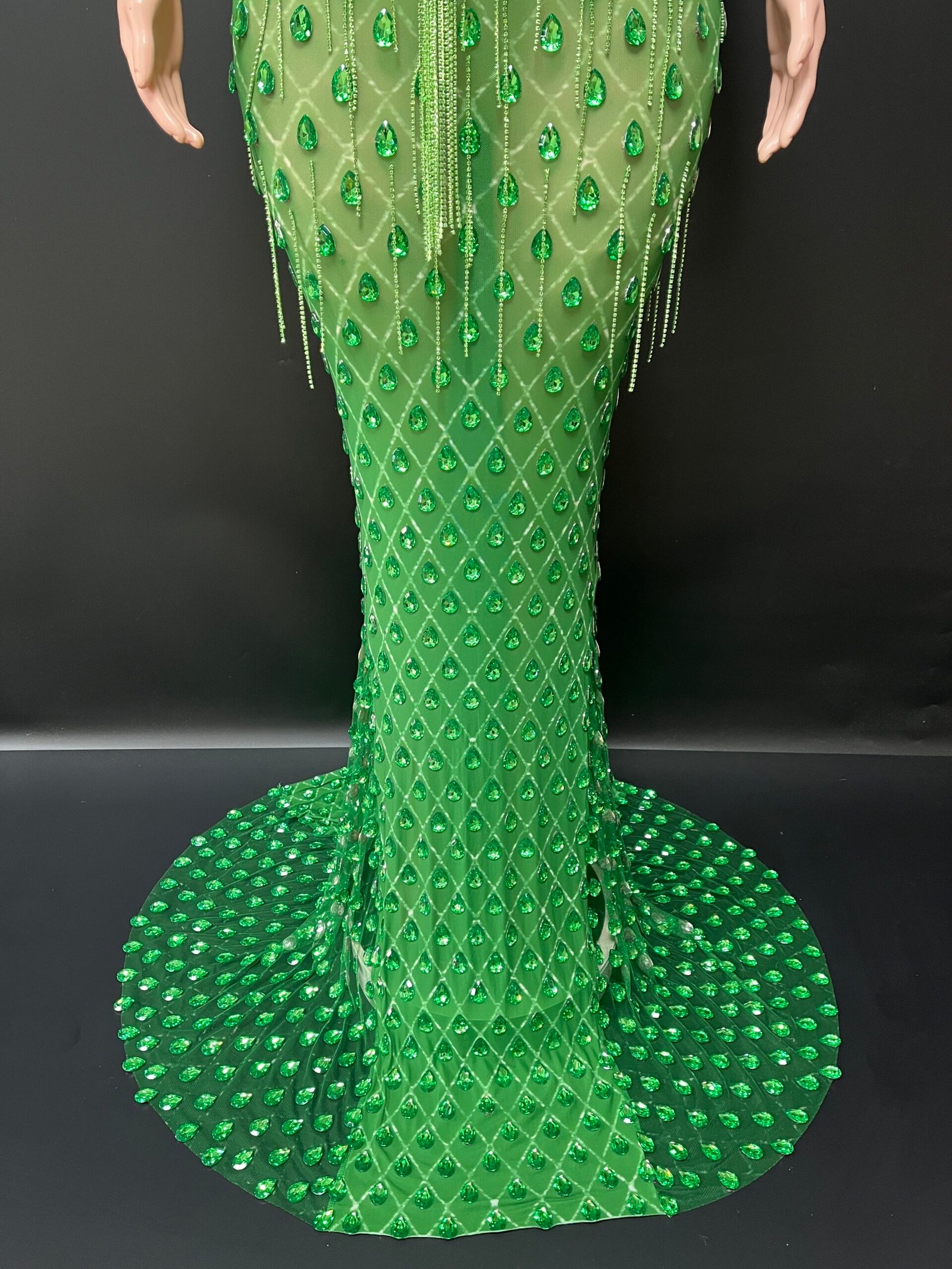 This elegant mermaid gown is designed to create a dramatic and unforgettable silhouette. Featuring a structured strapless neckline, the bodice is adorned with intricate rhinestone embellishments that flow into a sculpted draped detail across the front. The fitted design highlights natural curves before extending into a flared mermaid hem with delicate beaded fringe accents that add movement and sparkle.