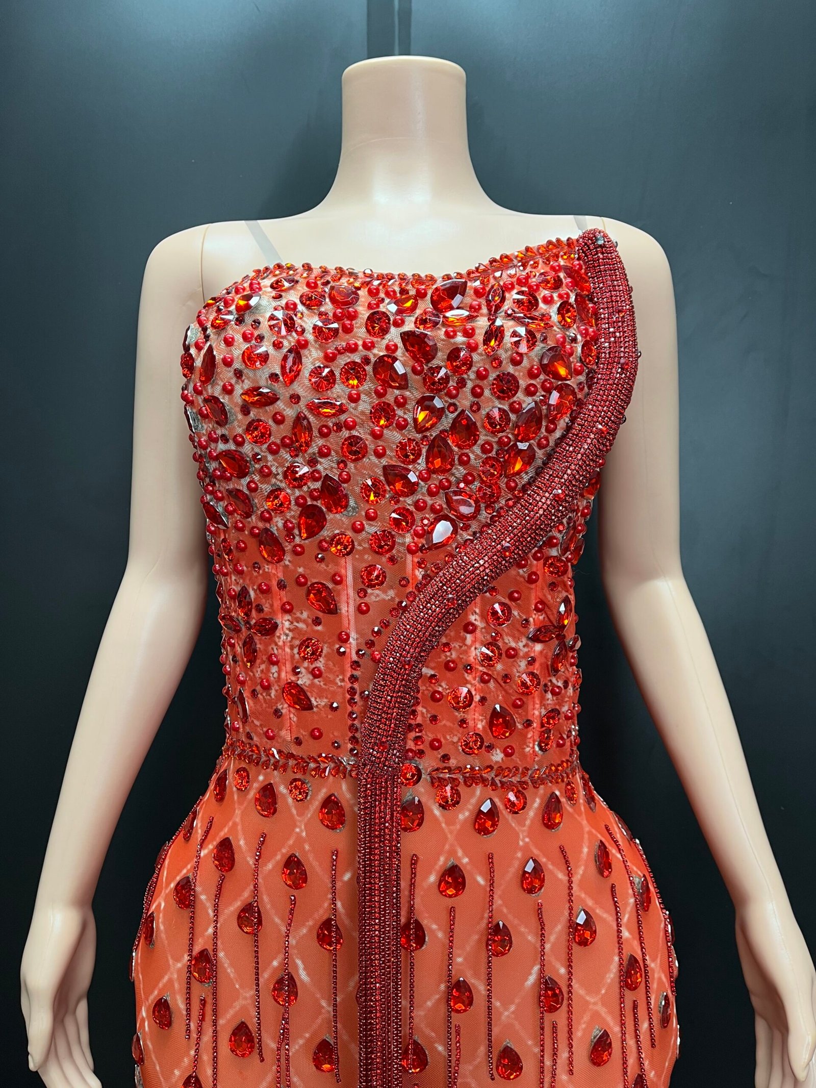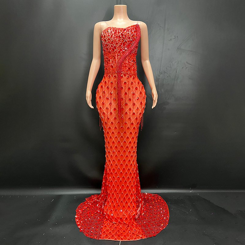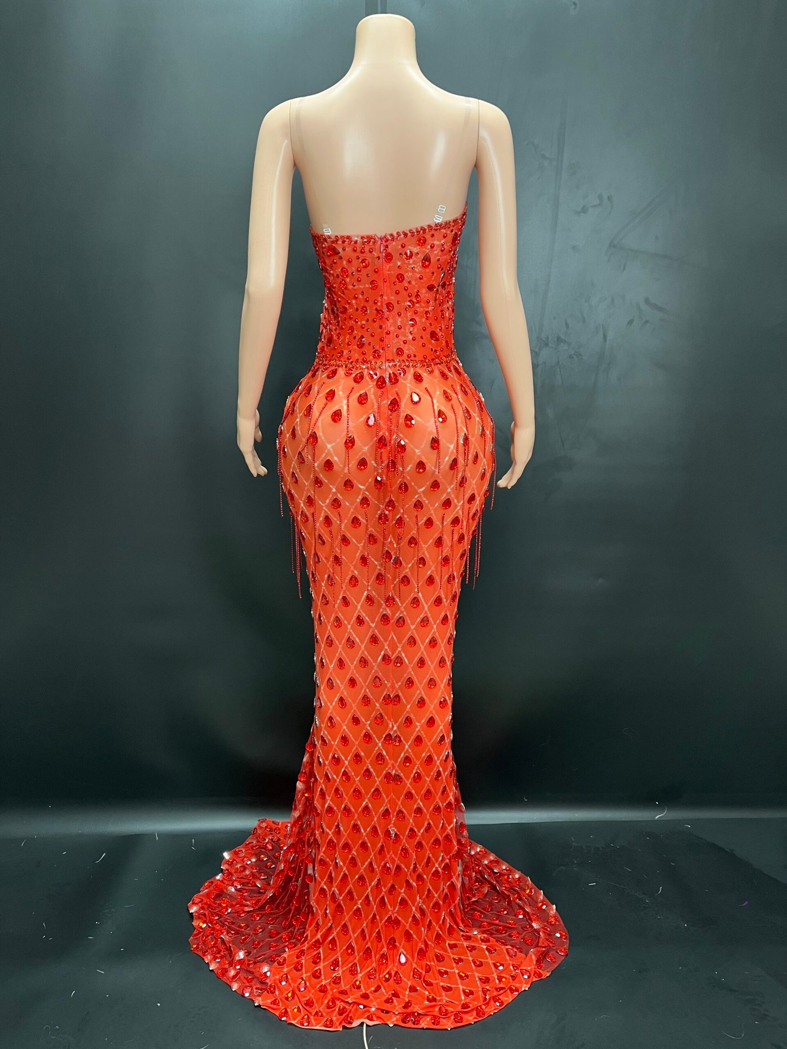 This elegant mermaid gown is designed to create a dramatic and unforgettable silhouette. Featuring a structured strapless neckline, the bodice is adorned with intricate rhinestone embellishments that flow into a sculpted draped detail across the front. The fitted design highlights natural curves before extending into a flared mermaid hem with delicate beaded fringe accents that add movement and sparkle.
