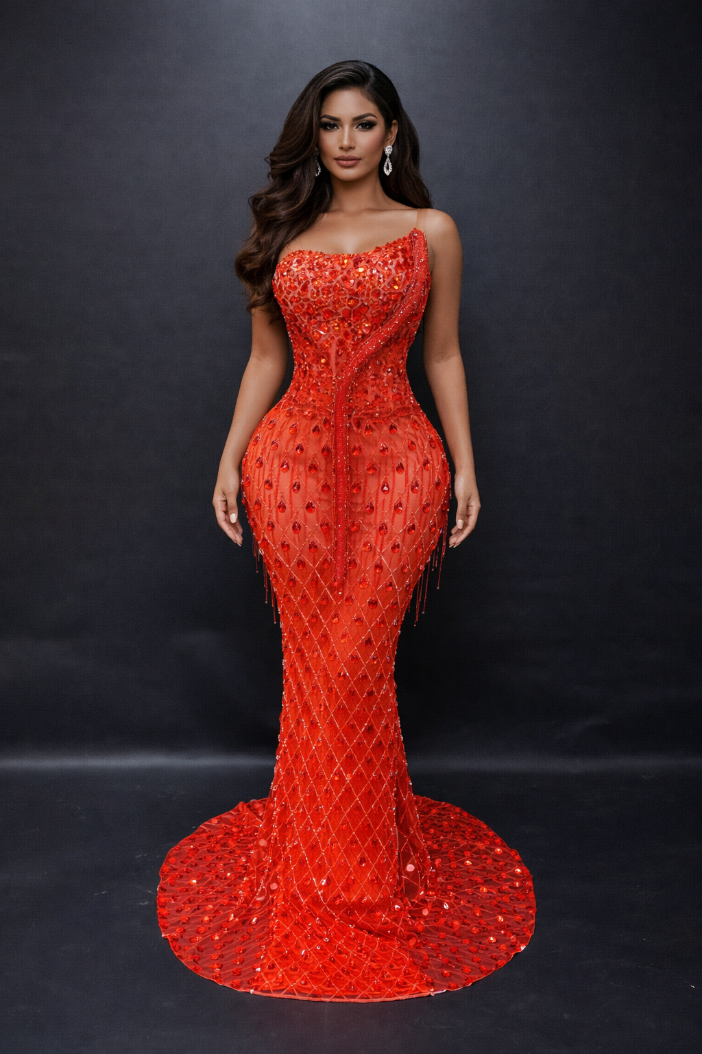 The combination of detailed embellishment, contouring structure, and a statement train gives this gown a couture-inspired finish, making it perfect for formal events, galas, and special occasions.