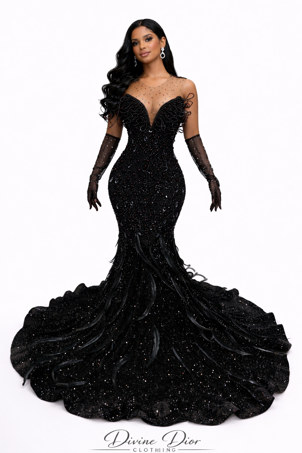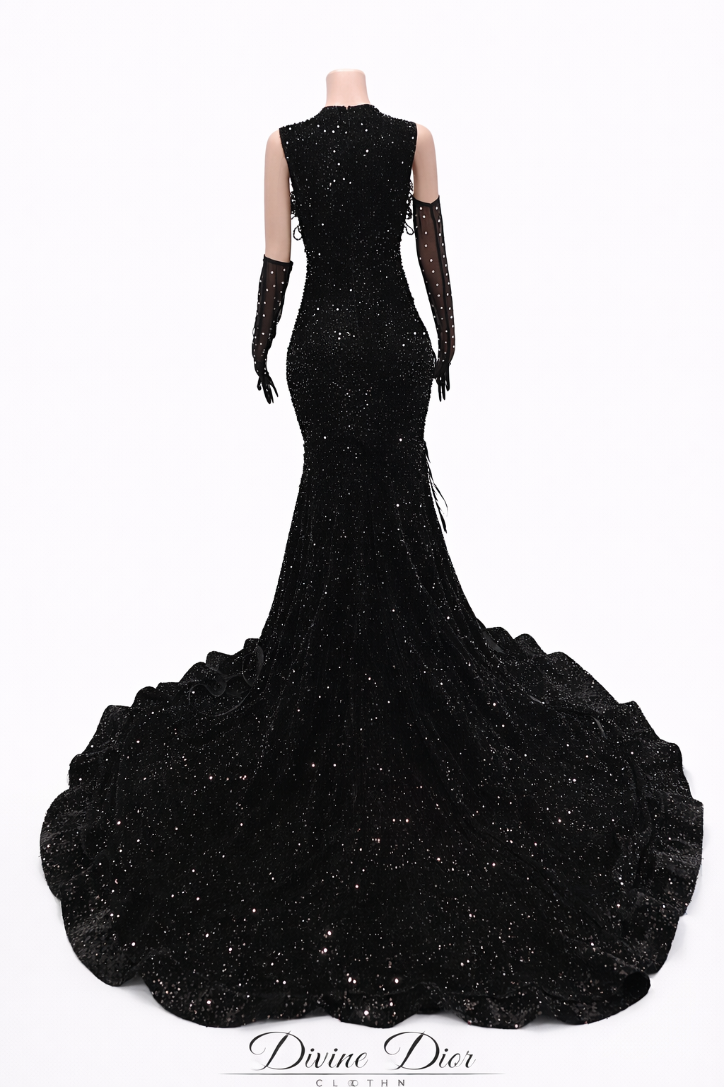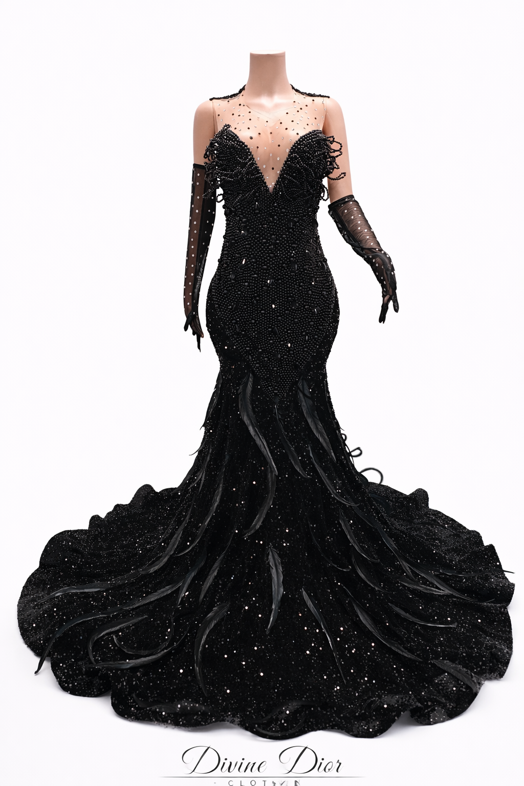 The sculpted mermaid cut contours the body before flowing into a dramatic, floor-sweeping finish that delivers unforgettable movement with every step. Intricate crystal embellishments shimmer from every angle, catching the light in a way that feels both powerful and refined. The illusion detailing adds depth and elegance, while the statement gloves complete the look with elevated sophistication.